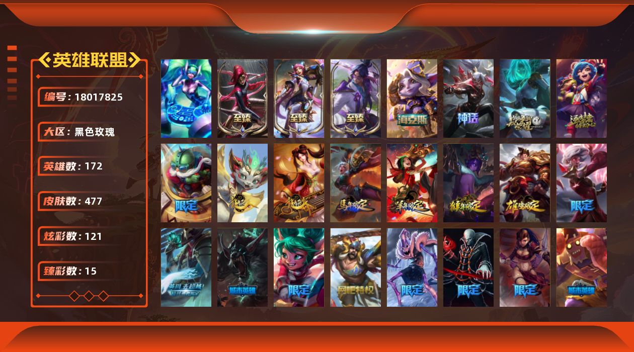 铂金段位-172英雄-477皮肤-121炫彩-1终极-8神话-91限定-41传说-121史诗