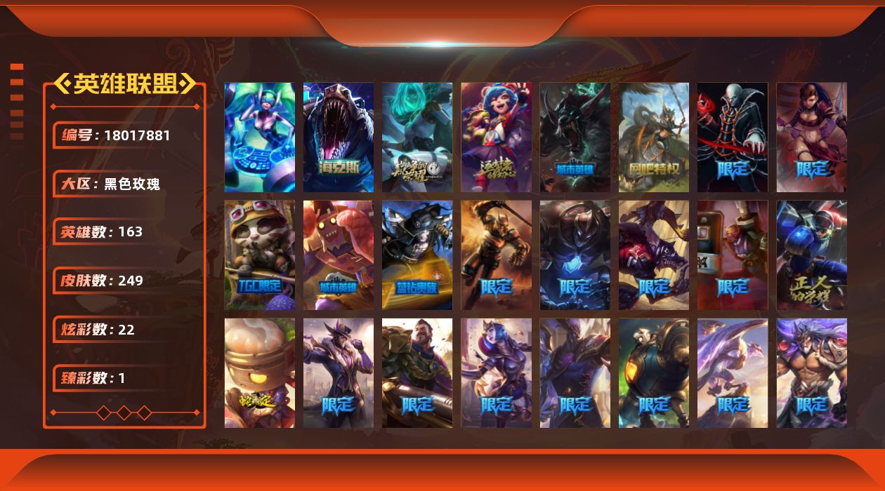 [18017881]【店主推荐捡漏号】白银段位-163英雄-249皮肤-22炫彩-1终极-3神话-41限定-24传说-55史诗