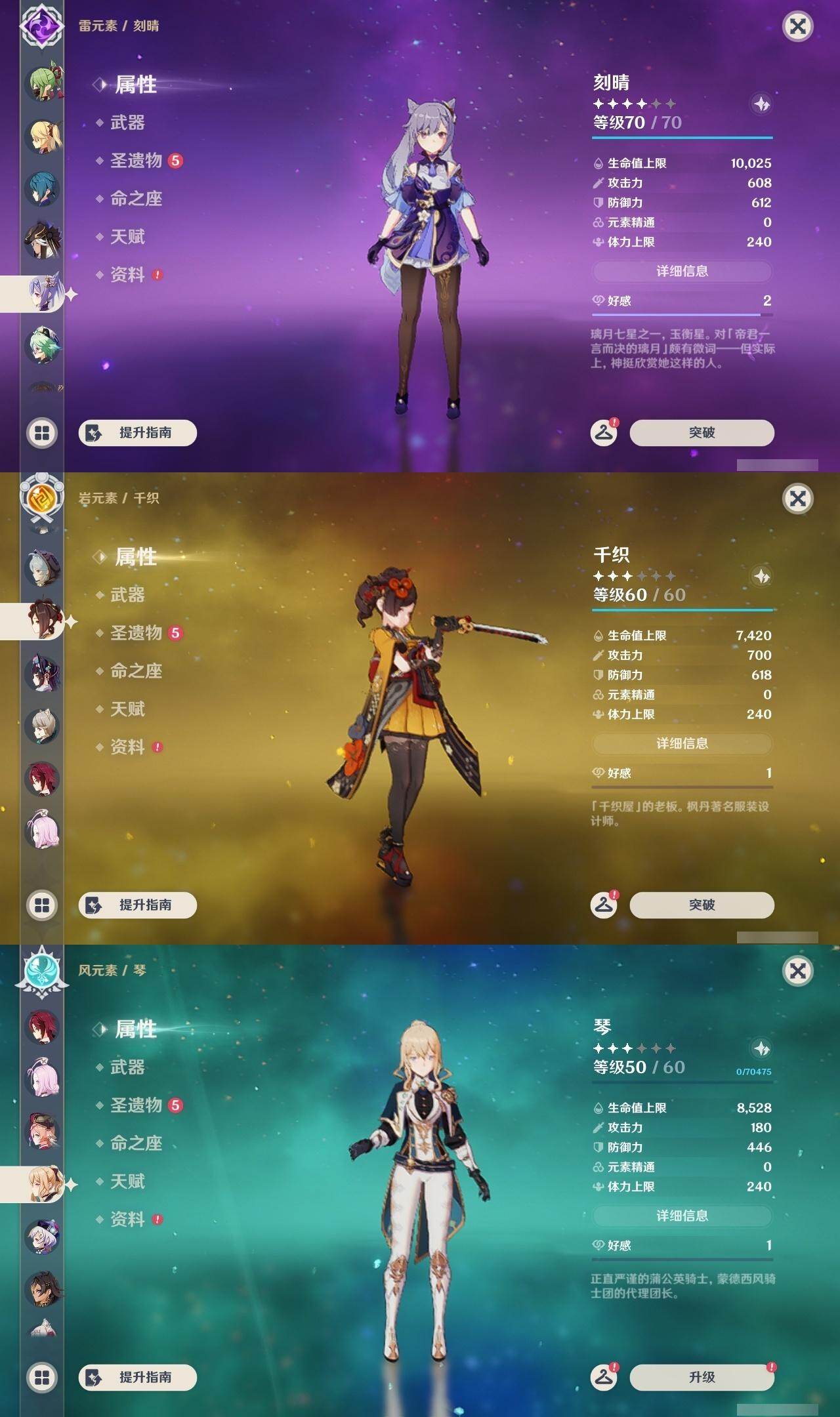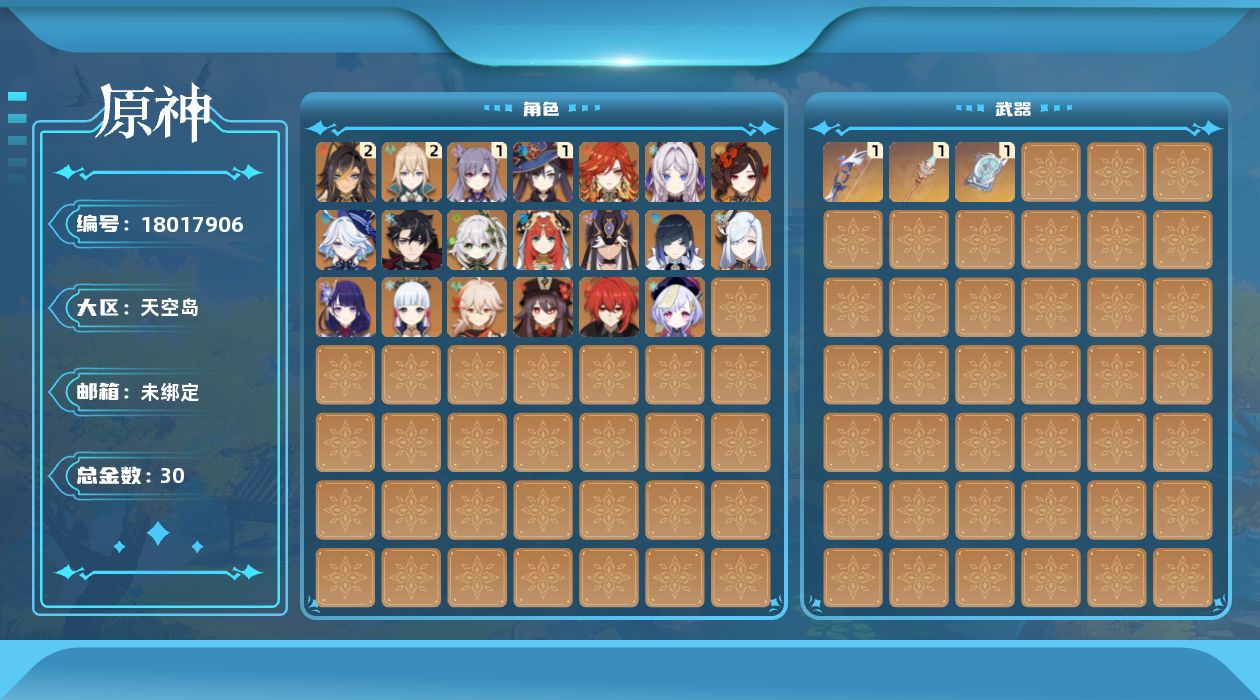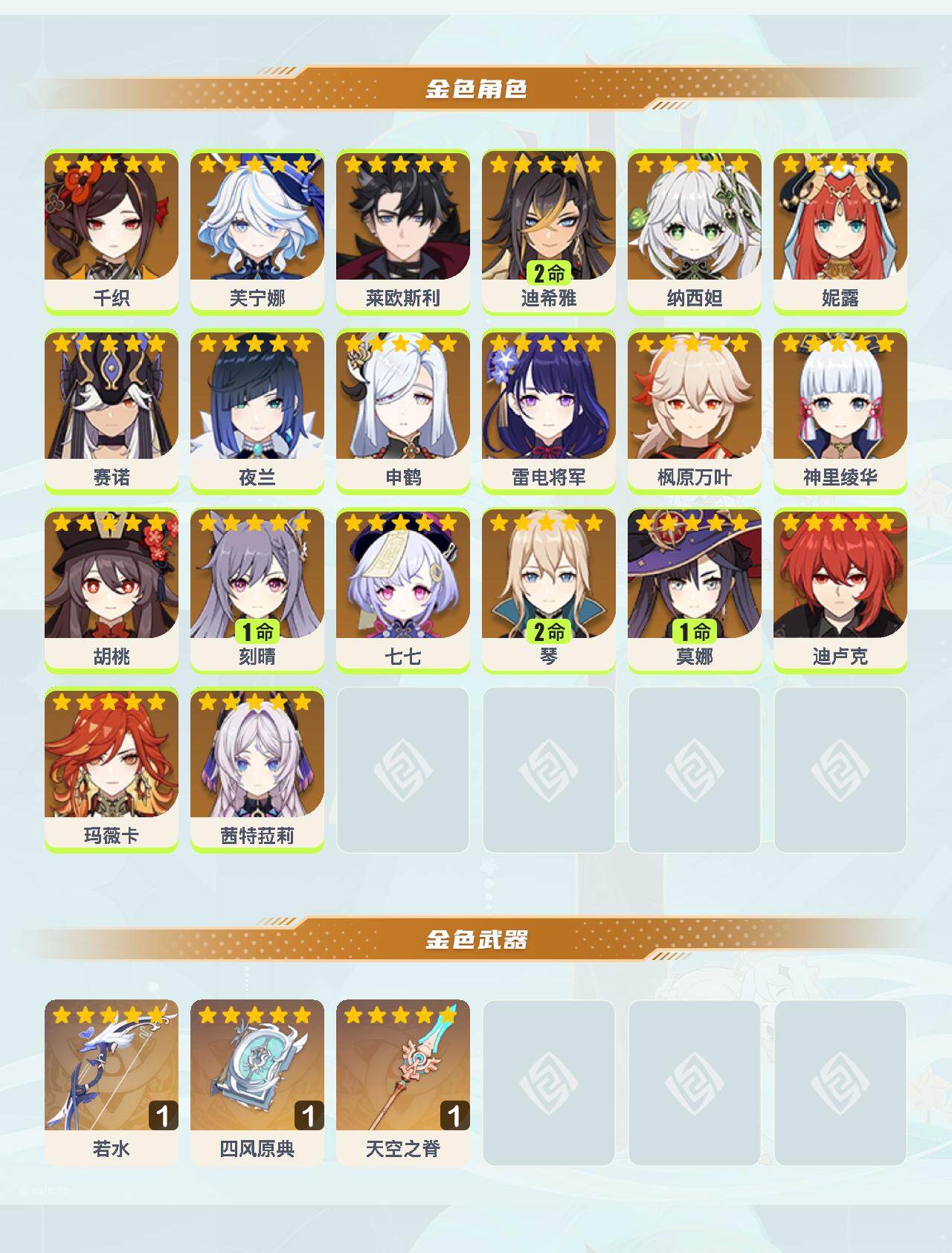 0命千织,0命芙宁娜,0命莱欧斯利,2命迪希雅,0命纳西妲,0命妮露,0命赛诺,0命夜兰,0命申鹤,0命雷电将军,0命枫原万叶,0命神里绫华,0命胡桃,1命刻晴,0命七七,2命琴,1命莫娜,0命迪卢克,0命玛薇卡,0命茜特菈莉,精1若水,精1四风原典,精1天空之脊