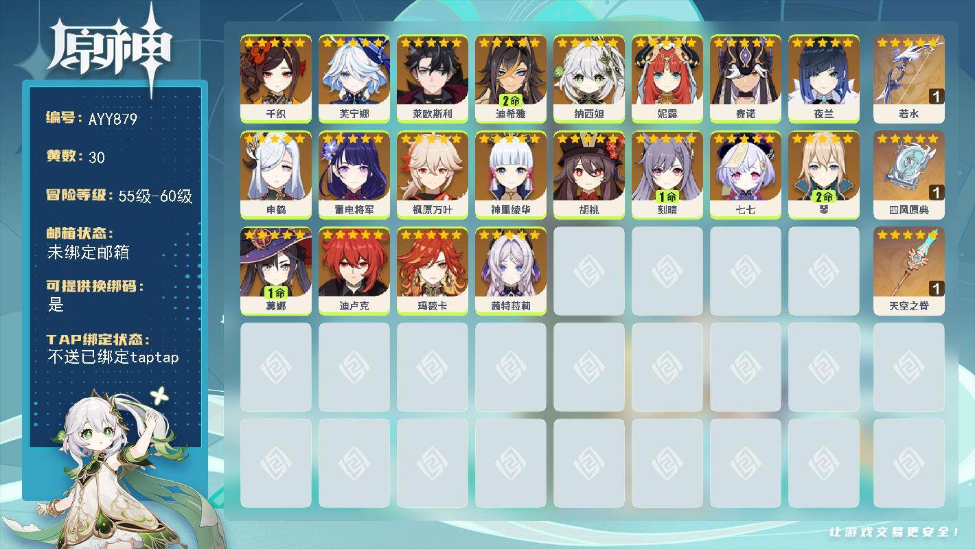 [18017906]【店主推荐捡漏号】59级/30黄/男主/20个五星角色/4个五星武器 0命千织,0命芙宁娜,0命莱欧斯利,2命迪希雅,0命纳西妲,0命妮露,0命赛诺,0命夜兰,0命申鹤,0命雷电将军,0命枫原万叶,0命神里绫华,0命胡桃,1命刻晴,0命七七,2命琴,1命莫娜,0命迪卢克,0命玛薇卡,0命茜特菈莉,精1若水,精1四风原典,精1天空之脊