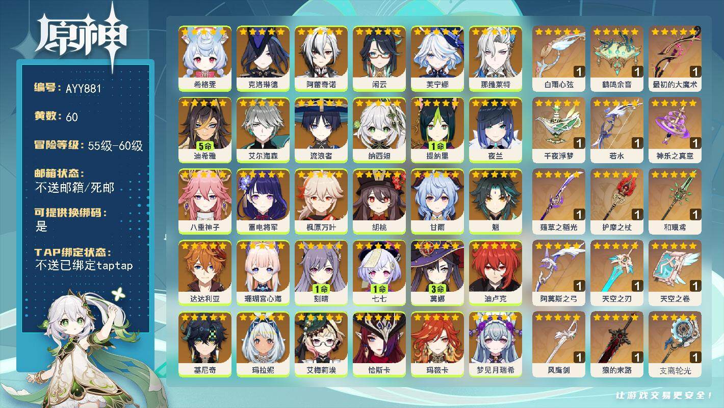 [18017913]【店主推荐捡漏号】60级/60黄/男主/33个五星角色/16个五星武器 0命希格雯,0命克洛琳德,0命阿蕾奇诺,0命闲云,0命芙宁娜,0命那维莱特,5命迪希雅,0命艾尔海森,0命流浪者,0命纳西妲,1命提纳里,0命夜兰,0命八重神子,0命雷电将军,0命枫原万叶,0命胡桃,0命甘雨,0命魈,0命达达利亚,0命珊瑚宫心海,1命刻晴,1命七七,3命莫娜,0命迪卢克,0命基尼奇,0命玛拉妮,0命艾梅莉埃,0命恰斯卡,0命玛薇卡,0命梦见月瑞希,0命丝柯克,0命奈芙尔,0命哥伦比娅,精1白雨心弦,精1鹤鸣余音,精1最初的大魔术,精1千夜浮梦,精1若水,精1神乐之真意,精1薙草之稻光,精1护摩之杖,精1和璞鸢,精1阿莫斯之弓,精1天空之刃,精1天空之卷,精1风鹰剑,精1狼的末路,精1支离轮光