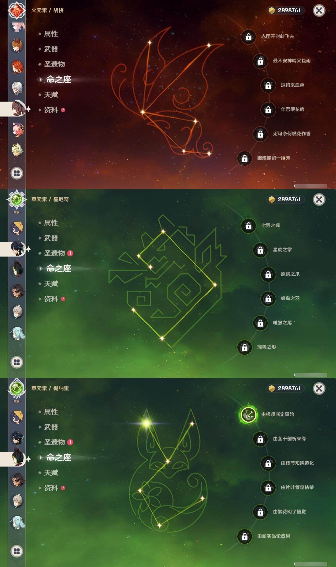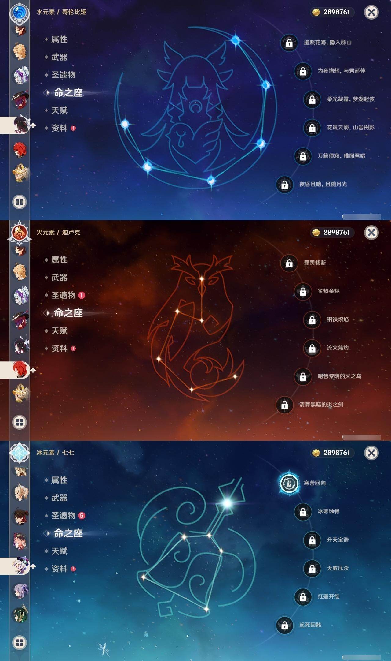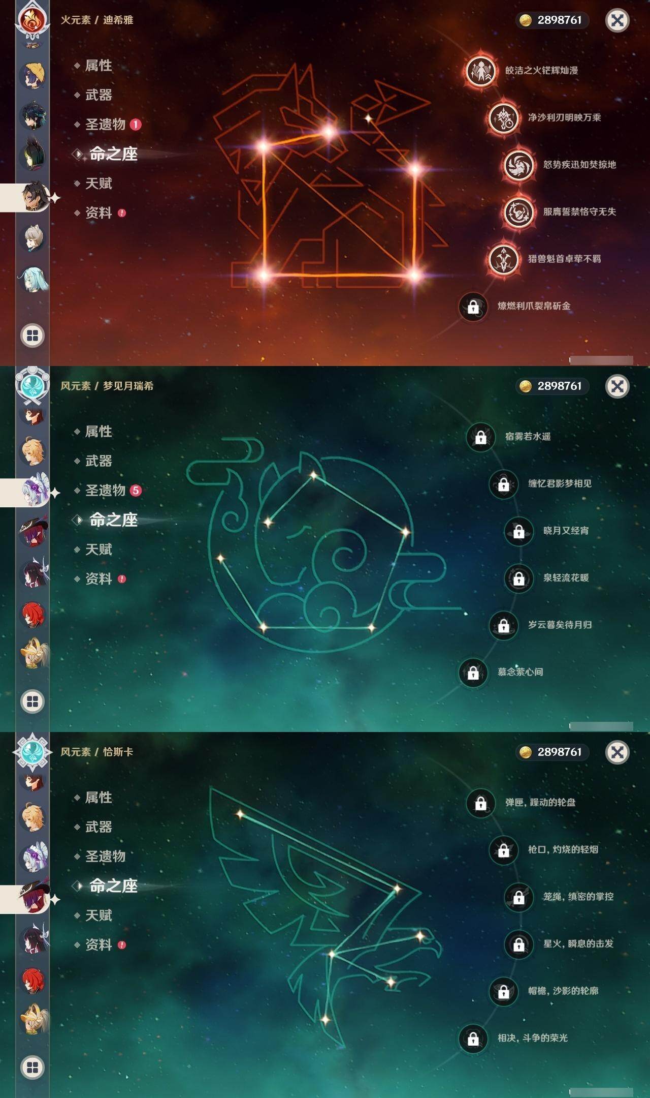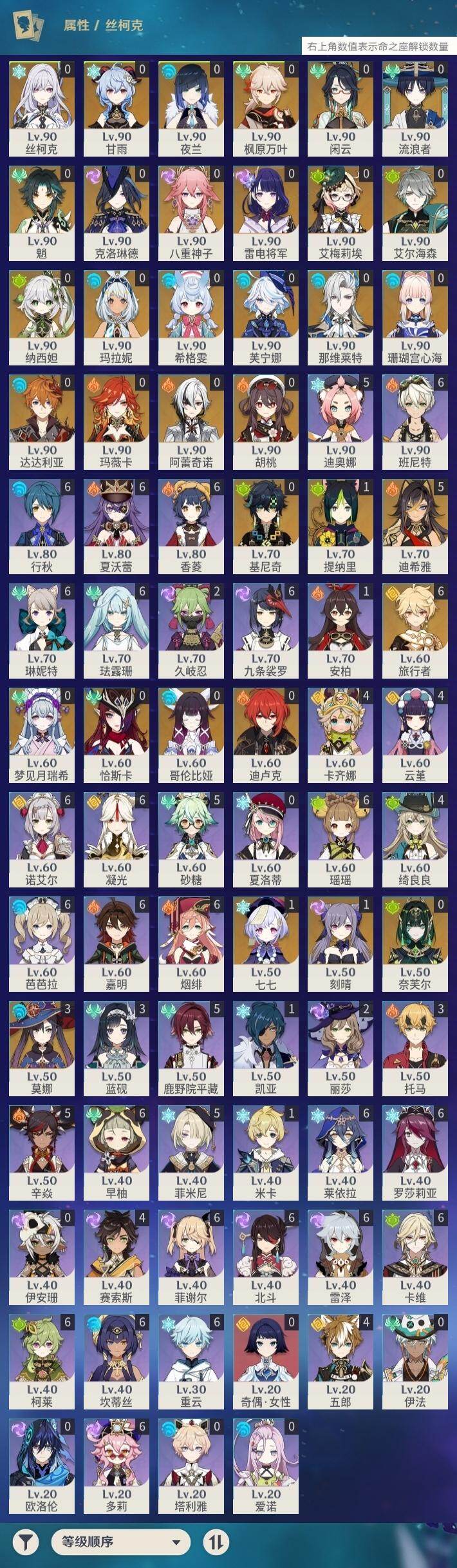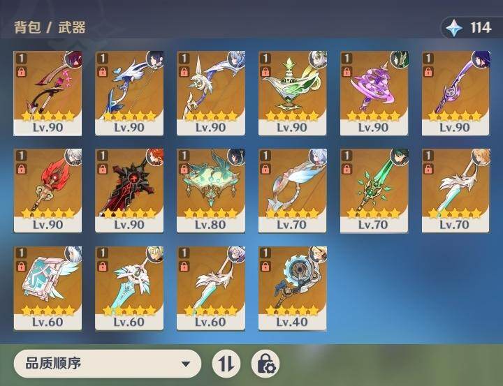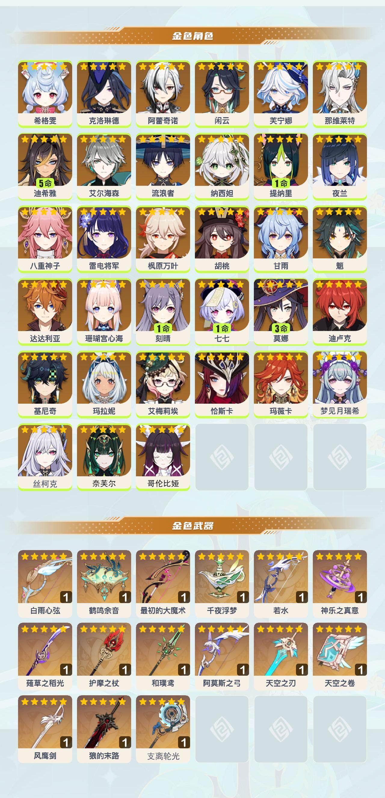 0命希格雯,0命克洛琳德,0命阿蕾奇诺,0命闲云,0命芙宁娜,0命那维莱特,5命迪希雅,0命艾尔海森,0命流浪者,0命纳西妲,1命提纳里,0命夜兰,0命八重神子,0命雷电将军,0命枫原万叶,0命胡桃,0命甘雨,0命魈,0命达达利亚,0命珊瑚宫心海,1命刻晴,1命七七,3命莫娜,0命迪卢克,0命基尼奇,0命玛拉妮,0命艾梅莉埃,0命恰斯卡,0命玛薇卡,0命梦见月瑞希,0命丝柯克,0命奈芙尔,0命哥伦比娅,精1白雨心弦,精1鹤鸣余音,精1最初的大魔术,精1千夜浮梦,精1若水,精1神乐之真意,精1薙草之稻光,精1护摩之杖,精1和璞鸢,精1阿莫斯之弓,精1天空之刃,精1天空之卷,精1风鹰剑,精1狼的末路,精1支离轮光