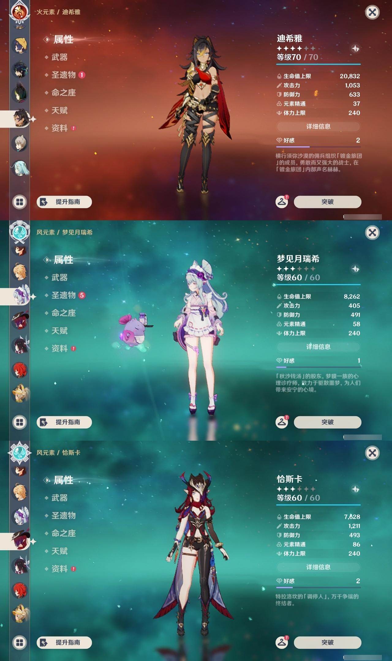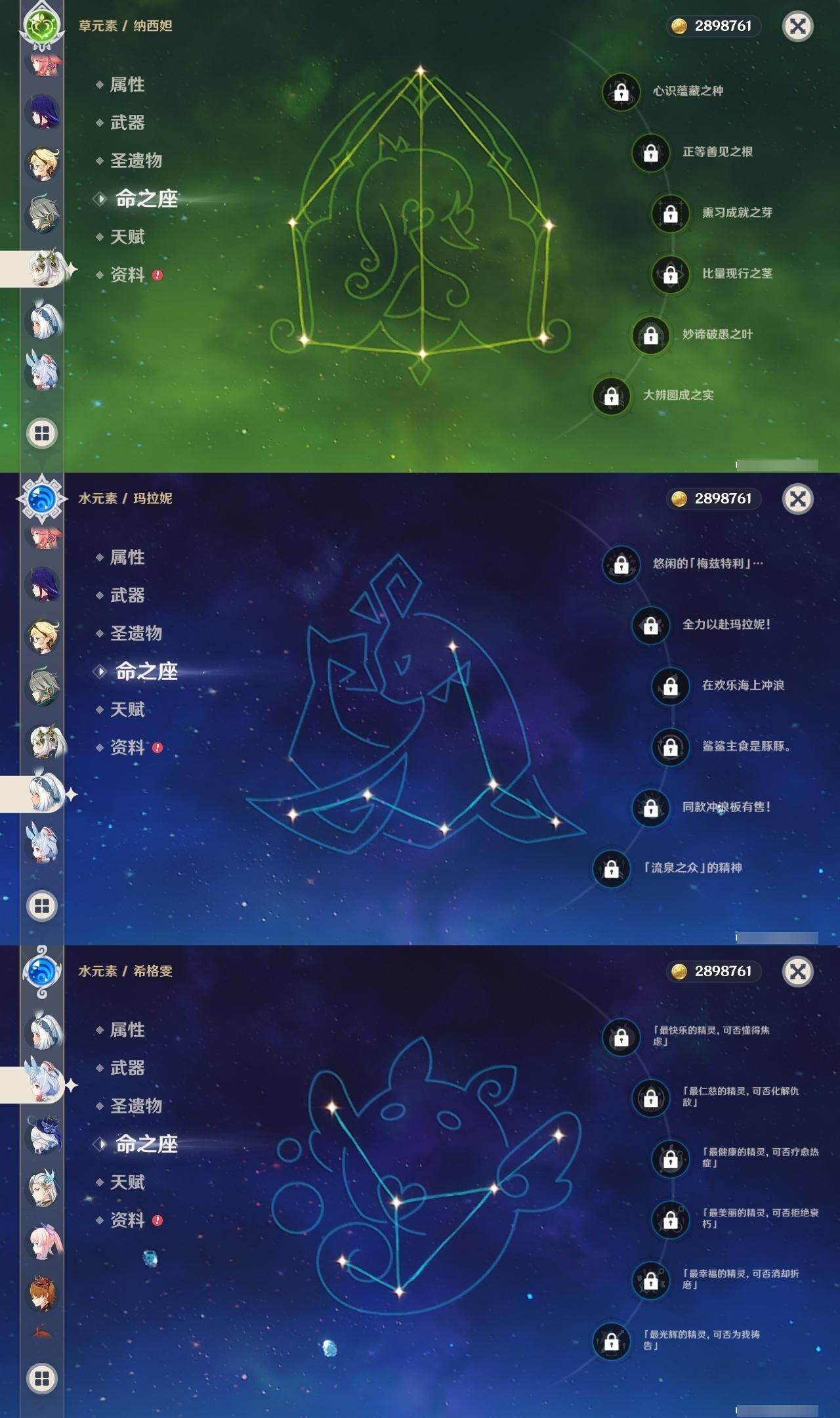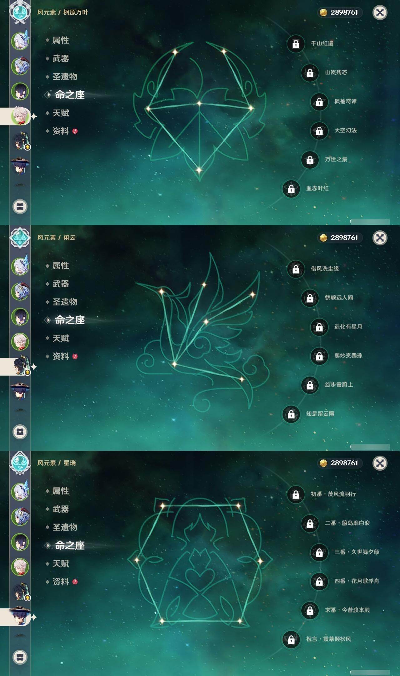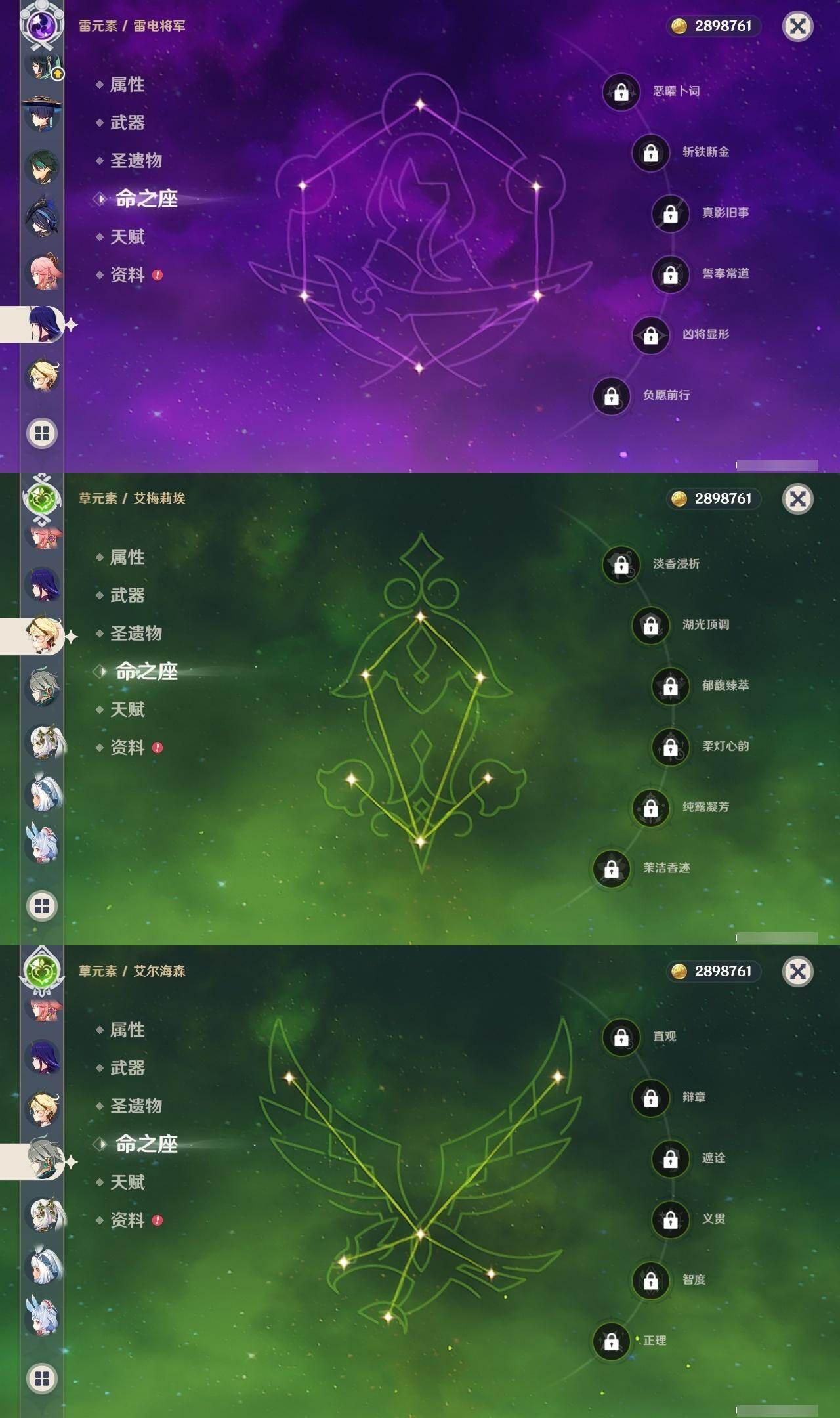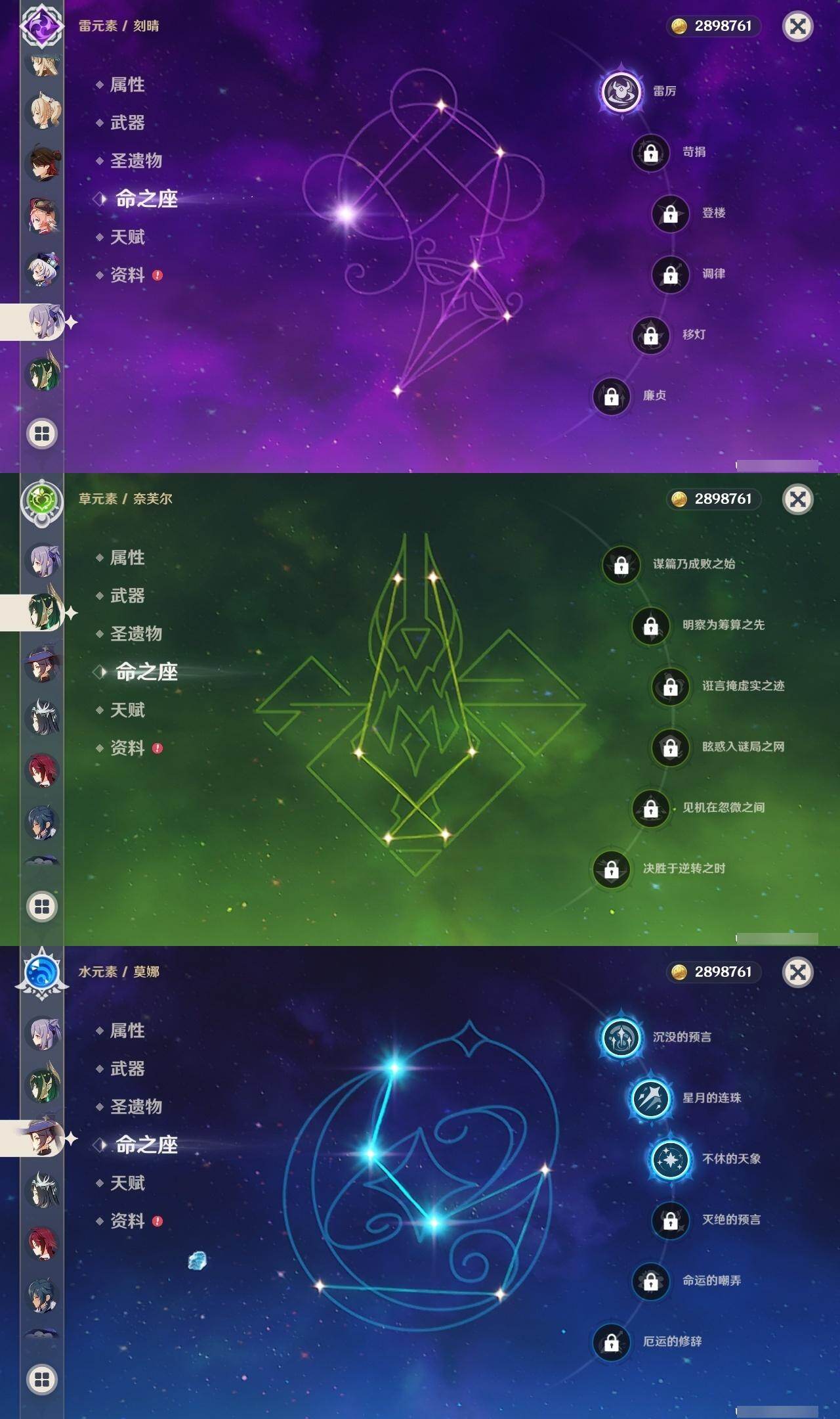 0命希格雯,0命克洛琳德,0命阿蕾奇诺,0命闲云,0命芙宁娜,0命那维莱特,5命迪希雅,0命艾尔海森,0命流浪者,0命纳西妲,1命提纳里,0命夜兰,0命八重神子,0命雷电将军,0命枫原万叶,0命胡桃,0命甘雨,0命魈,0命达达利亚,0命珊瑚宫心海,1命刻晴,1命七七,3命莫娜,0命迪卢克,0命基尼奇,0命玛拉妮,0命艾梅莉埃,0命恰斯卡,0命玛薇卡,0命梦见月瑞希,0命丝柯克,0命奈芙尔,0命哥伦比娅,精1白雨心弦,精1鹤鸣余音,精1最初的大魔术,精1千夜浮梦,精1若水,精1神乐之真意,精1薙草之稻光,精1护摩之杖,精1和璞鸢,精1阿莫斯之弓,精1天空之刃,精1天空之卷,精1风鹰剑,精1狼的末路,精1支离轮光