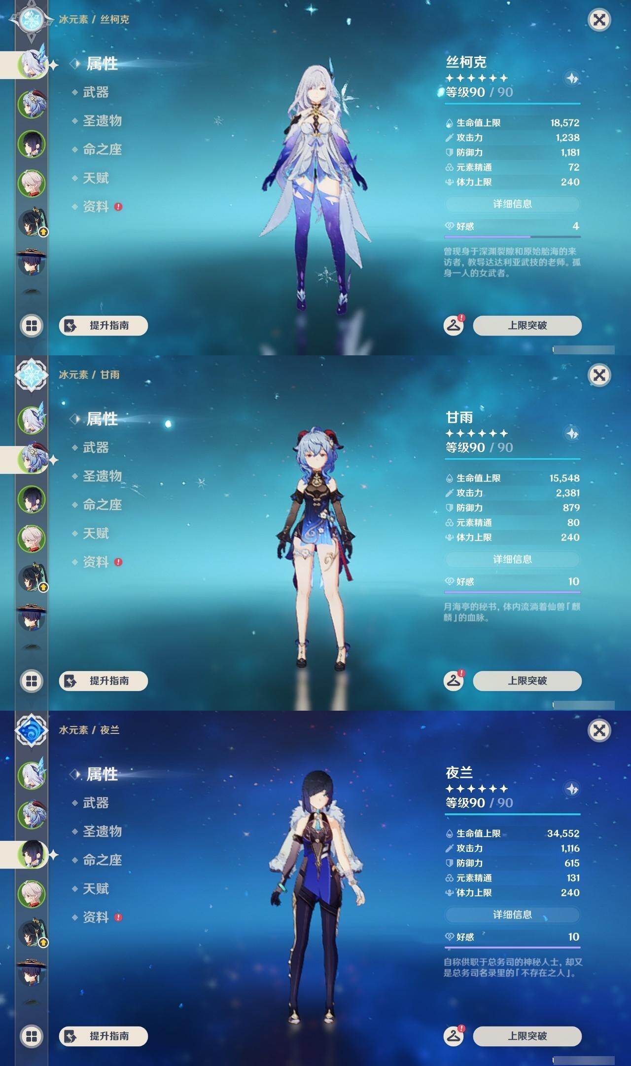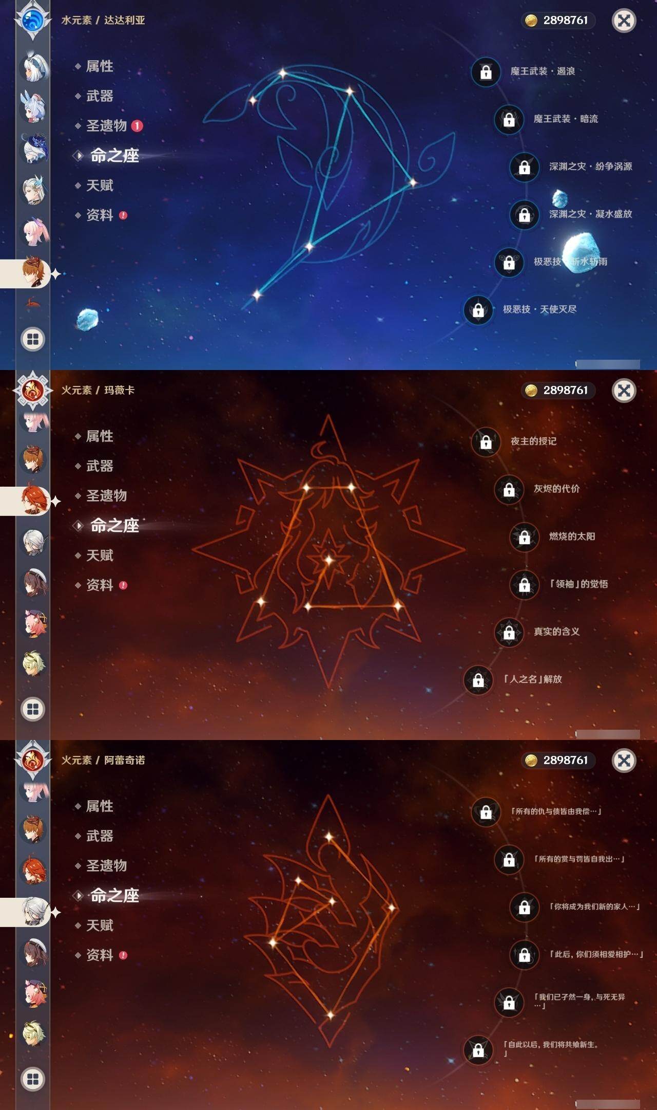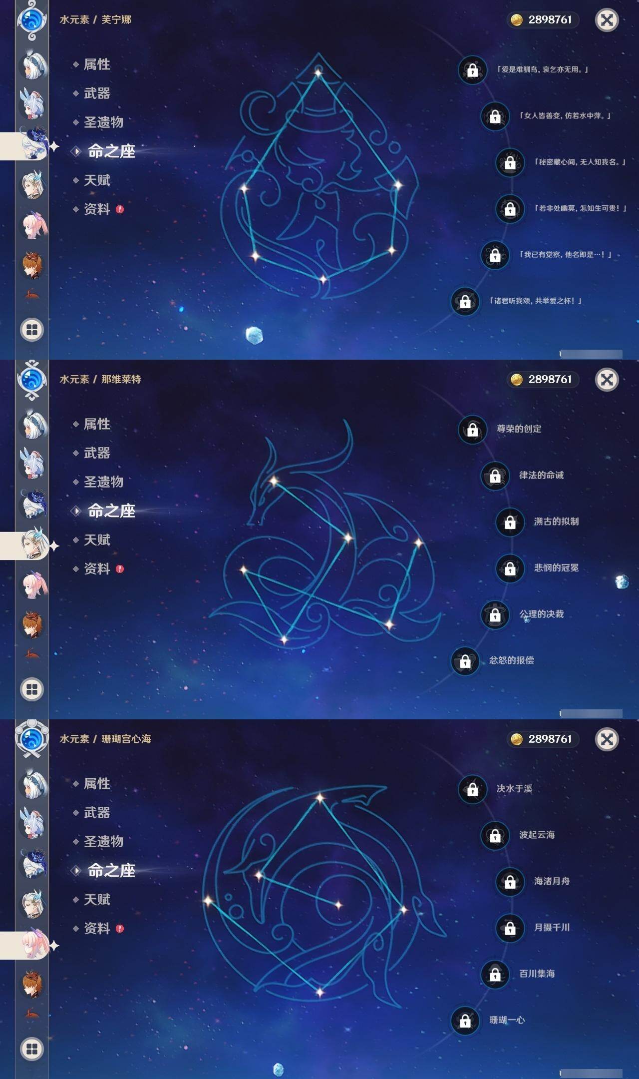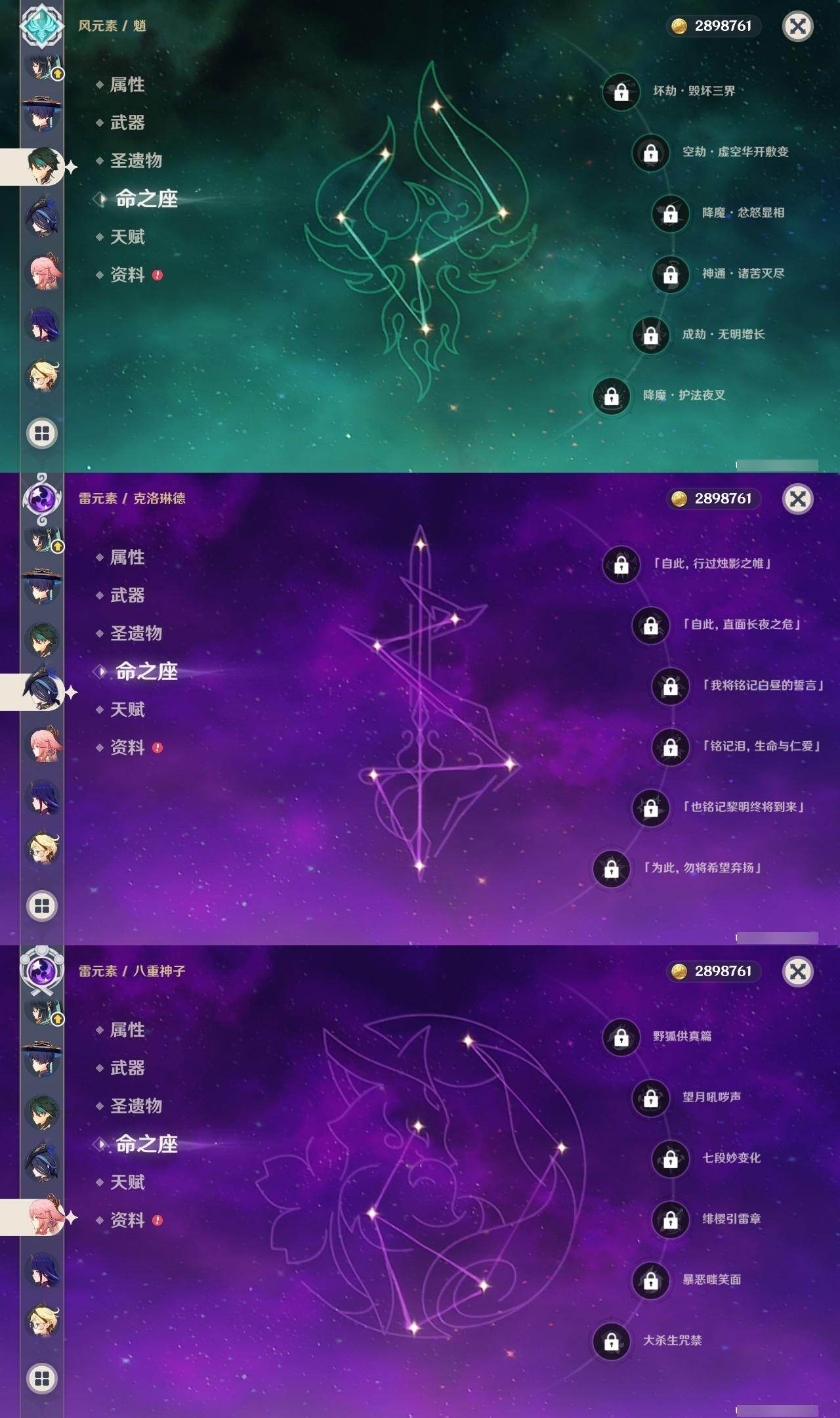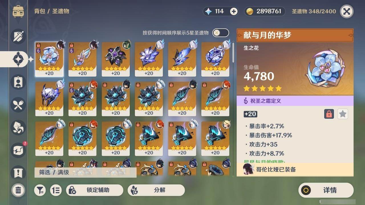 0命希格雯,0命克洛琳德,0命阿蕾奇诺,0命闲云,0命芙宁娜,0命那维莱特,5命迪希雅,0命艾尔海森,0命流浪者,0命纳西妲,1命提纳里,0命夜兰,0命八重神子,0命雷电将军,0命枫原万叶,0命胡桃,0命甘雨,0命魈,0命达达利亚,0命珊瑚宫心海,1命刻晴,1命七七,3命莫娜,0命迪卢克,0命基尼奇,0命玛拉妮,0命艾梅莉埃,0命恰斯卡,0命玛薇卡,0命梦见月瑞希,0命丝柯克,0命奈芙尔,0命哥伦比娅,精1白雨心弦,精1鹤鸣余音,精1最初的大魔术,精1千夜浮梦,精1若水,精1神乐之真意,精1薙草之稻光,精1护摩之杖,精1和璞鸢,精1阿莫斯之弓,精1天空之刃,精1天空之卷,精1风鹰剑,精1狼的末路,精1支离轮光