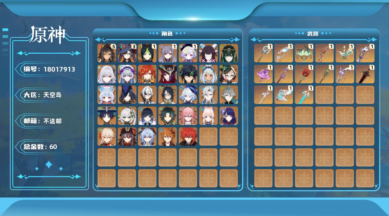 [18017913]【店主推荐捡漏号】60级/60黄/男主/33个五星角色/16个五星武器