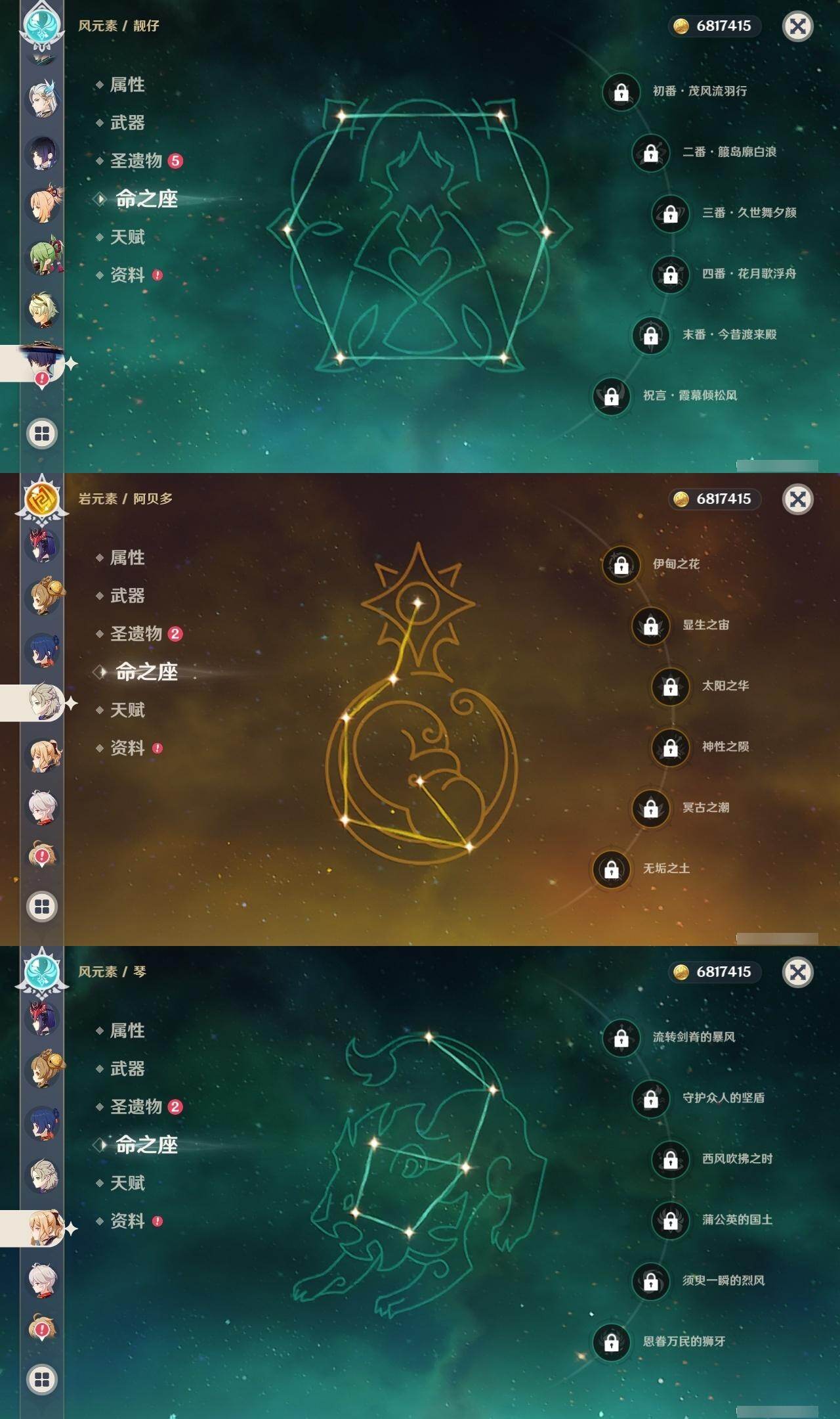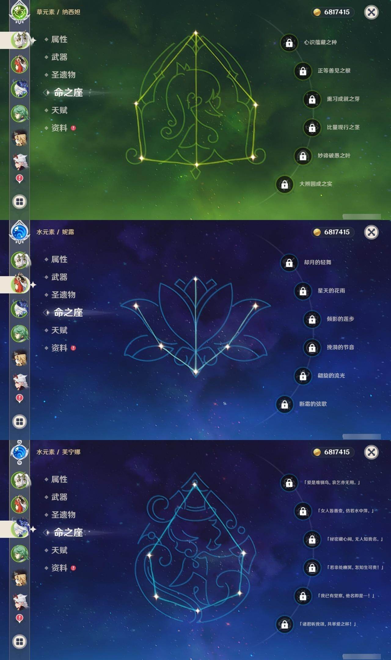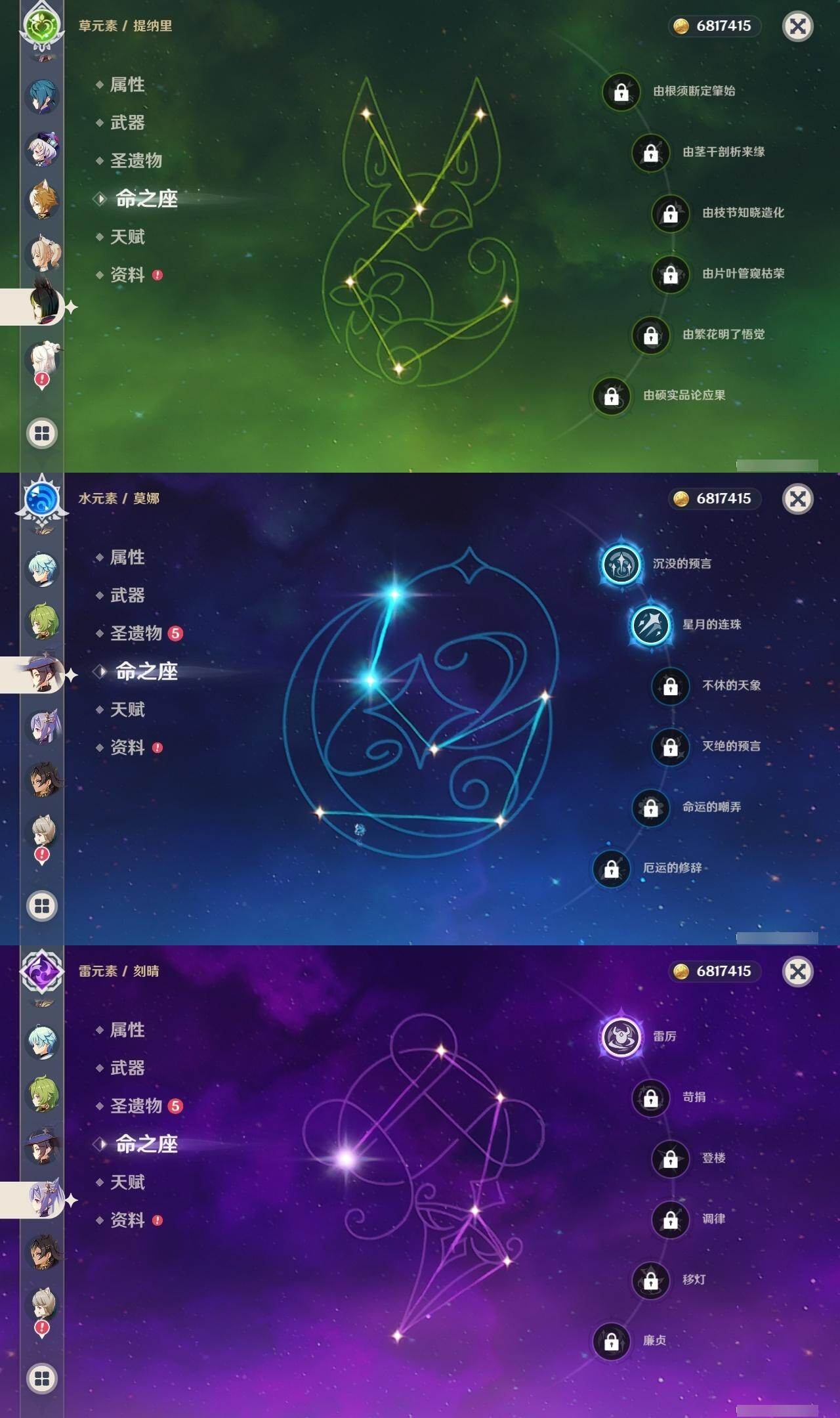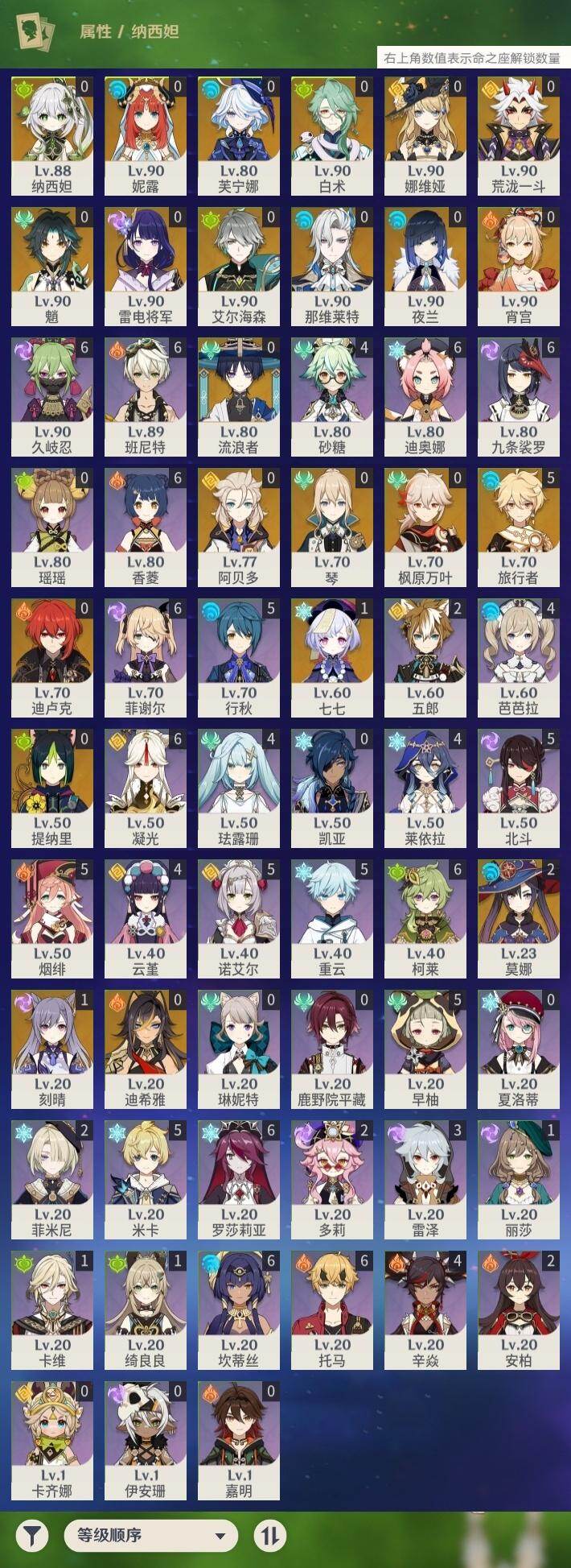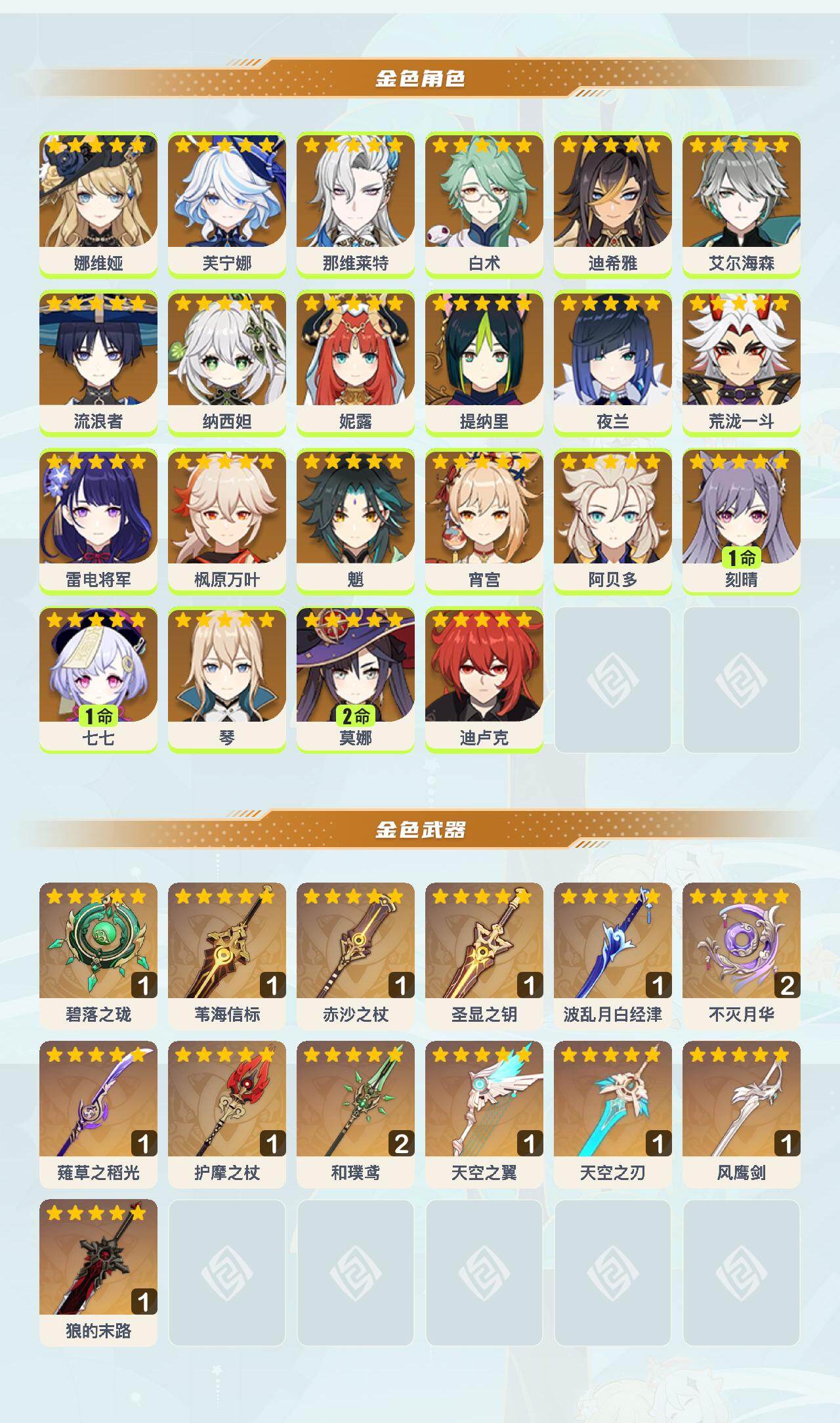 0命娜维娅,0命芙宁娜,0命那维莱特,0命白术,0命迪希雅,0命艾尔海森,0命流浪者,0命纳西妲,0命妮露,0命提纳里,0命夜兰,0命荒泷一斗,0命雷电将军,0命枫原万叶,0命魈,0命宵宫,0命阿贝多,1命刻晴,1命七七,0命琴,2命莫娜,0命迪卢克,精1碧落之珑,精1苇海信标,精1赤沙之杖,精1圣显之钥,精1波乱月白经津,精2不灭月华,精1薙草之稻光,精1护摩之杖,精2和璞鸢,精1天空之翼,精1天空之刃,精1风鹰剑,精1狼的末路