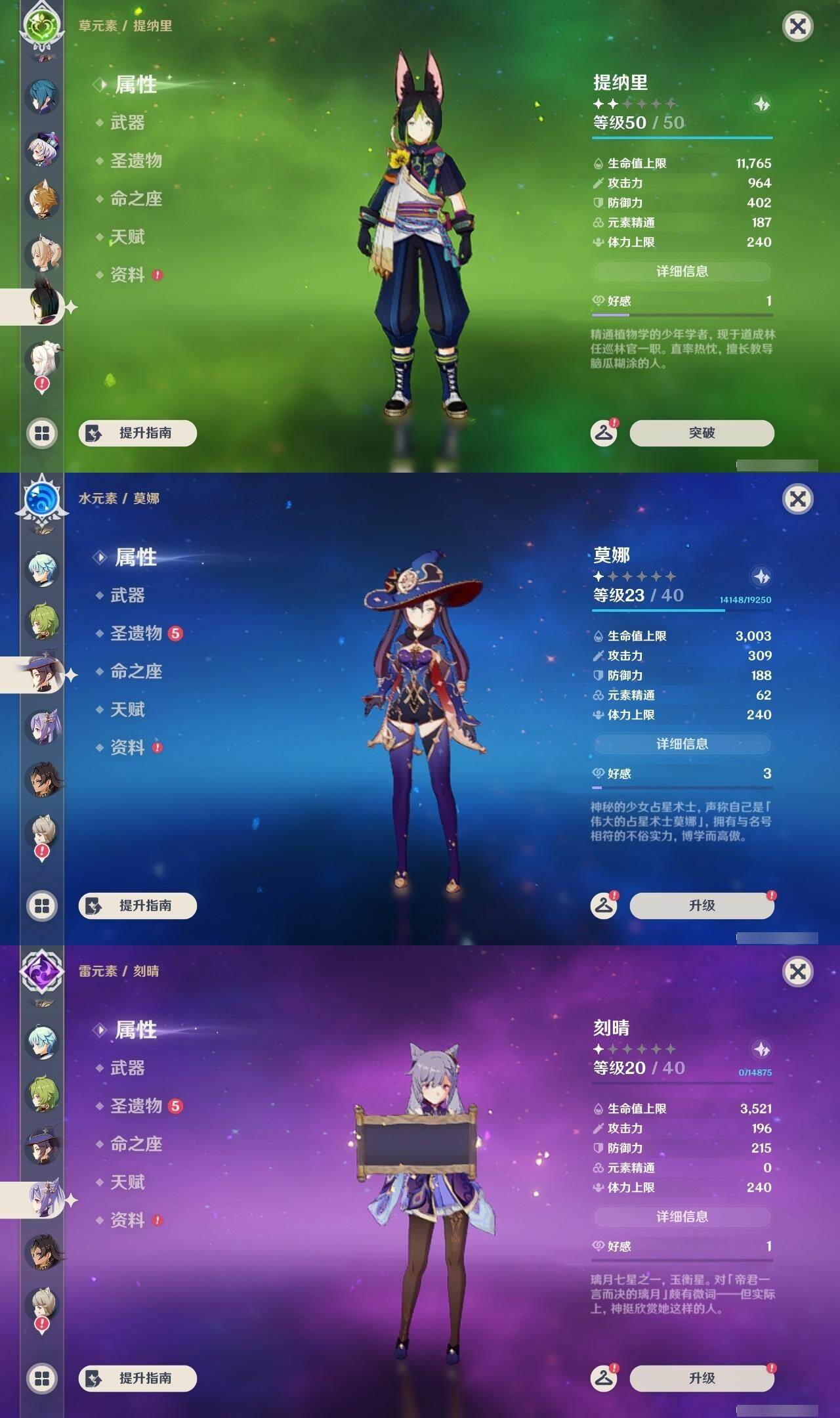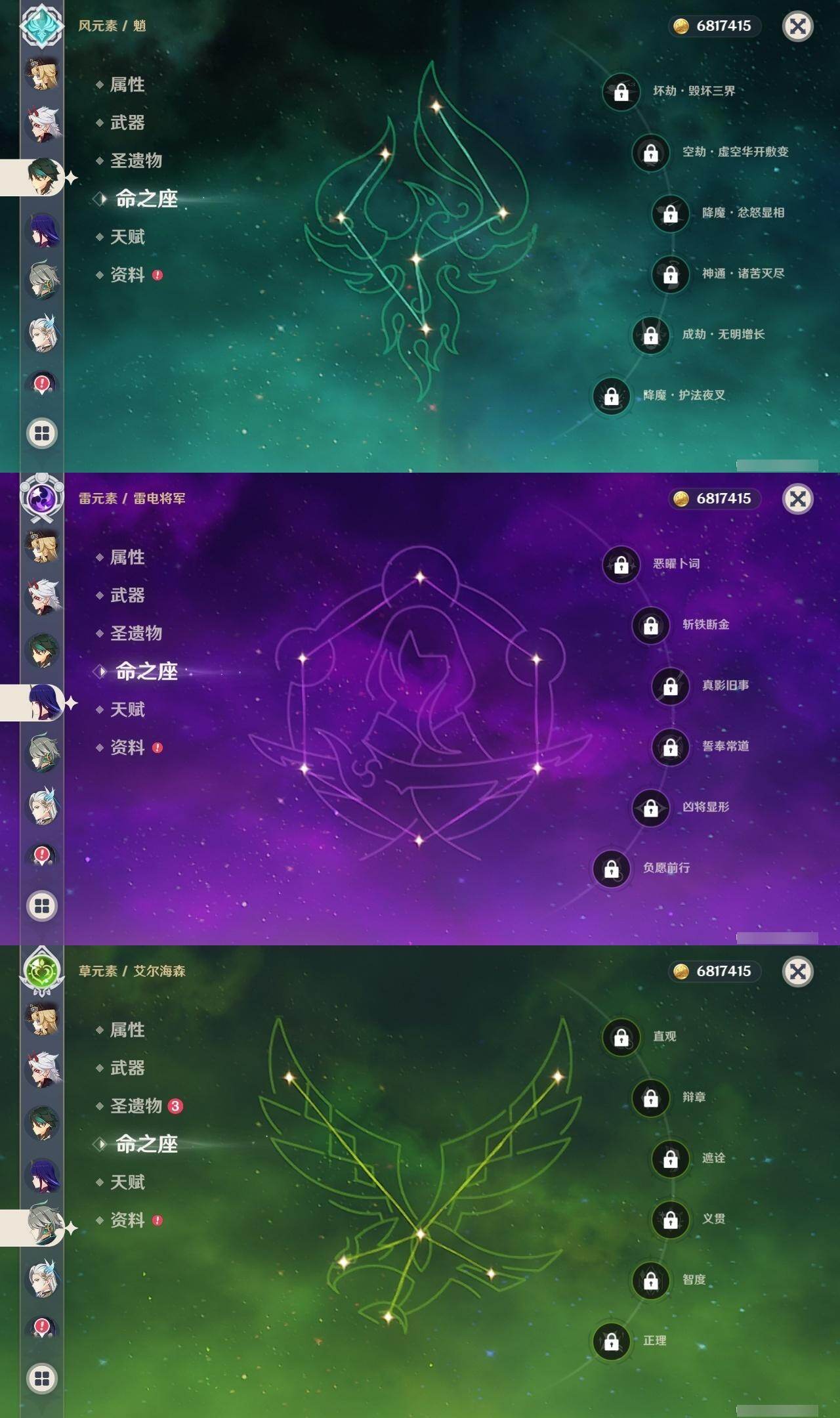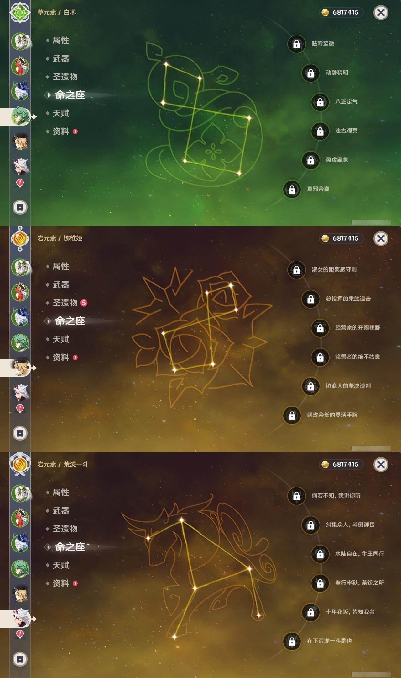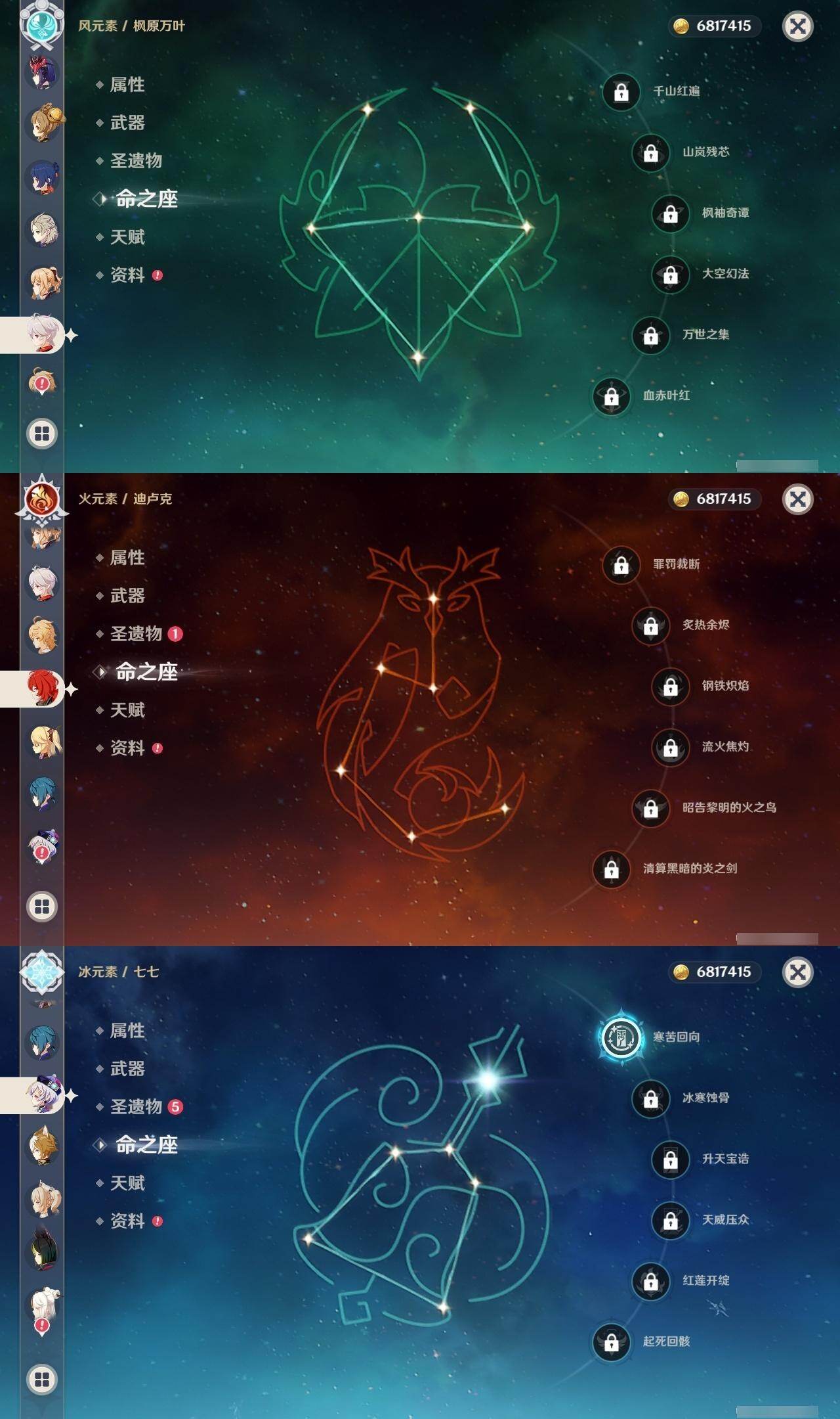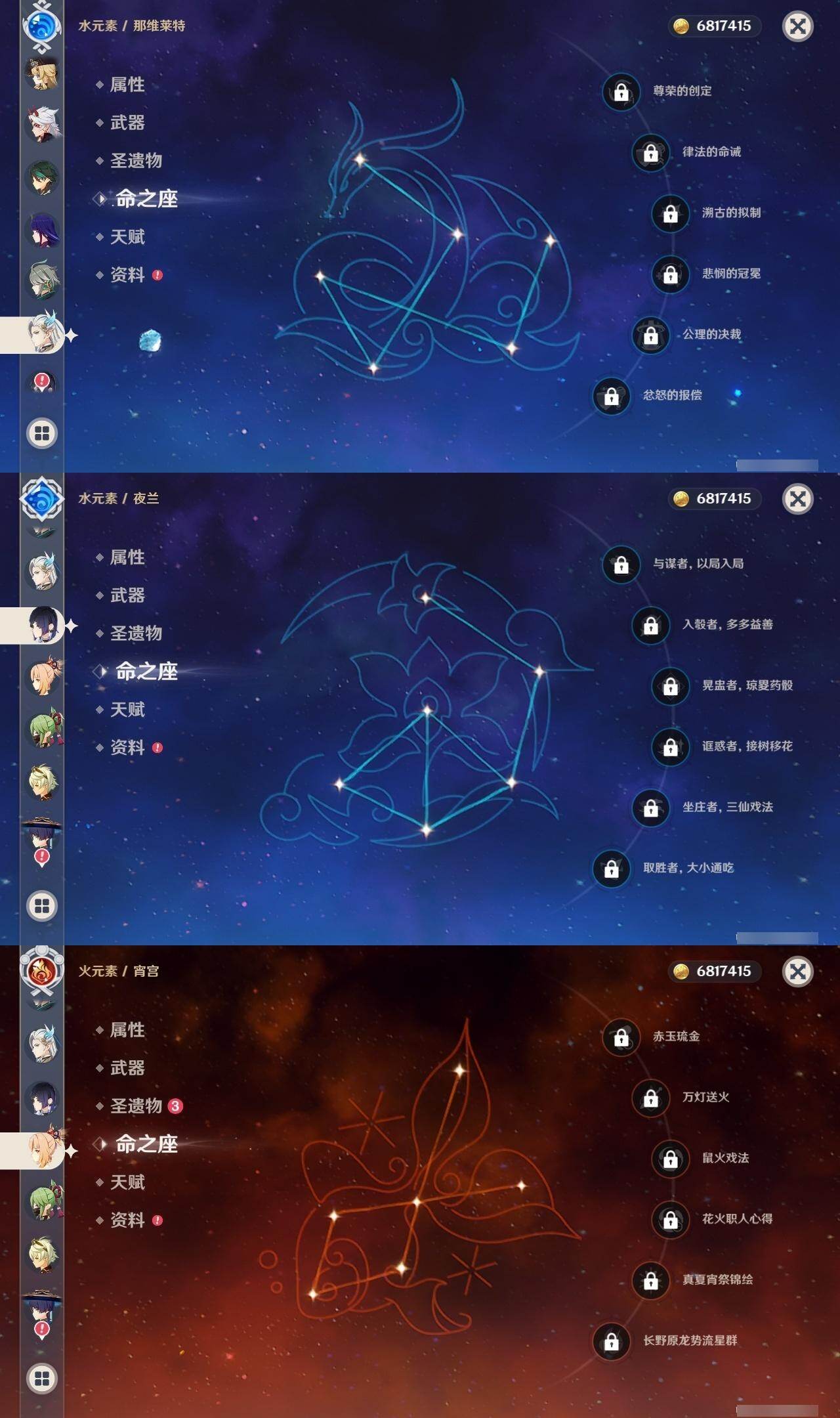 0命娜维娅,0命芙宁娜,0命那维莱特,0命白术,0命迪希雅,0命艾尔海森,0命流浪者,0命纳西妲,0命妮露,0命提纳里,0命夜兰,0命荒泷一斗,0命雷电将军,0命枫原万叶,0命魈,0命宵宫,0命阿贝多,1命刻晴,1命七七,0命琴,2命莫娜,0命迪卢克,精1碧落之珑,精1苇海信标,精1赤沙之杖,精1圣显之钥,精1波乱月白经津,精2不灭月华,精1薙草之稻光,精1护摩之杖,精2和璞鸢,精1天空之翼,精1天空之刃,精1风鹰剑,精1狼的末路