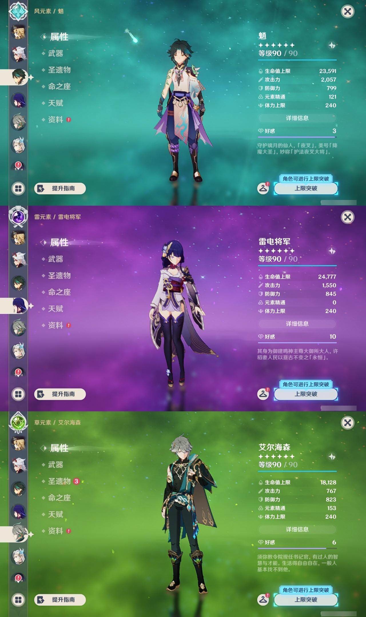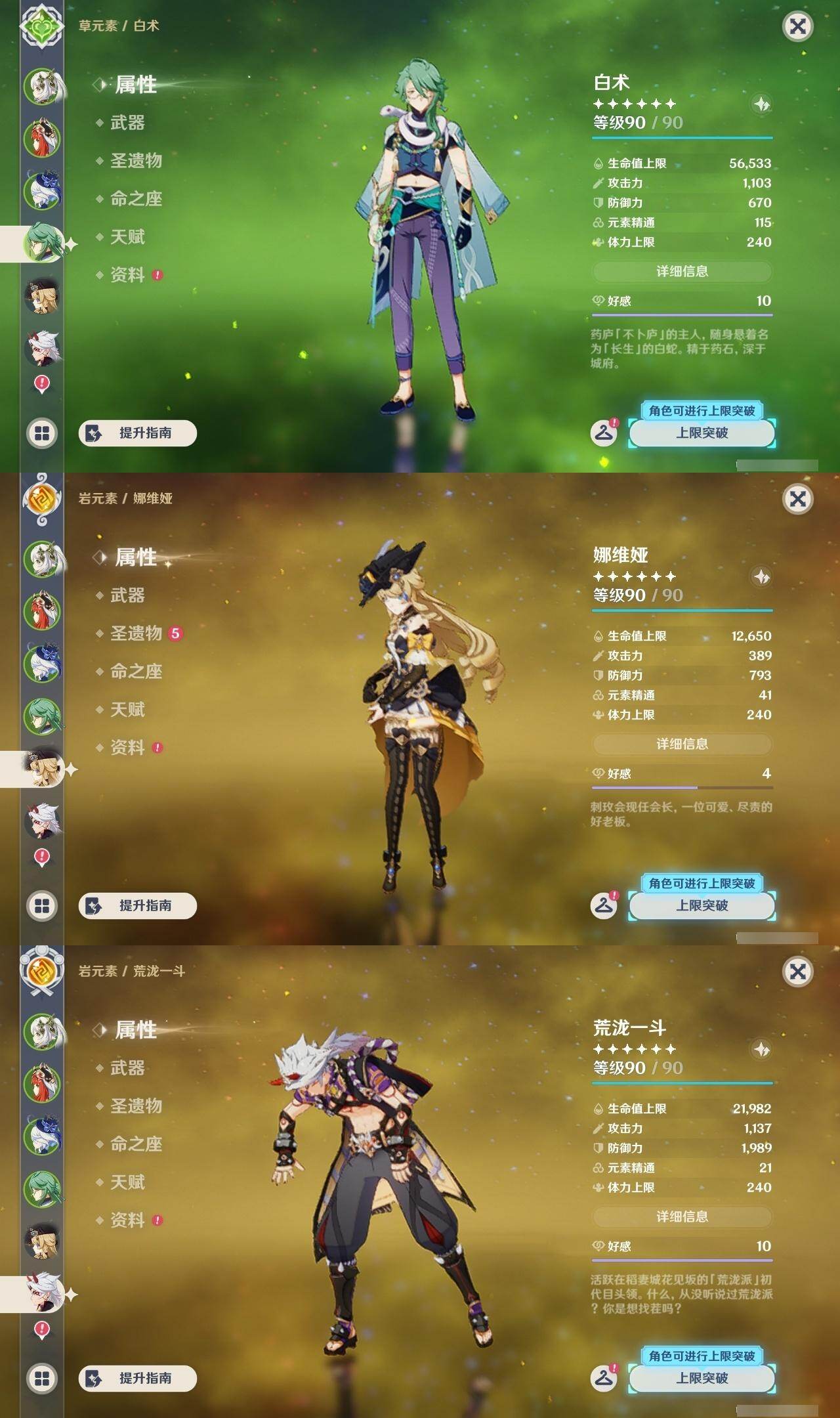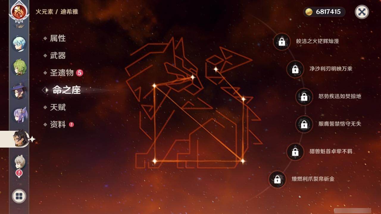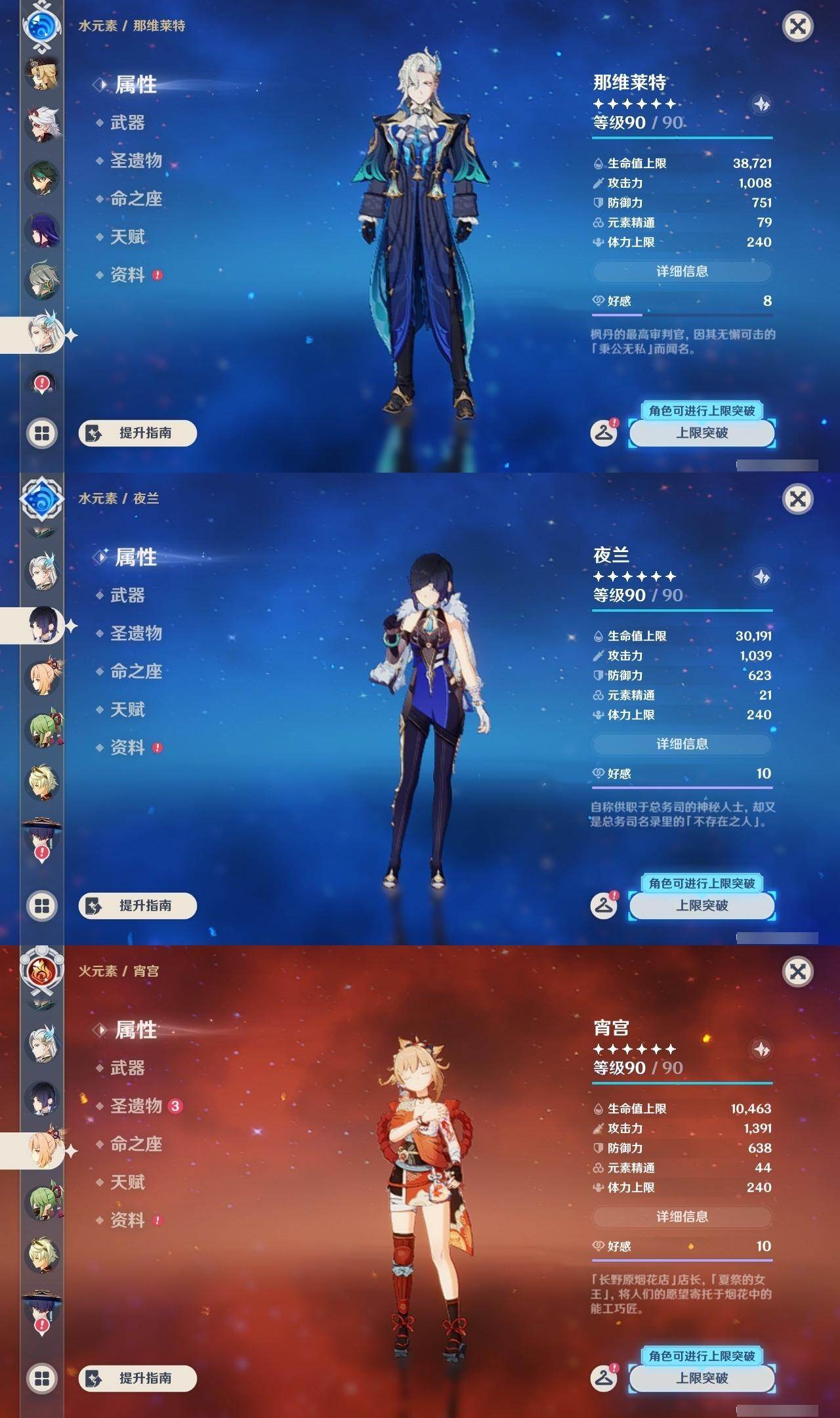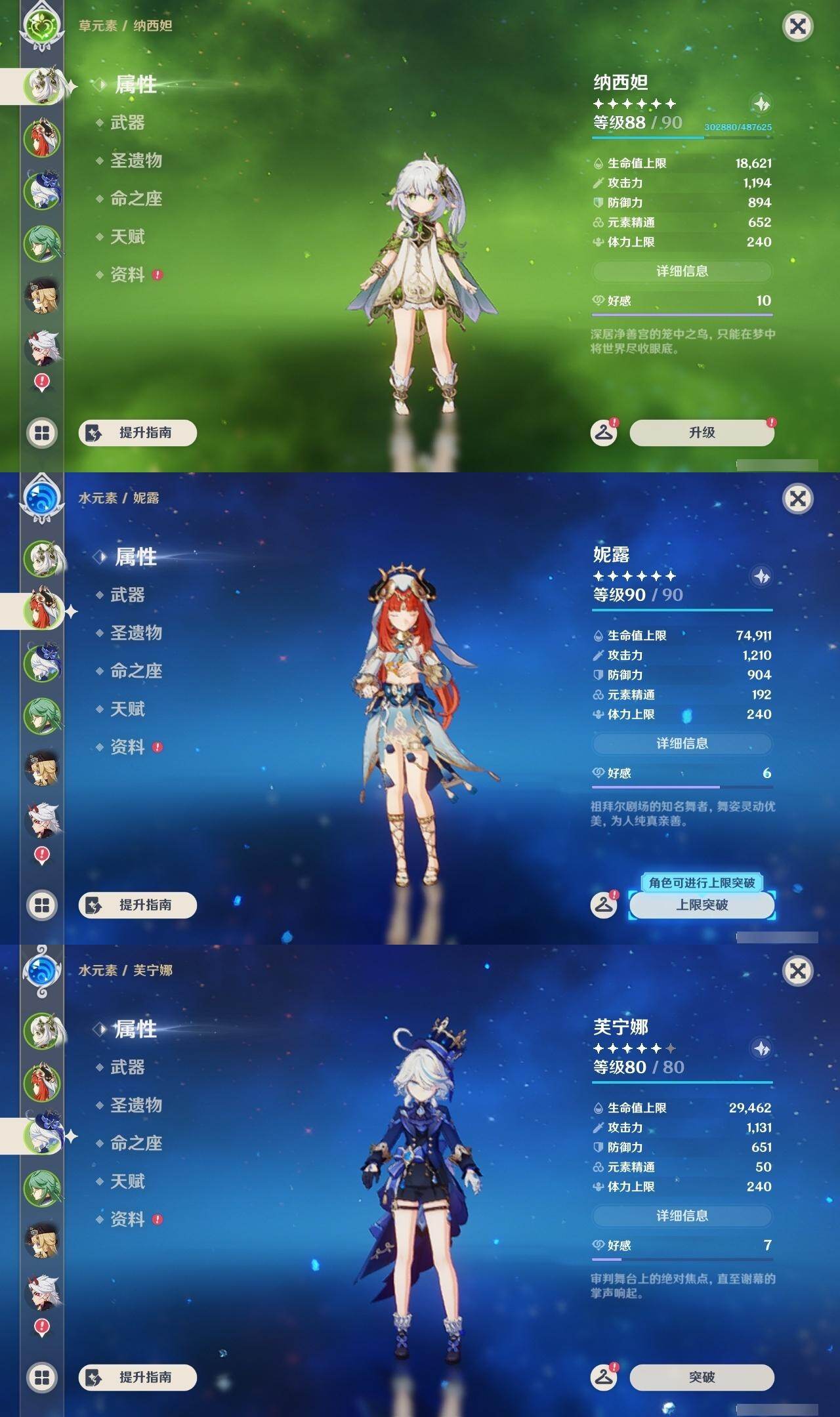 0命娜维娅,0命芙宁娜,0命那维莱特,0命白术,0命迪希雅,0命艾尔海森,0命流浪者,0命纳西妲,0命妮露,0命提纳里,0命夜兰,0命荒泷一斗,0命雷电将军,0命枫原万叶,0命魈,0命宵宫,0命阿贝多,1命刻晴,1命七七,0命琴,2命莫娜,0命迪卢克,精1碧落之珑,精1苇海信标,精1赤沙之杖,精1圣显之钥,精1波乱月白经津,精2不灭月华,精1薙草之稻光,精1护摩之杖,精2和璞鸢,精1天空之翼,精1天空之刃,精1风鹰剑,精1狼的末路