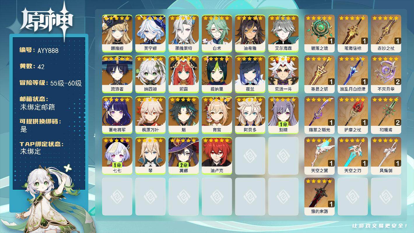 [18017986]58级/42黄/男主/22个五星角色/14个五星武器 0命娜维娅,0命芙宁娜,0命那维莱特,0命白术,0命迪希雅,0命艾尔海森,0命流浪者,0命纳西妲,0命妮露,0命提纳里,0命夜兰,0命荒泷一斗,0命雷电将军,0命枫原万叶,0命魈,0命宵宫,0命阿贝多,1命刻晴,1命七七,0命琴,2命莫娜,0命迪卢克,精1碧落之珑,精1苇海信标,精1赤沙之杖,精1圣显之钥,精1波乱月白经津,精2不灭月华,精1薙草之稻光,精1护摩之杖,精2和璞鸢,精1天空之翼,精1天空之刃,精1风鹰剑,精1狼的末路