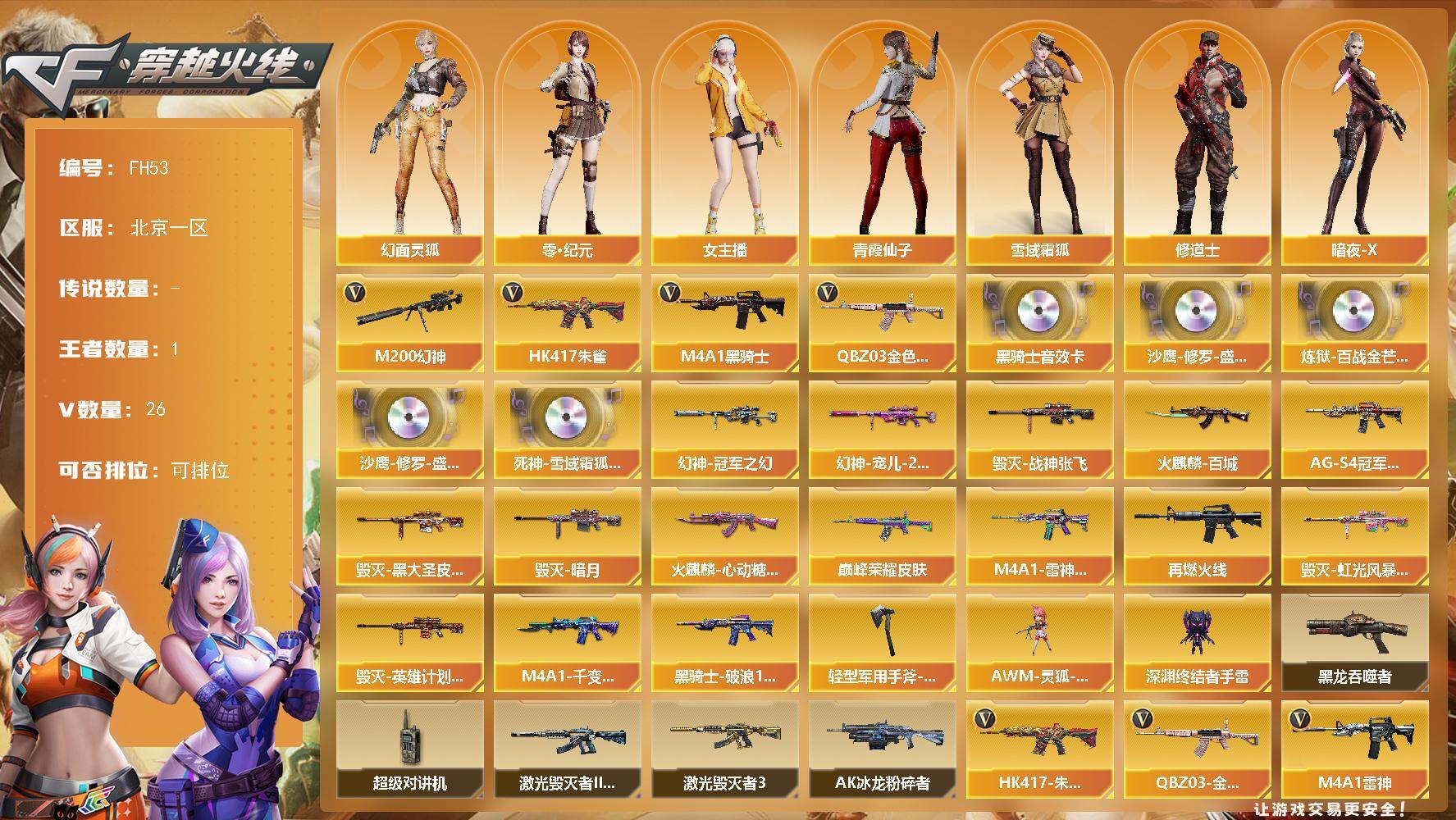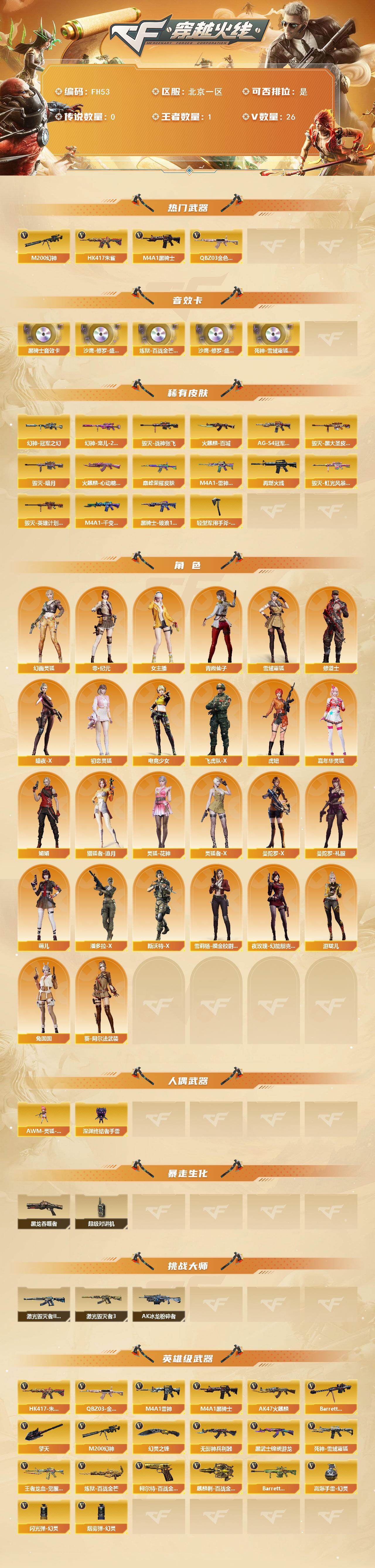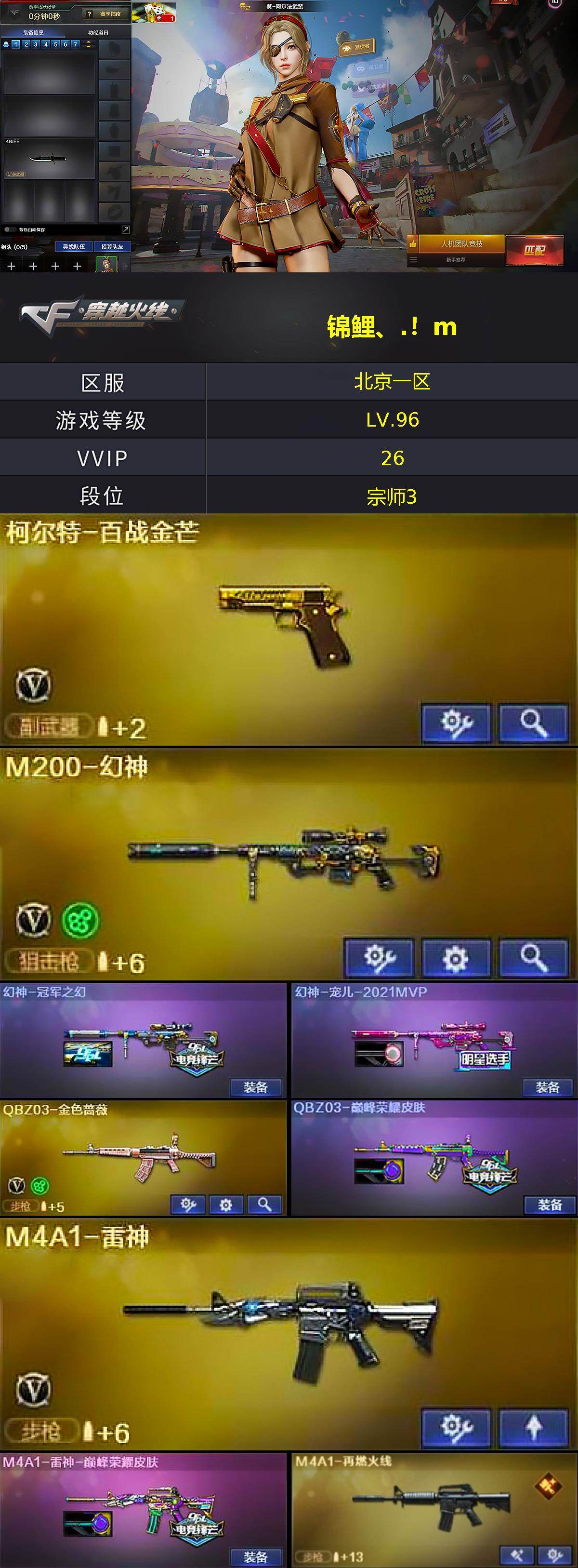 [18018903]北京一区-26V-1王者武器数-0炫金武器数 【热门武器】:QBZ03-金色蔷薇,HK417-朱雀,M200-幻神,M4A1-黑骑士 【音效卡】:M4A1-黑骑士音效卡,沙鹰-修罗-盛典舞曲音效卡*2,炼狱-百战金芒-庆典舞曲音效卡,死神-雪域霜狐-怀旧音效卡 【皮肤】:幻神-冠军之幻,幻神-宠儿-2021MVP,QBZ03-巅峰荣耀皮肤,M4A1-雷神-巅峰荣耀皮肤,M4A1-再燃火线,火麒麟-百城,火麒麟-心动糖果,毁灭-暗月,毁灭-战神张飞,毁灭-黑大圣皮肤,毁灭-虹光风暴 皮肤,毁灭-英雄计划 皮肤,M4A1-千变-孔明皮肤,黑骑士-AG-S4冠军典藏,黑骑士-破浪10年皮肤,轻型军用手斧-再燃火线 【角色】:零·纪元,雪域霜狐,修道士,葵-阿尔法武装,幻面灵狐,暗夜-X,初恋灵狐,电竞少女,飞虎队-X,虎妞,嘉年华灵狐,娟娟,猎狐者-追月,灵狐-花神,灵狐者-X,曼陀罗-X,曼陀罗-礼服,萌儿,女主播,潘多拉-X,青霞仙子,斯沃特-X,兔囡囡,雪莉杨-摸金校尉,夜玫瑰-幻能朋克,游珑儿 【人偶武器】:AWM-灵狐-15周年嘉年华,深渊终结者手雷 【暴走生化】:黑龙吞噬者,超级对讲机 【挑战大师】:AK47-冰龙粉碎者,激光毁灭者III-白马银枪*2,激光毁灭者III 【英雄级武器】:AK47-火麒麟,M4A1-雷神,M4A1-黑骑士,HK417-朱雀,无影-神兵利器,黑武士-锦绣游龙,死神-雪域霜狐,QBZ03-金色蔷薇,王者龙血-觉醒版,机械迷城-穹宇,Barrett-毁灭,M200-幻神,炼狱-百战金芒,柯尔特-百战金芒,擎天,幻灵之锋,麒麟刺-百战金芒,高爆手雷-幻灵,闪光弹-幻灵,烟雾弹-幻灵,Barrett-碧霄极光 【道具】:BS战队炫彩背包,CFS限定背包,云山科技背包,云海游龙炫彩背包,百战金芒炫彩背包,超级背包,雪域霜狐炫彩背包,黄金超能特工背包,女皇终结者-魔龙之吻,救世主-黑桃战神,绿色巨人,灵魂忍者,妖姬,迷雾幽灵,夺命之镰,防化服*3,金色流光-枪王排位*2,星辰流光-枪王排位,流光-鎏金之域,枪王排位28赛季金色流光,语音特效-盛典烟火,语音特效-怀旧,雪域霜狐表情,萌萌小葵表情,EP战队击杀图标,防弹头盔*4,防弹衣*4,C4工具钳*4,手雷包*4 【特殊枪械】:1黑骑士