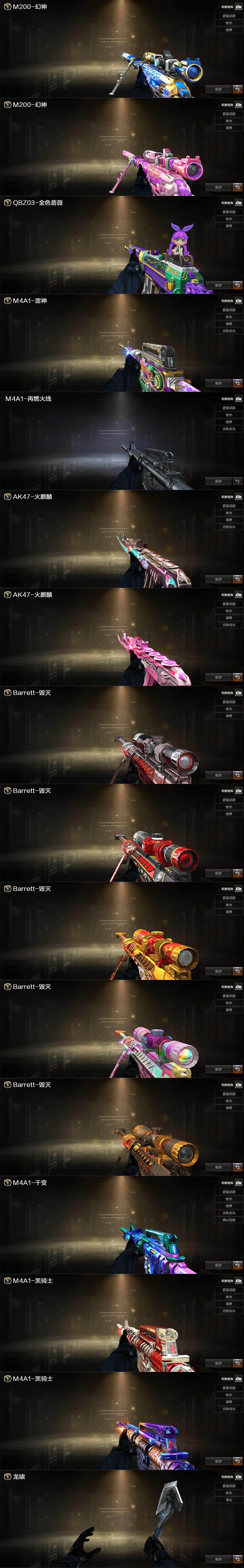 【英雄级武器】:AK47-火麒麟,M4A1-雷神,M4A1-黑骑士,HK417-朱雀,无影-神兵利器,黑武士-锦绣游龙,死神-雪域霜狐,QBZ03-金色蔷薇,王者龙血-觉醒版,机械迷城-穹宇,Barrett-毁灭,M200-幻神,炼狱-百战金芒,柯尔特-百战金芒,擎天,幻灵之锋,麒麟刺-百战金芒,高爆手雷-幻灵,闪光弹-幻灵,烟雾弹-幻灵,Barrett-碧霄极光