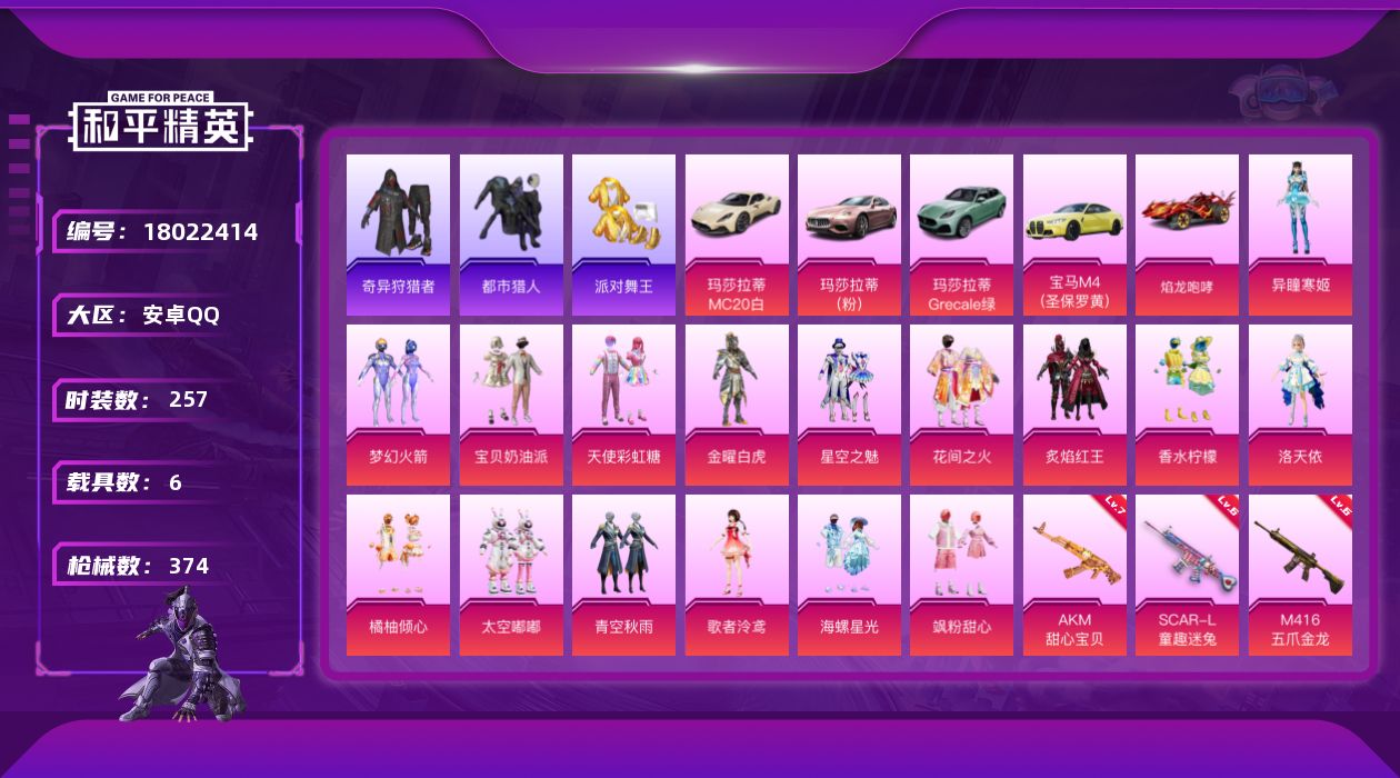 [18022414]【特价出售/店主推荐】安卓 手Q-20粉装-13特效枪-6载具-6粉色飞行器-124729热力值-15王牌印记-257套装-374枪皮【热门品类】:粉装-梦幻火箭,套装-浪漫天命,套装-都市猎人,套装-派对舞王,套装-小丑鱼,套装-奇异狩猎者,套装-龟仙人,套装-暗影哥特【粉色套装】:粉装-宝贝奶油派,粉装-天使彩虹糖,粉装-金曜白虎,粉装-梦幻火箭,粉装-星空之魅,粉装-花间之火,粉装-炙焰红王,粉装-香水柠檬,角色-洛天依,粉装-橘柚倾心,粉装-太空嘟嘟,粉装-青空秋雨,角色-歌者泠鸢,粉装-海螺星光,粉装-飒粉甜心,角色-异瞳寒姬,角色-谜鸦审判,角色-辉光之愿,角色-烬夜之誓,角色-虎痴许褚【粉色枪皮等级】:AKM-甜心宝贝(七级),AKM-星际浪客(一级),SCAR-L-童趣迷兔(六级),M416-五爪金龙(六级),蜜獾-异瞳寒姬(五级),ACE32-萌骑漫游(三级),UMP45-萌骑冒险(三级),AKS-74U-森灵之息(五级),Kar98K-巳巳如意(五级),Mk14-福马献瑞(五级),M417-第五大道(三级),DP-28-豹影疾电(五级),PKM-萌骑夺宝(一级)【粉色载具】:玛莎拉蒂MC20(星石白),玛莎拉蒂Ghibli(粉),玛莎拉蒂Grecale(薄荷绿),宝马M4(圣保罗黄),焰龙咆哮,霜月冰狼【粉色枪皮】:AKM-甜心宝贝,AKM-星际浪客,SCAR-L-童趣迷兔,M416-五爪金龙,蜜獾-异瞳寒姬,ACE32-萌骑漫游,UMP45-萌骑冒险,AKS-74U-森灵之息,Kar98K-巳巳如意,Mk14-福马献瑞,M417-第五大道,DP-28-豹影疾电,PKM-萌骑夺宝【粉色飞行器】:香车宝马飞行器,炫彩糖果飞行器,歌者泠鸢飞行器,极意拳锋飞行器,辉光之愿飞行器