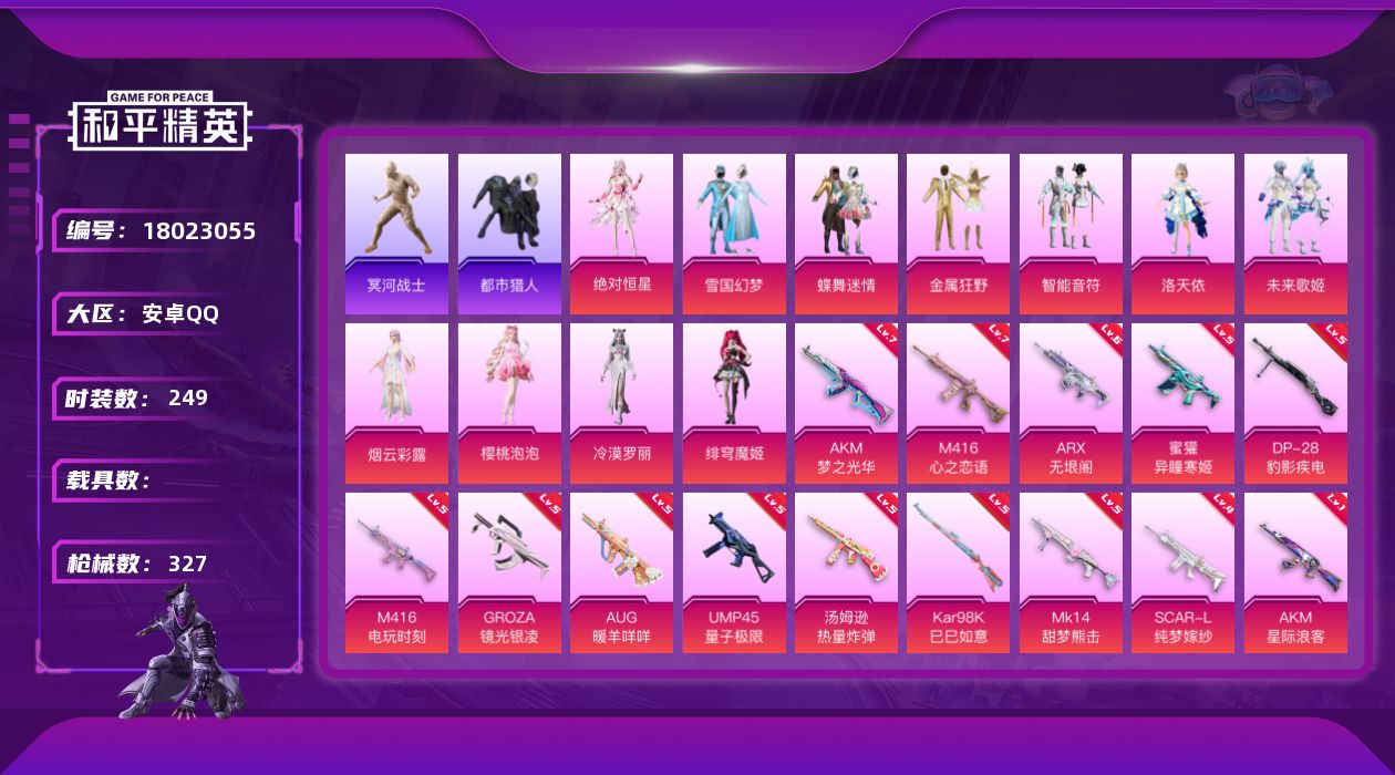 [18023055]安卓 手Q-11粉装-20特效枪-0载具-2粉色飞行器-104218热力值-25王牌印记-249套装-327枪皮
