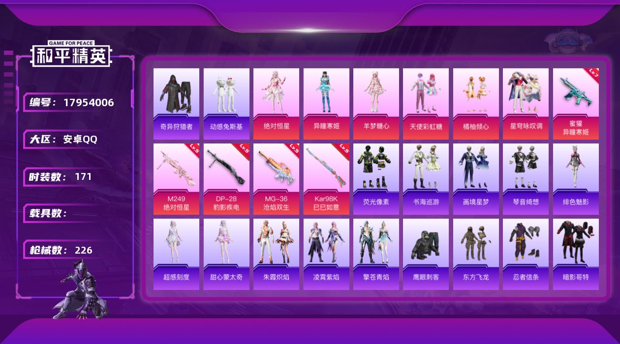 [17954006]安卓 手Q-6粉装-9特效枪-0载具-2粉色飞行器-62850热力值-7王牌印记-171套装-226枪皮 【热门品类】:套装-奇异狩猎者,套装-忍者信条,套装-动感兔斯基人偶服,套装-暗影哥特,套装-粉红小猪 【粉色套装】:角色-绝对恒星,粉装-天使彩虹糖,粉装-橘柚倾心,粉装-星穹咏叹调,角色-羊梦糖心,角色-异瞳寒姬 【粉色枪皮等级】:AKM-暮色玫影(三级),蜜獾-异瞳寒姬(七级),AKS-74U-森灵之息(五级),Kar98K-巳巳如意(五级),M249-绝对恒星(五级),DP-28-豹影疾电(五级),MG-36-沧焰双生(五级) 【粉色枪皮】:AKM-暮色玫影,蜜獾-异瞳寒姬,AKS-74U-森灵之息,Kar98K-巳巳如意,Mk14-福马献瑞,M249-绝对恒星,DP-28-豹影疾电,MG-36-沧焰双生 【粉色飞行器】:炫彩糖果飞行器,踏卷乘风飞行器 【粉色降落伞】:绝对恒星降落伞,幻影战神降落伞,未来战士降落伞,碧影闪光降落伞,忍者神龟降落伞,鬼刀降落伞,樱桃泡泡降落伞,星穹咏叹调降落伞,幻彩电音降落伞,双重狂想降落伞,冷漠罗丽降落伞,桃源时光降落伞,喜羊羊与灰太狼降落伞,异瞳寒姬降落伞,炫彩糖果降落伞 【稀有套装】:玩偶服-憨乐熊二,套装-巳巳如意,套装-小鸟芋圆,角色-超感刻度,角色-甜心蒙太奇,套装-荧光像素,套装-雪国风尚,套装-炫彩糖果,套装-雏菊兔兔,套装-萝兰蝴蝶,角色-狂花道·雅典娜,套装-燕燕于飞,套装-鱼渊荷华,角色-风玲,套装-闪电轻猫,套装-粉恋花,套装-紫幽梦,套装-蓝冰羽,角色-瑰梦爱神,套装-霓虹热舞,套装-彩虹兔,套装-云朵鹅,套装-雪绒豹,套装-蓝海鲸歌,角色-夜瞳黯灵,套装-朱霞炽焰,套装-凌霄紫焰,套装-擎苍青焰,角色-绯色魅影,套装-书海巡游,套装-画境星梦,套装-琴音绮想,套装-钻光豹影,套装-雨过天青,套装-红釉青花,角色-缚爪幽影,角色-幻步猫灵 【稀有枪皮】:M79短管榴弹-钛晶裂爪,MP5K-天马神君,Mini14-天马神君,ARX-天马神君,AUG-冰晶雪宝,AKM-夜灯,AKM-彩虹符号,AKM-灼热熔岩,AKM-破晓战魂,AKM-霓虹街区,AKM-灵猫魔法师,M16A4-幻世战舞者,M16A4-红色方程式,M16A4-蓝色火焰,SCAR-L-夜灯,SCAR-L-未来战士,SCAR-L-炫彩节奏