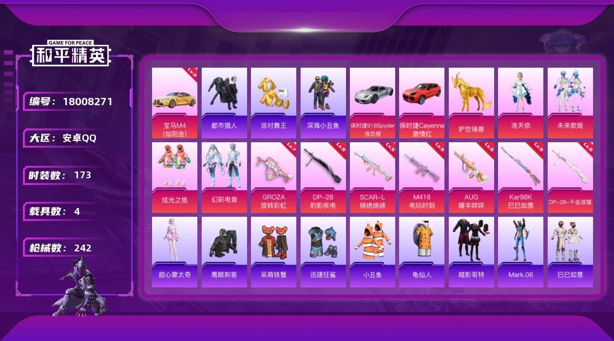 [18008271]安卓 手Q-5粉装-8特效枪-4载具-7粉色飞行器-77034热力值-13王牌印记-173套装-242枪皮