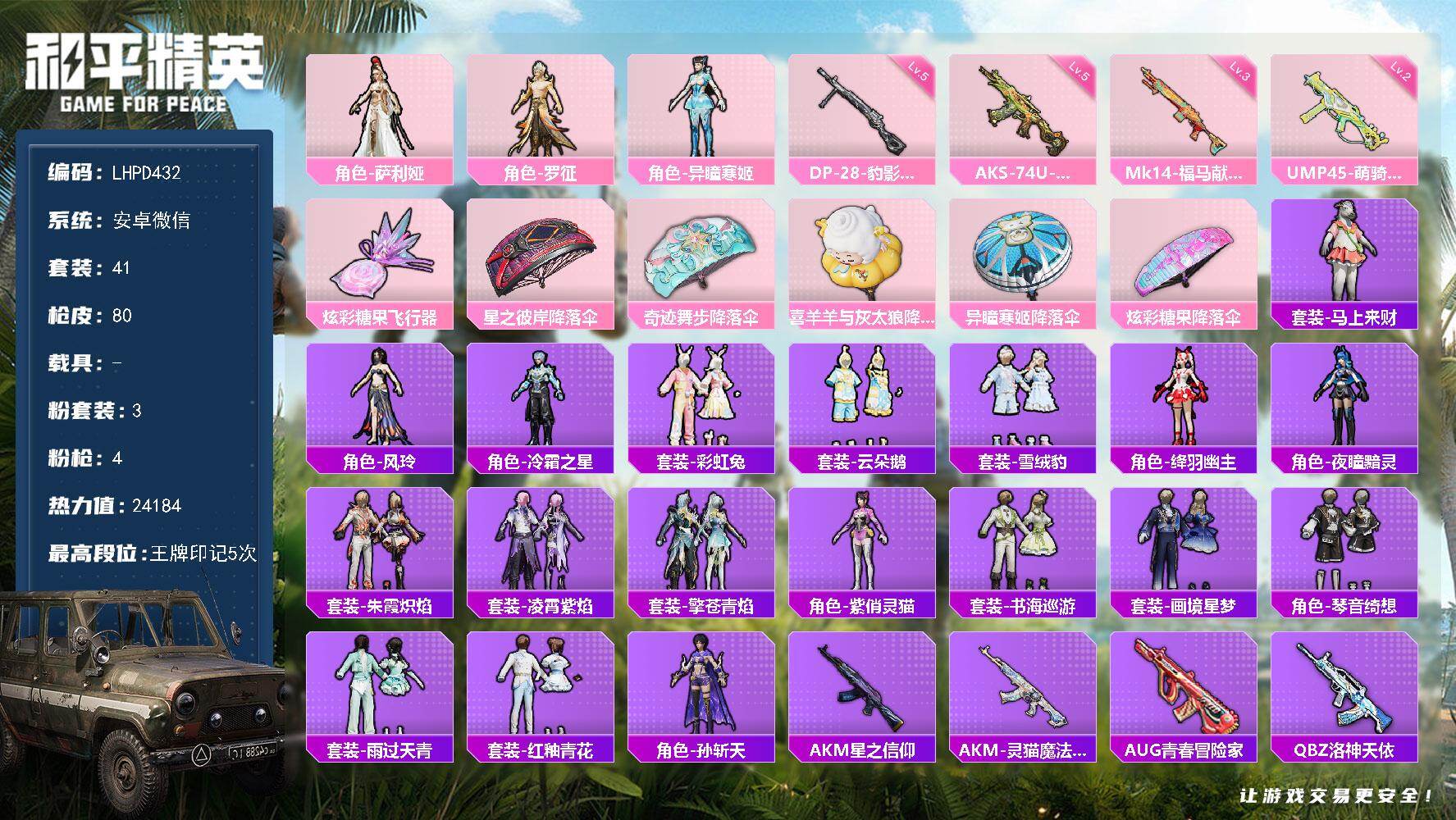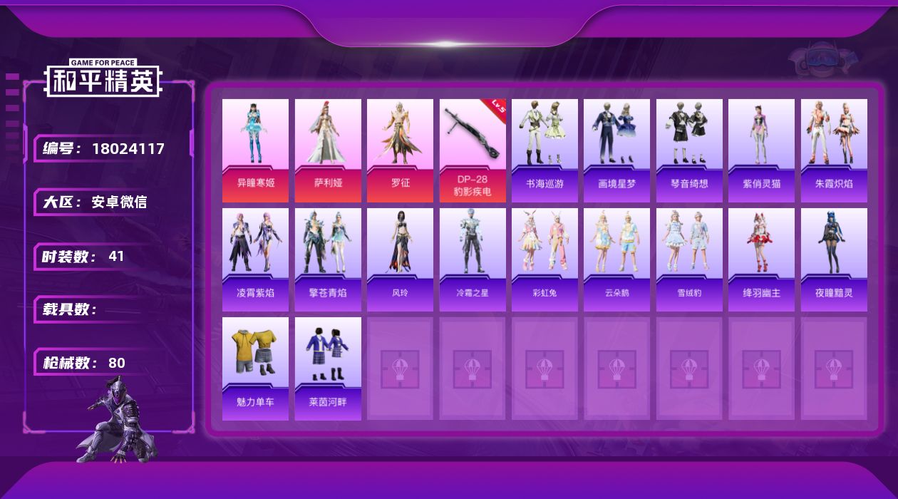 [18024117]【特价出售/店主推荐】安卓 微信-3粉装-4特效枪-0载具-1粉色飞行器-24184热力值-5王牌印记-41套装-80枪皮【粉色套装】:角色-萨利娅,角色-罗征,角色-异瞳寒姬【粉色枪皮等级】:UMP45-萌骑冒险(二级),AKS-74U-森灵之息(五级),Mk14-福马献瑞(三级),DP-28-豹影疾电(五级)【粉色枪皮】:UMP45-萌骑冒险,AKS-74U-森灵之息,Mk14-福马献瑞,DP-28-豹影疾电【粉色飞行器】:炫彩糖果飞行器
