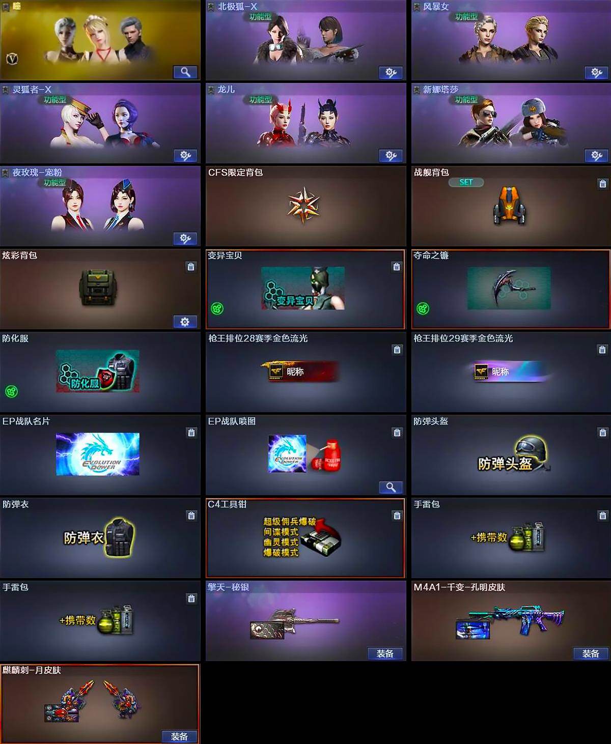 【道具】:CFS限定背包,战舰背包,炫彩背包,变异宝贝,夺命之镰,防化服,枪王排位28赛季金色流光,枪王排位29赛季金色流光,EP战队名片,EP战队喷图,防弹头盔,防弹衣,C4工具钳,手雷包*2