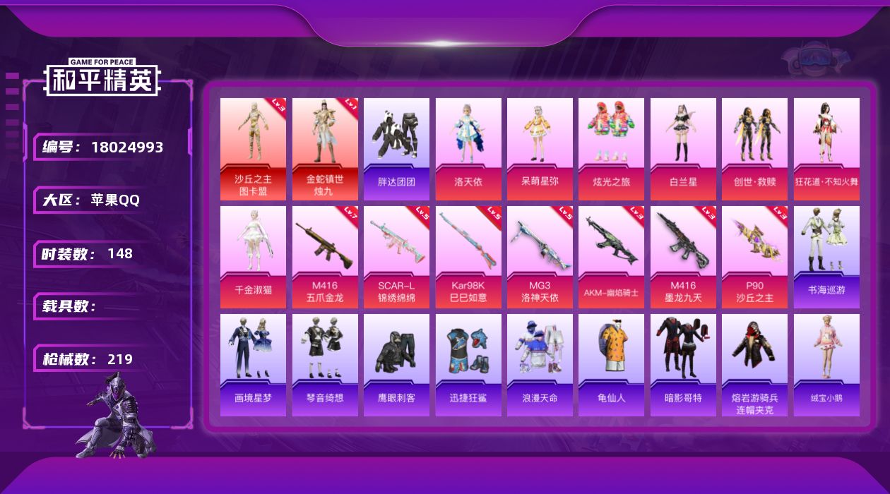 - [17984153]安卓 手Q-5粉装-7特效枪-0载具-3粉色飞行器-43785热力值-4王牌印记-85套装-131枪皮 【热门品类】:角色-2P战斗服款,套装-龟仙人 【粉色套装】:角色-洛天依,角色-歌者泠鸢,角色-呆萌星弥,角色-守护天翼,角色-异瞳寒姬 【粉色枪皮等级】:UMP45-量子极限(五级),Kar98K-巳巳如意(四级),M24-莲影清波(七级),M24-镜域双华(三级),Mk14-盛世惊鸿(三级),DP-28-豹影疾电(一级),PKM-江南烟雨(四级) 【粉色枪皮】:UMP45-量子极限,Kar98K-巳巳如意,M24-莲影清波,M24-镜域双华,Mk14-盛世惊鸿,DP-28-豹影疾电,PKM-江南烟雨 【粉色飞行器】:镜域双华-灵镜之阶,龙翔九天飞行器,深渊漩涡飞行器 【粉色降落伞】:天之羽翼降落伞,第五大道降落伞,白勺歌姬降落伞,熔岩统帅降落伞,圣堂之誓降落伞,镜域双华降落伞,江南烟雨降落伞,巴啦啦小魔仙降落伞,精灵梦叶罗丽降落伞,墨龙九天降落伞,创世·救赎降落伞,守护天翼降落伞,金丰海韵降落伞,盛世惊鸿降落伞 【稀有套装】:套装-龟仙人,套装-巳巳如意,套装-雏菊兔兔,套装-萝兰蝴蝶,角色-达芬奇,角色-都市丽猫,角色-乐音,玩偶服-懒羊羊 【稀有枪皮】:AKM-2P战斗服款,AKM-江南烟雨,AKM-胡桃卫兵,AKM-龙的传人,SCAR-L-银碳小老虎,M416-糯团青竹,M416-红色方程式,GROZA-懵萌河马,AUG-天降萌叽,AUG-闲梦青缨,QBZ-绒兔团圆,M762-天降萌叽,Mk47-妙红点点,G36C-懵萌河马,AC-VAL-快闪甜心,蜜獾-天降萌叽,Famas-镜域双华,UZI-天降萌叽,UZI-红色方程式,UMP45-炫光之旅,UMP45-生命誓言,Vector-焰鹰斗篷,汤姆逊-天降萌叽,汤姆逊-耀粉歌者,P90-倾城蜜语,P90-快闪甜心,P90-闪光银龙,Kar98K-彩虹符号,Kar98K-梦幻火箭,Kar98K-红色方程式,M24-拂晓神骑,M24-炫彩节奏,AWM-焰鹰斗篷,AWM-胡桃卫兵,SKS-夜灯,SKS-炫彩节奏,SKS-糯团青竹,VSS-彩虹符号,Mini14-辉耀战甲,Mini14-耀粉歌者,莫辛纳甘-懵萌河马,莫辛纳甘-银碳小老虎,AMR-妙红点点,AMR-墨龙九天,M417-惊鸿侠骨,MK20-H-快闪