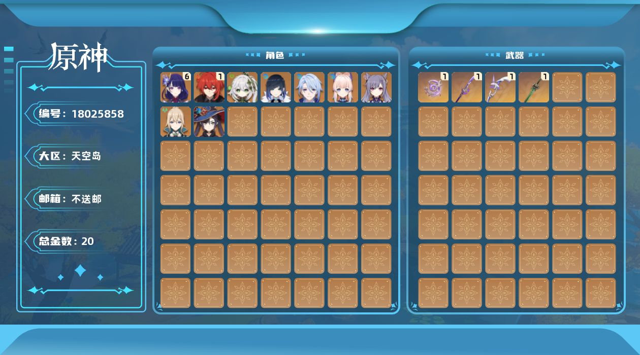 0命纳西妲,0命夜兰,0命神里绫人,满命雷电将军,0命珊瑚宫心海,0命刻晴,0命琴,0命莫娜,1命迪卢克,精1不灭月华,精1薙草之稻光,精1磐岩结绿,精1阿莫斯之弓
