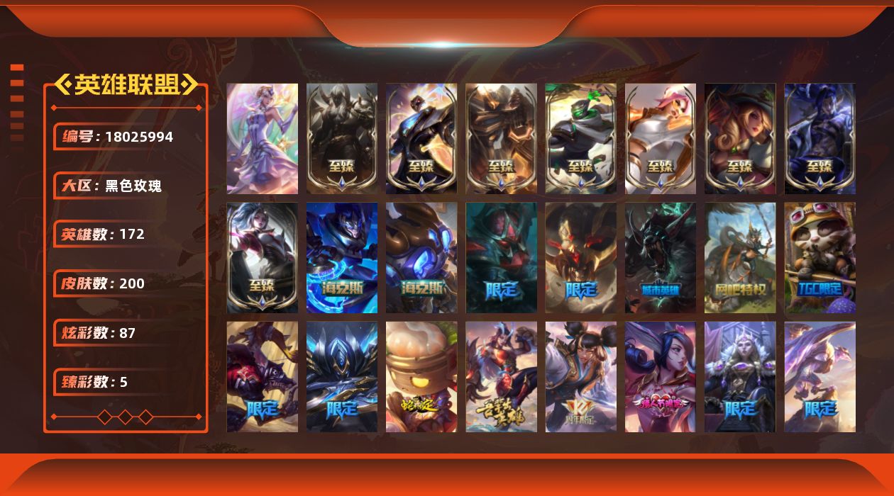 [18025994]未定级段位-172英雄-200皮肤-87炫彩-1终极-11神话-40限定-22传说-25史诗