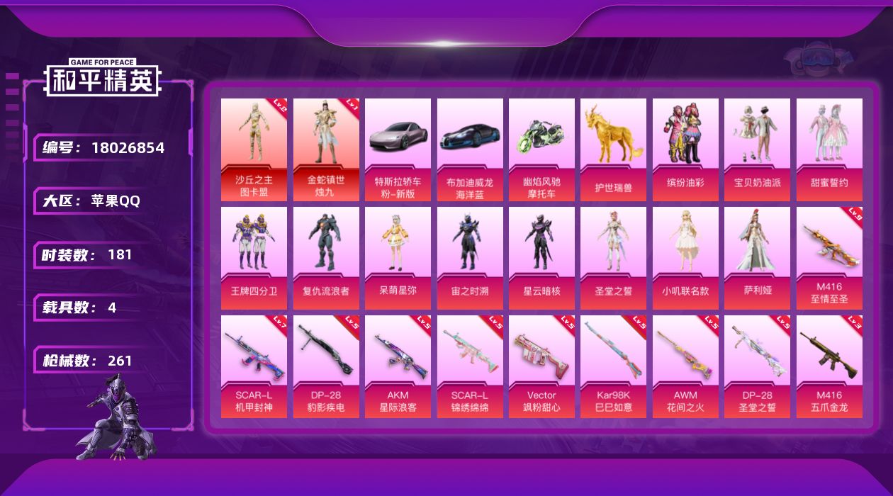 - [17302888]苹果 微信-2神装-17粉装-20特效枪-6载具-14粉色飞行器-76882热力值-4王牌印记-94套装-225枪皮 【红色神装等级】:魔童闹海-哪吒(二级),灵猫魔法师-塞维尔(一级) 【红色角色神装】:魔童闹海-哪吒,灵猫魔法师-塞维尔 【热门品类】:粉装-怪诞乔克,粉装-雪国幻梦,粉装-梦幻火箭,套装-浪漫天命,套装-胖达圆圆,套装-天网终结者,套装-动感兔斯基人偶服,套装-暗影哥特,角色-六号稻草人,熔岩游骑兵连帽夹克 【粉色套装】:粉装-怪诞乔克,粉装-宝贝奶油派,粉装-天使彩虹糖,粉装-雪国幻梦,粉装-梦幻火箭,粉装-放客神游,粉装-绚金战神,粉装-冰霜白皇,粉装-千面幻镜,粉装-炫光之旅,粉装-动力核心,角色-羲和光序,角色-樱桃泡泡,粉装-御兔特攻,粉装-幻彩电音,角色-绯穹魔姬 【粉色枪皮等级】:AKM-炫紫旋律(四级),SCAR-L-童趣迷兔(四级),M416-女娲灵识(二级),M416-灵猫魔法师(五级),GROZA-镜光银凌(五级),AUG-暖羊咩咩(五级),UZI-圣斗士星矢(三级),UMP45-宁雨蝶(三级),Vector-最终圣卫者(三级),汤姆逊-热量炸弹(五级),P90-沙丘之主(三级),Kar98K-巳巳如意(五级),Mk14-甜梦熊击(五级),S1897-蓝晶绮麟(四级),DP-28-罗征(四级),DP-28-豹影疾电(五级),MG3-辉羽雀灵(三级),MG-36-沧焰双生(五级),烟雾弹-丁香清露(四级),破片手榴弹-热量炸弹(五级) 【粉色载具】:霜龙神御(云雾蓝),保时捷Panamera(星辰紫),保时捷Cayenne(激情红),合金龙骨(蓝),最终圣卫者摩托车,黑曜夜骑 【粉色枪皮】:AKM-炫紫旋律,SCAR-L-童趣迷兔,M416-女娲灵识,M416-灵猫魔法师,GROZA-镜光银凌,AUG-暖羊咩咩,UZI-圣斗士星矢,UMP45-宁雨蝶,Vector-最终圣卫者,汤姆逊-热量炸弹,P90-沙丘之主,Kar98K-巳巳如意,Mk14-甜梦熊击,S1897-蓝晶绮麟,DP-28-罗征,DP-28-豹影疾电,MG3-辉羽雀灵,MG-36-沧焰双生,烟雾弹-丁香清露,破片手榴弹-热量炸弹 【粉色飞行器】:酣梦熊熊飞行器,梦幻火箭飞行器,镜光幻境飞行翼,沙丘之主天马,镜域双华-灵镜之阶,龙翔九天飞行器,万象金身飞行器,彩
