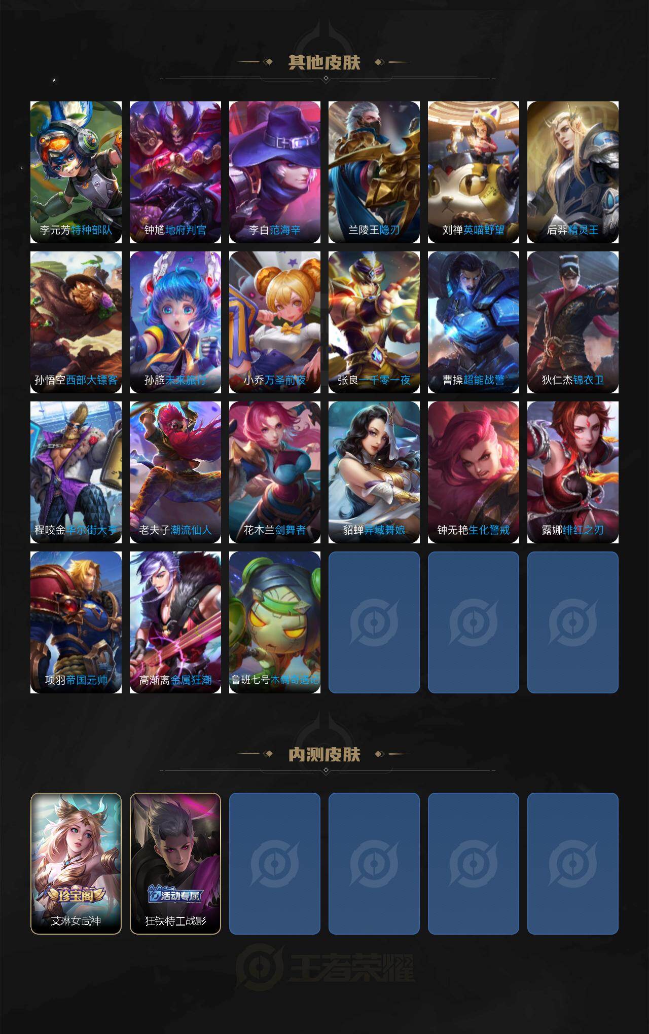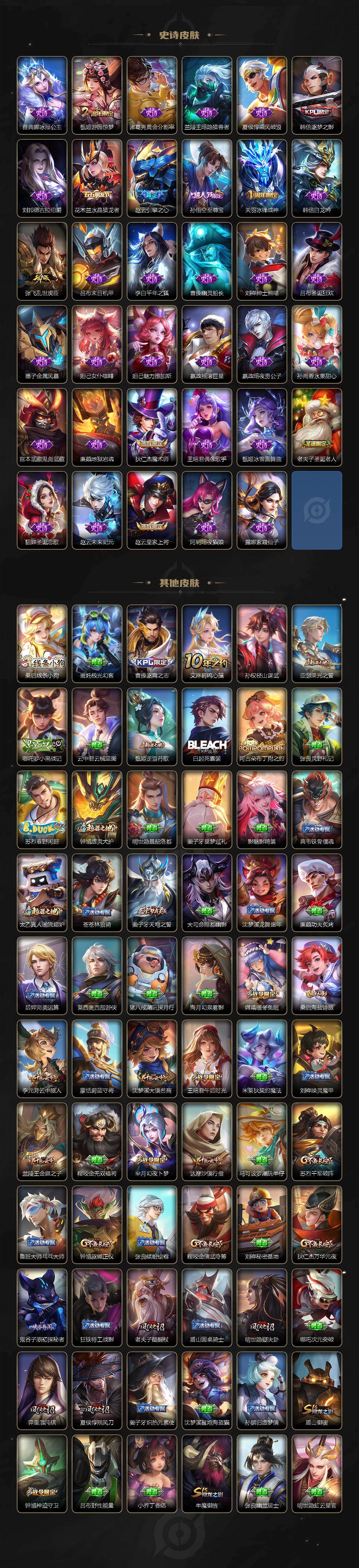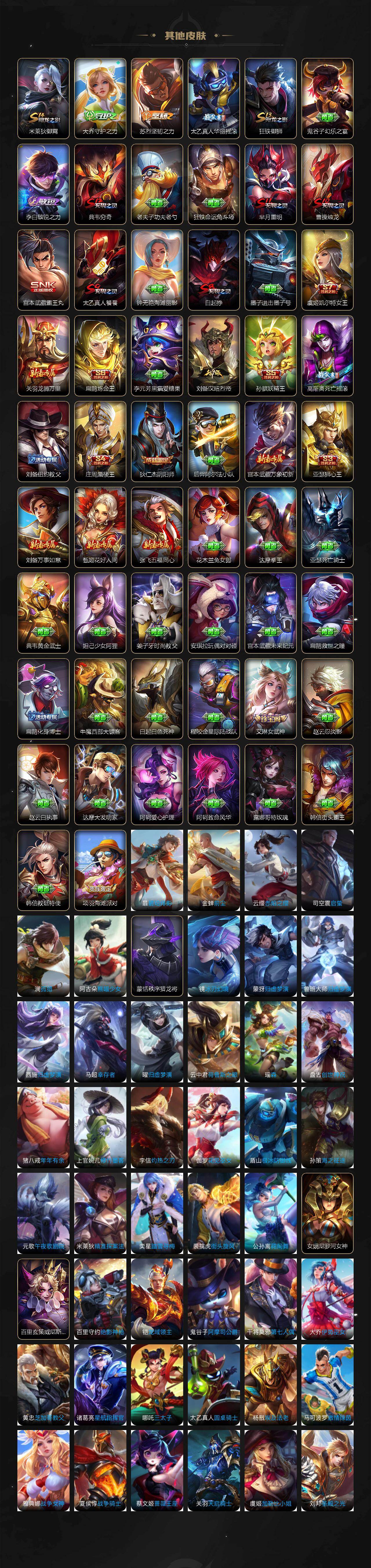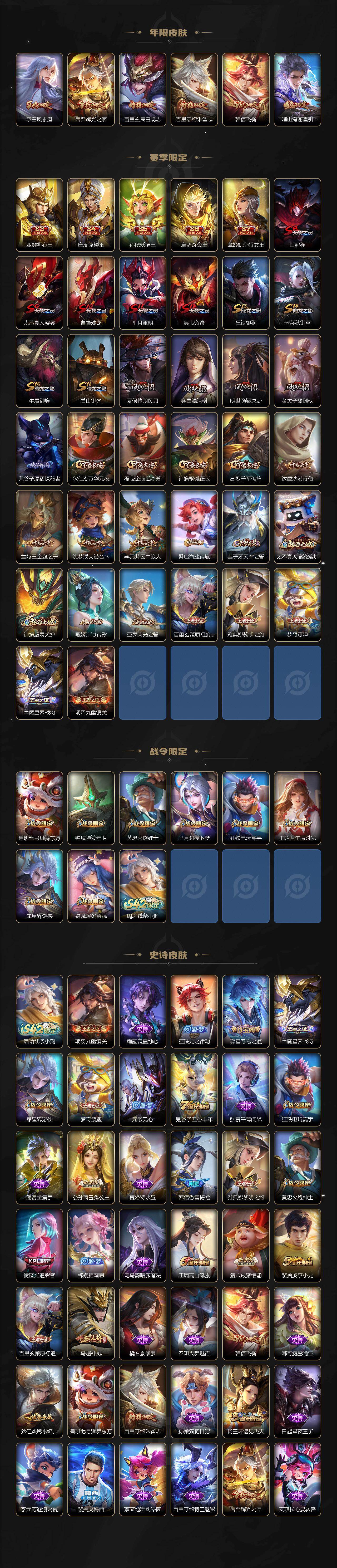 【限定皮肤】:白起狰,姜子牙天穹之誓,狄仁杰阴阳师,虞姬凯尔特女王,赵云皇家上将,赵云引擎之心,鲁班七号狮舞东方,庄周蜃楼王,庄周高山流水,高渐离死亡摇滚,孙膑妖精王,扁鹊炼金王,芈月重明,芈月幻夜卜梦,元歌无心,夏侯惇朔风刀,甄姬游园惊梦,曹操烛龙,典韦穷奇,马可波罗深海之息,狄仁杰魔术师,狄仁杰万华元夜,达摩沙漠行僧,项羽海滩派对,老夫子圣诞老人,老夫子醍醐杖,关羽冰锋战神,程咬金演武夺筹,韩信逐梦之影,韩信飞衡,韩信傲雪梅枪,王昭君午后时光,兰陵王金庭之子,亚瑟狮心王,孙悟空至尊宝,牛魔御旌,后羿辉光之辰,李元芳云中旅人,虞姬启明星使,钟馗神迹守卫,钟馗驱傩正仪,杨玉环遇见飞天,雅典娜黎明之约,太乙真人饕餮,太乙真人华丽摇滚,鬼谷子原初探秘者,鬼谷子五谷丰年,黄忠火炮绅士,苏烈千军破阵,百里玄策白虎志,百里玄策原初追逐者,百里守约朱雀志,弈星混沌棋,梦奇顽趣,公孙离玉兔公主,沈梦溪大漠名商,明世隐疑决卦,裴擒虎李小龙,狂铁御狮,狂铁电玩高手,米莱狄御霄,盾山御銮,猪八戒猪悟能,嫦娥拒霜思,嫦娥暖冬兔眠,曜山海苍雷引,镜匿光追影者,桑启海盐诗旅,暃星界游侠,艾琳女武神,裴擒虎梅西,沈梦溪龙舞盛年