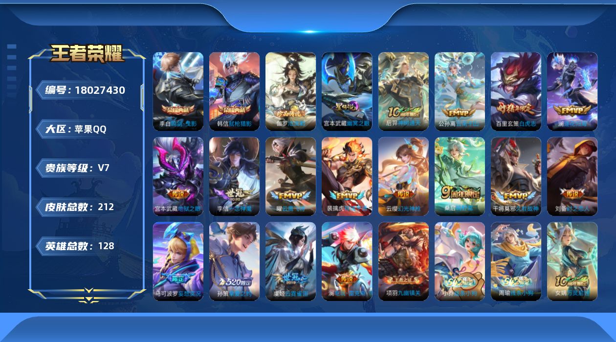 - [12091188]V7 1典藏 6传说 123英雄 275皮肤 可修改实名 优质装备:天鹅之梦(小乔典藏),仲夏夜之梦(大飞蛾),乞巧织情,淬星耀世 珍宝阁皮:蔷薇恋人,玩趣恶龙 限定皮:鸣野蒿,白虎志(电光耗子),武陵仙君(小桃花),高山流水,匿光决锋者,冰锋战神,游园惊梦,梁祝,天狼溯光者,李小龙,逐梦之影,朱雀志(守约年限),孙行者,青春决赛季,蜜橘之夏,匿光追影者 史诗皮:星界战将,破空之剑,紫霞仙子,特工魅影,千年之狐,永昼,江河有灵,蒙恬荣光圣徽,冰冠公主,偶像歌手,电玩·爆裂旋风,暗夜猫娘,末日机甲-吕布,乱世虎臣,节奏热浪,摇滚巨星,水果甜心,天才门将,星夜王子,时之奇旅-安琪拉,功夫厨神,暗隐猎兽者,幽灵船长,鬼剑武藏,心灵战警,天秀·启明,纤云弄巧,拒霜思,乘风破浪,逐浪之夏,水晶猎龙者,曙光守护者,热力回旋,金属风暴,圣诞狂欢,鹰眼统帅,暗夜贵公子,魅力维加斯,黎明之约,无心,未来纪元-赵云,玫瑰异探
