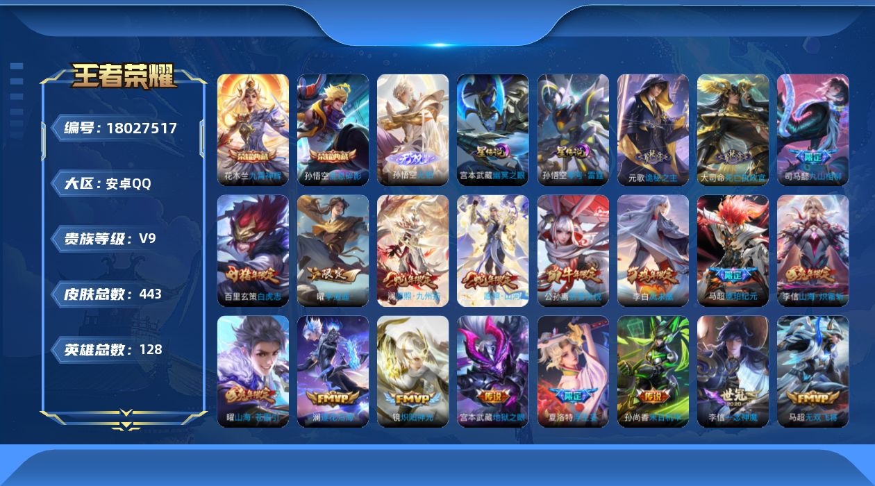 [18027517]安卓Q-V9-443皮肤-2典藏皮肤-1无双-53传说-124史诗