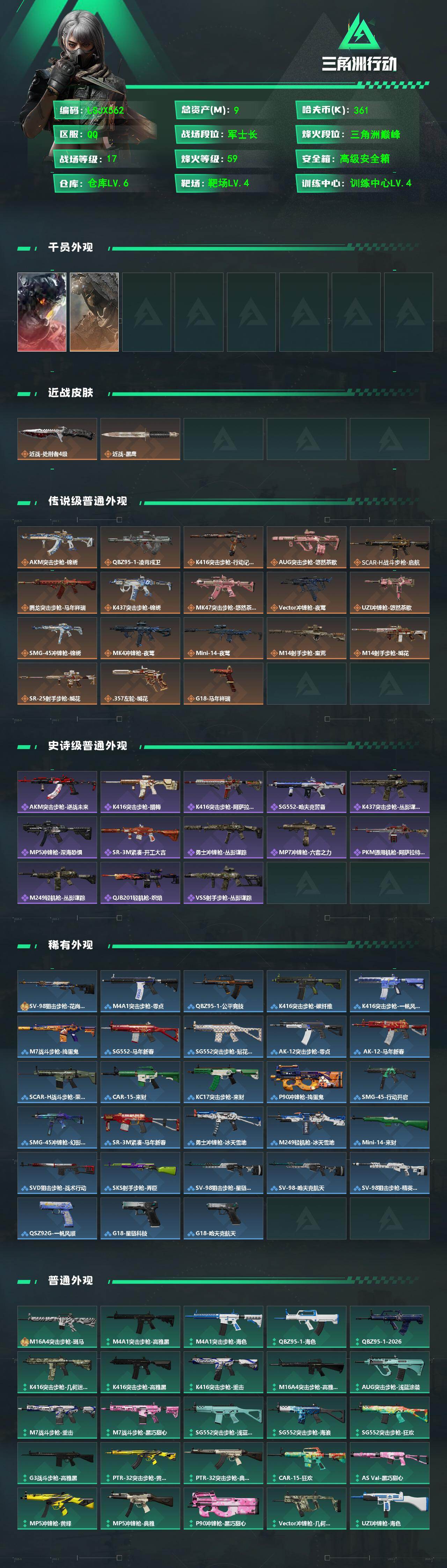 [18027690]【特价出售/店主推荐】9m总资产-361k哈夫币-59烽火等级-三角洲巅峰-17战场等级-军士长 【干员外观】:威龙-凌霄戍卫,乌鲁鲁-荒原猎手 【近战皮肤】:近战-处刑者4级,近战-黑鹰 【传说外观】:AKM突击步枪-锦绣,QBZ95-1突击步枪-凌霄戍卫,K416突击步枪-行动记录,AUG突击步枪-悠然茶歇,SCAR-H战斗步枪-启航,腾龙突击步枪-马年祥瑞,K437突击步枪-锦绣,MK47突击步枪-悠然茶歇,Vector冲锋枪-夜莺,UZI冲锋枪-悠然茶歇,SMG-45冲锋枪-锦绣,MK4冲锋枪-夜莺,Mini-14射手步枪-夜莺,M14射手步枪-蛮荒,M14射手步枪-缄花,SR-25射手步枪-缄花,.357左轮-缄花,G18-马年祥瑞 【史诗外观】:AKM突击步枪-逆战未来,K416突击步枪-腊梅,K416突击步枪-阿萨拉特攻,SG552突击步枪-哈夫克警备,K437突击步枪-丛影谍踪,MP5冲锋枪-深海恐惧,SR-3M紧凑突击步枪-开工大吉,勇士冲锋枪-丛影谍踪,MP7冲锋枪-六套之力,PKM通用机枪-阿萨拉特攻,M249轻机枪-丛影谍踪,QJB201轻机枪-炽焰,VSS射手步枪-丛影谍踪 【稀有外观】:SV-98狙击步枪-花岗岩,M4A1突击步枪-零点,QBZ95-1突击步枪-公平竞技,K416突击步枪-碳纤维,K416突击步枪-一帆风顺,M7战斗步枪-捣蛋鬼,SG552突击步枪-马年新春,SG552突击步枪-贴花艺术,AK-12突击步枪-零点, AK-12突击步枪-马年新春,SCAR-H战斗步枪-荣耀列队,CAR-15突击步枪-来财,KC17突击步枪-来财,P90冲锋枪-捣蛋鬼,SMG-45冲锋枪-行动开启,SMG-45冲锋枪-幻影结构,SR-3M紧凑突击步枪-马年新春,勇士冲锋枪-冰天雪地,M249轻机枪-冰天雪地,Mini-14射手步枪-来财,SVD狙击步枪-战术行动,SKS射手步枪-弄臣,SV-98狙击步枪-星链科技,SV-98狙击步枪-哈夫克航天,SV-98狙击步枪-精英联盟,QSZ92G-一帆风顺,G18-星链科技,G18-哈夫克航天 【普通外观】:M16A4突击步枪-斑马,M4A1突击步枪-高雅黑,M4A1突击步枪-海色,QBZ95-1突击步枪-海色,QBZ95-1突击步枪-2026,K416突击步枪-几何迷彩,K416突击步枪-高雅黑,