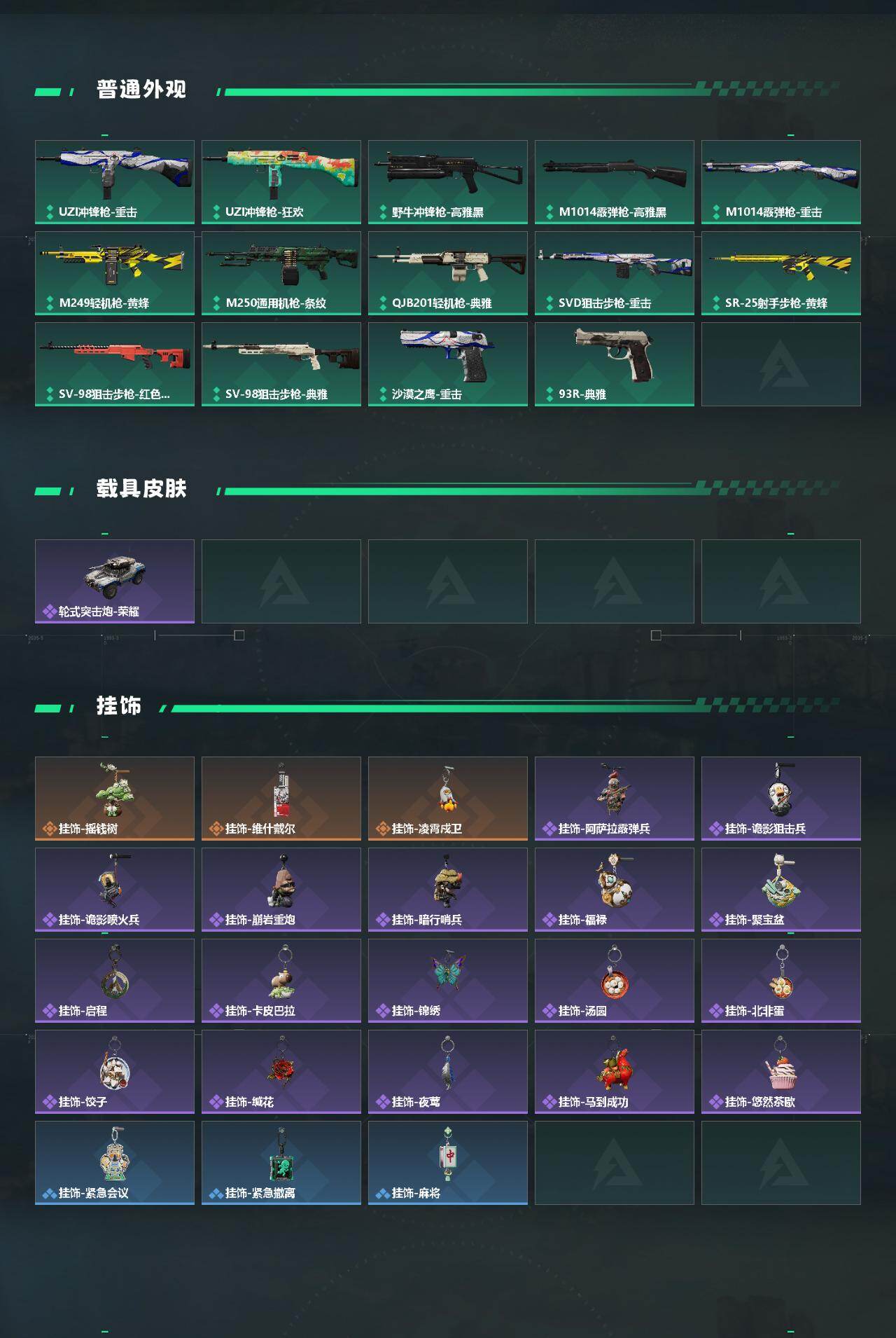 【稀有外观】:SV-98狙击步枪-花岗岩,M4A1突击步枪-零点,QBZ95-1突击步枪-公平竞技,K416突击步枪-碳纤维,K416突击步枪-一帆风顺,M7战斗步枪-捣蛋鬼,SG552突击步枪-马年新春,SG552突击步枪-贴花艺术,AK-12突击步枪-零点, AK-12突击步枪-马年新春,SCAR-H战斗步枪-荣耀列队,CAR-15突击步枪-来财,KC17突击步枪-来财,P90冲锋枪-捣蛋鬼,SMG-45冲锋枪-行动开启,SMG-45冲锋枪-幻影结构,SR-3M紧凑突击步枪-马年新春,勇士冲锋枪-冰天雪地,M249轻机枪-冰天雪地,Mini-14射手步枪-来财,SVD狙击步枪-战术行动,SKS射手步枪-弄臣,SV-98狙击步枪-星链科技,SV-98狙击步枪-哈夫克航天,SV-98狙击步枪-精英联盟,QSZ92G-一帆风顺,G18-星链科技,G18-哈夫克航天