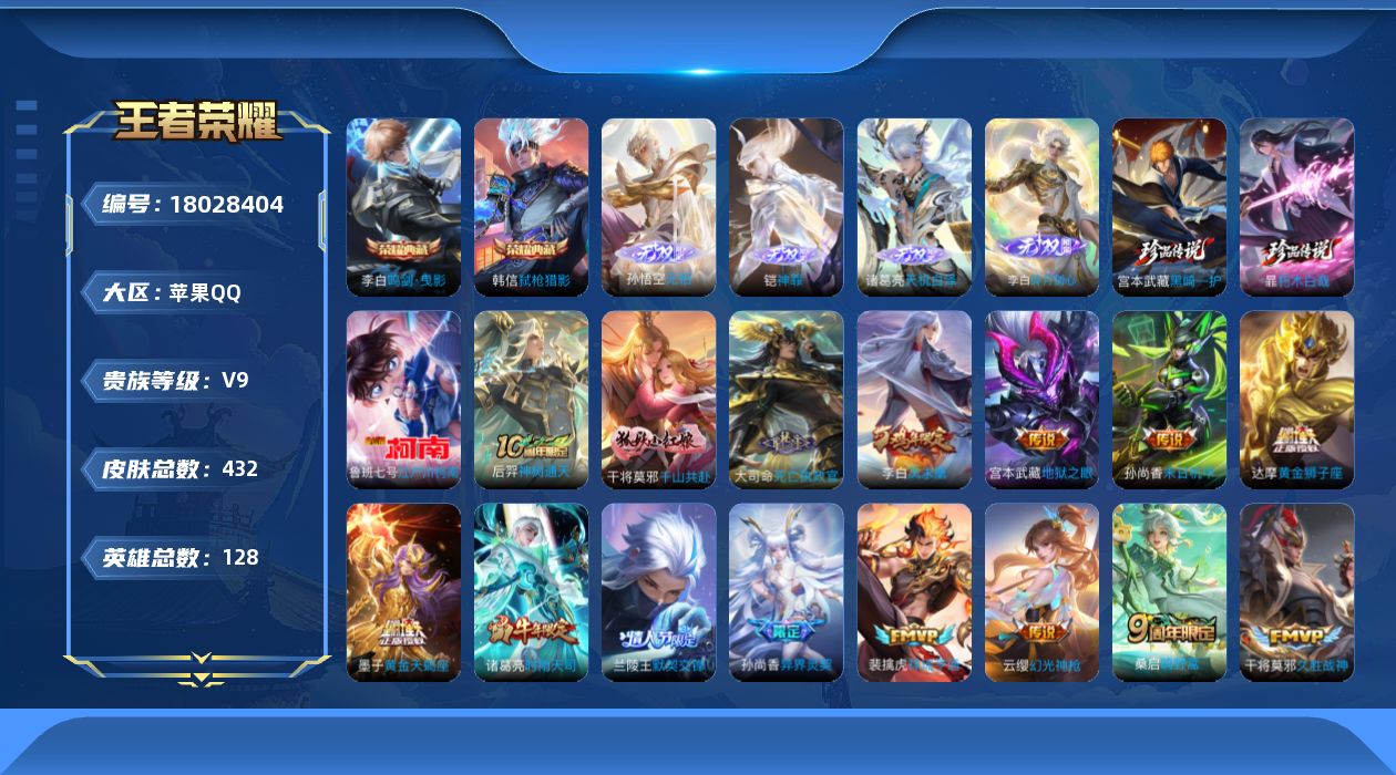 苹果Q-V9-最强王者段位-128英雄-432皮肤-2典藏皮肤-4无双-3珍品传说-27传说-123史诗