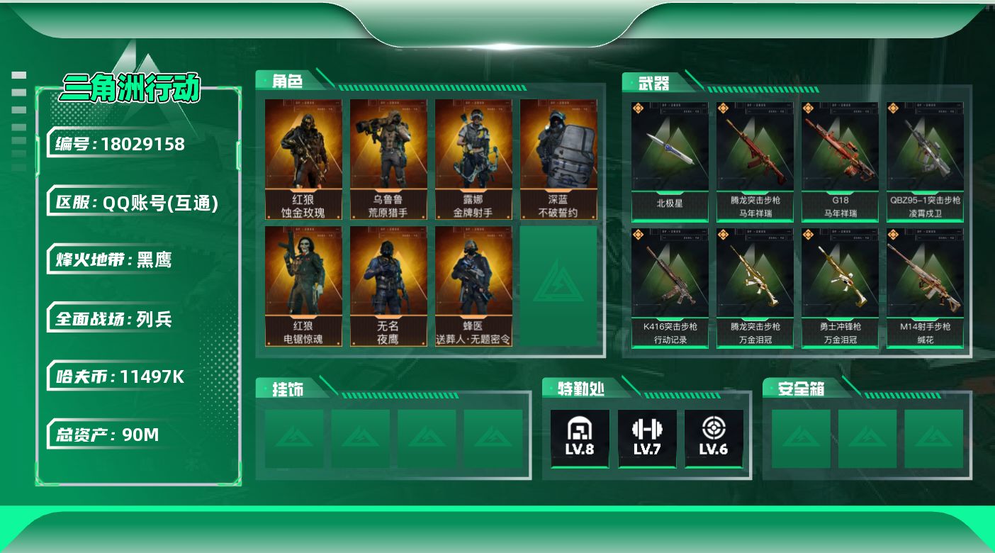 [18029158]90m总资产-11497k哈夫币-60烽火等级-黑鹰-7战场等级-列兵