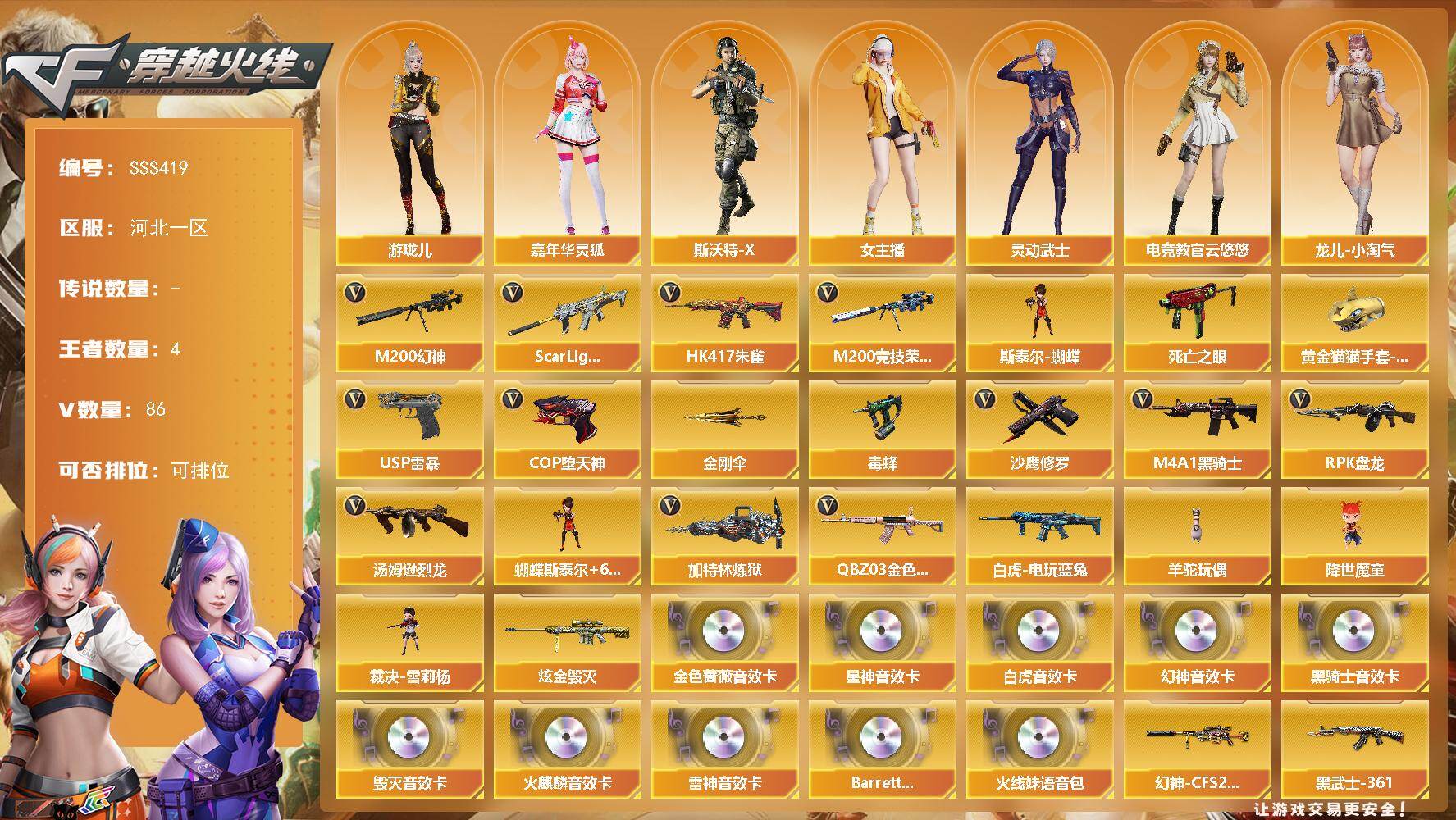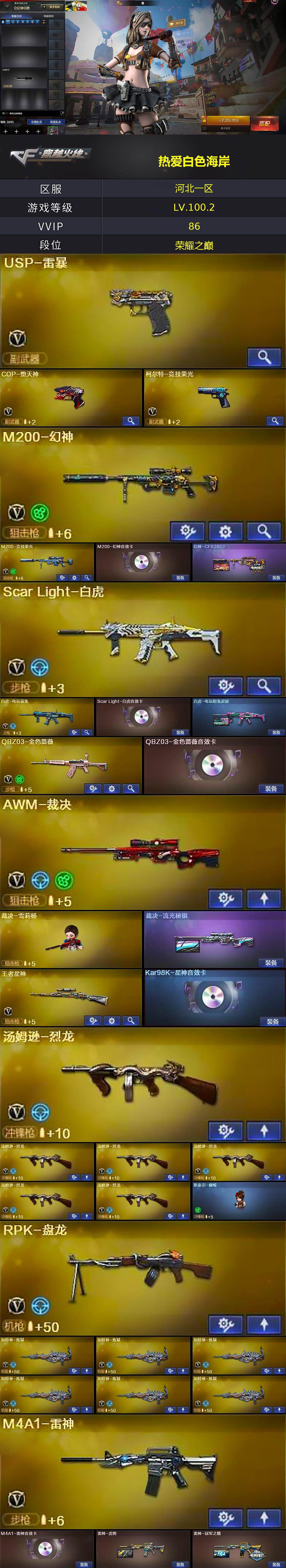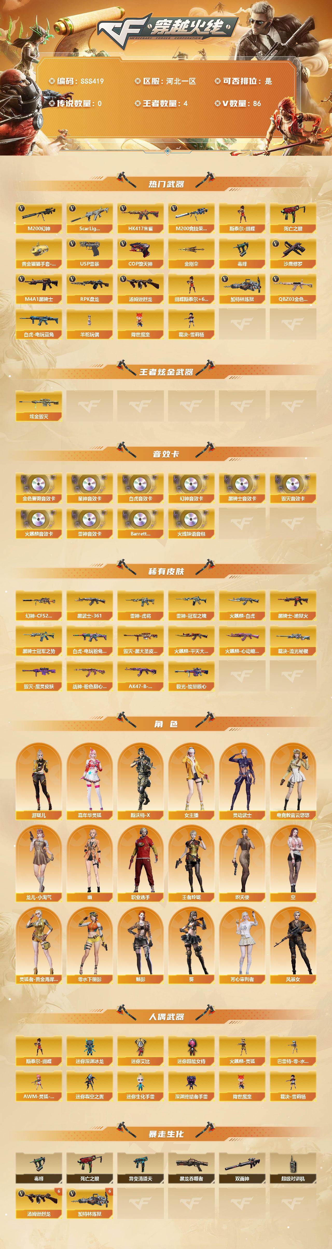 [18029788]河北一区-90V-4王者武器数-1炫金武器数 【热门武器】:QBZ03-金色蔷薇,Scar Light-白虎,HK417-朱雀,M200-幻神,M200-竞技荣光,死亡之眼,白虎-电玩蓝兔,毒蜂,M4A1-黑骑士,汤姆逊-烈龙*6,RPK-盘龙,加特林-炼狱*6,斯泰尔-蝴蝶,羊驼玩偶*2,降世魔童,裁决-雪莉杨,USP-雷暴,COP-堕天神,沙鹰-修罗,黄金猫猫手套-白鲨,金刚伞 【王者炫金武器】:炫金毁灭 【音效卡】:M200-幻神音效卡,AK47-火麒麟音效卡,M4A1-雷神音效卡,M4A1-黑骑士音效卡,Barrett-毁灭音效卡,QBZ03-金色蔷薇音效卡,Scar Light-白虎音效卡,Kar98K-星神音效卡,Barrett-碧霄极光音效卡,火线妹语音包 【皮肤】:幻神-CFS2022,白虎-电玩粉兔皮肤,裁决-流光秘银,雷神-虎将,雷神-冠军之魄,火麒麟-平天大圣,火麒麟-白虎,火麒麟-心动糖果,毁灭-黑大圣皮肤,毁灭-魔灵皮肤,黑骑士-冠军之势,黑骑士-地狱火,AK47-黑武士-361,战神-粉色甜心皮肤*2,AK47-B-常胜将军-曹操,极光-能量核心 【角色】:葵,魅影,电竞教官-云悠悠,王者玲珑,炽天使,空,芳心审判者,风暴女,嘉年华灵狐,灵动武士,零-水下丽影,灵狐者-黄金海岸,龙儿-小淘气,女主播,斯沃特-X,幽,游珑儿,职业选手 【人偶武器】:裁决-雪莉杨,火麒麟-灵狐,斯泰尔-蝴蝶,巴雷特-零-水下丽影,AWM-灵狐-15周年嘉年华,迷你深渊冰龙,迷你裂空之翼*5,迷你生化手雷*3,深渊终结者手雷,迷你艾比,迷你超能女侍,降世魔童 【暴走生化】:毒蜂,异变清道夫,黑龙吞噬者,双面神,死亡之眼,超级对讲机 【挑战大师】:暴君乱世-超越Max,VEPR-12-金魔,机甲撕裂者III,神圣爆裂者-末日III,阐释者III 【英雄级武器】:AK47-火麒麟*3,M4A1-黑龙,M4A1-雷神,M4A1-黑骑士,AK47-黑武士,AN94-超新星,M4A1-武圣,HK417-朱雀,Scar Light-白虎,无影-神兵利器,黑武士-锦绣游龙,QBZ03-金色蔷薇,M4A1-猎神,9A91-烈火,王者之势-觉醒版,王者炎心-觉醒版,白虎-电玩蓝兔,AWM-天龙,Barrett-毁灭*4,AWM-裁决,M200-幻神,Barrett-朱雀,M2