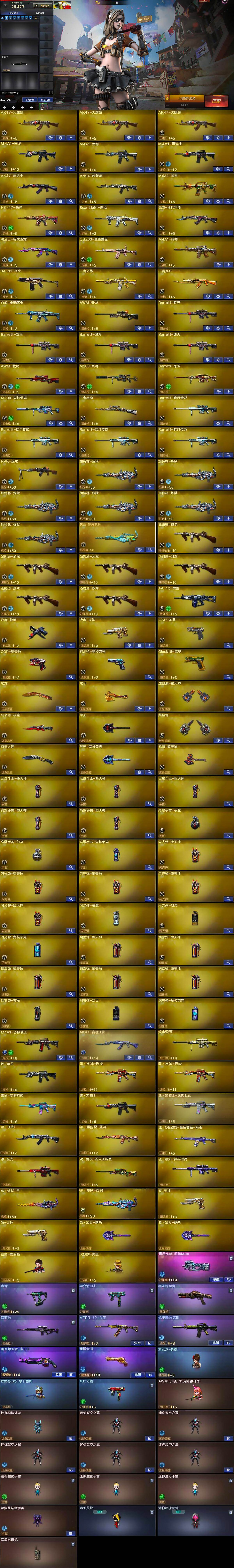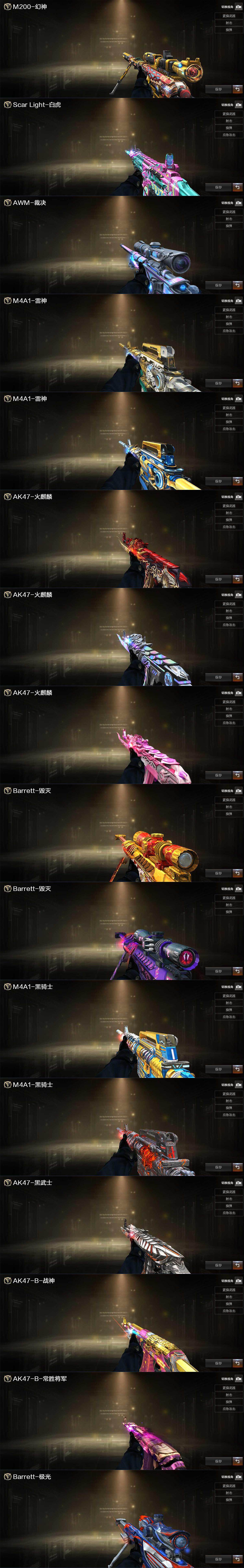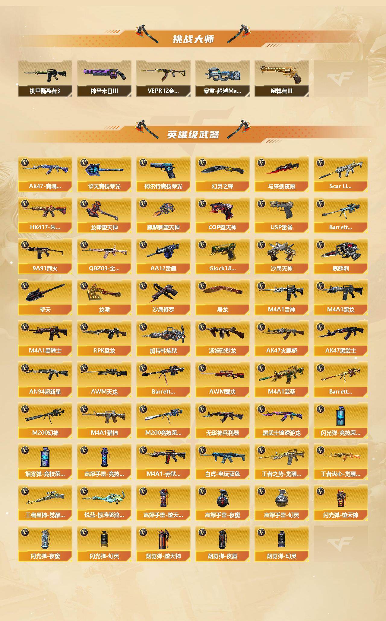 【英雄级武器】:AK47-火麒麟*3,M4A1-黑龙,M4A1-雷神,M4A1-黑骑士,AK47-黑武士,AN94-超新星,M4A1-武圣,HK417-朱雀,Scar Light-白虎,无影-神兵利器,黑武士-锦绣游龙,QBZ03-金色蔷薇,M4A1-猎神,9A91-烈火,王者之势-觉醒版,王者炎心-觉醒版,白虎-电玩蓝兔,AWM-天龙,Barrett-毁灭*4,AWM-裁决,M200-幻神,Barrett-朱雀,M2