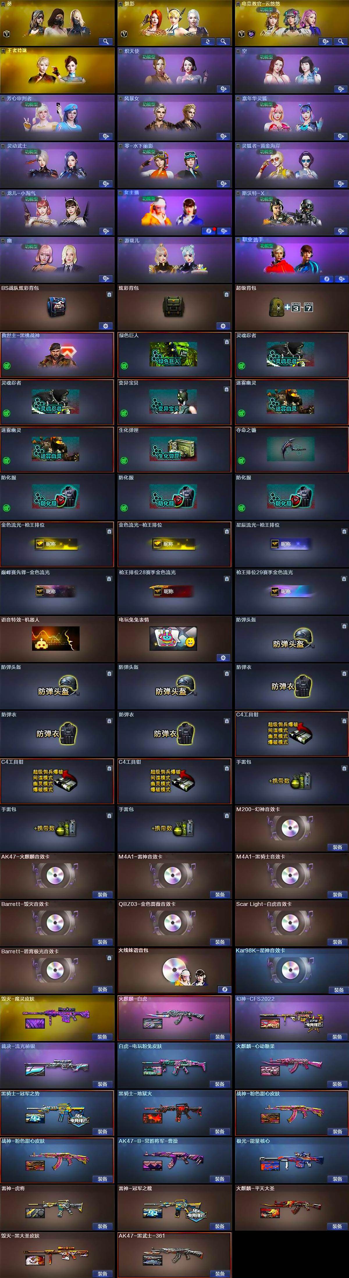 【音效卡】:M200-幻神音效卡,AK47-火麒麟音效卡,M4A1-雷神音效卡,M4A1-黑骑士音效卡,Barrett-毁灭音效卡,QBZ03-金色蔷薇音效卡,Scar Light-白虎音效卡,Kar98K-星神音效卡,Barrett-碧霄极光音效卡,火线妹语音包