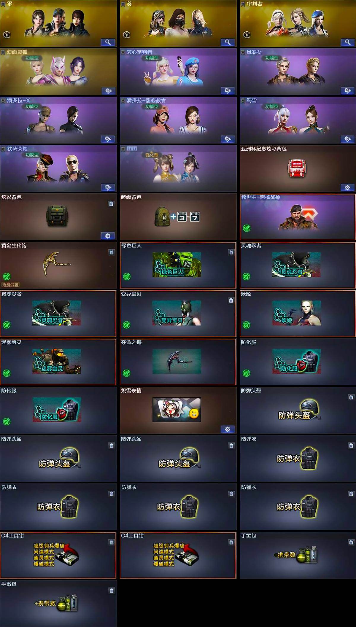 【道具】:亚洲杯纪念炫彩背包,炫彩背包,超级背包,救世主-黑桃战神,黄金生化钩,绿色巨人,灵魂忍者*2,变异宝贝,妖姬,迷雾幽灵,夺命之镰,防化服*2,炽雪表情,防弹头盔*3,防弹衣*4,C4工具钳*2,手雷包*2