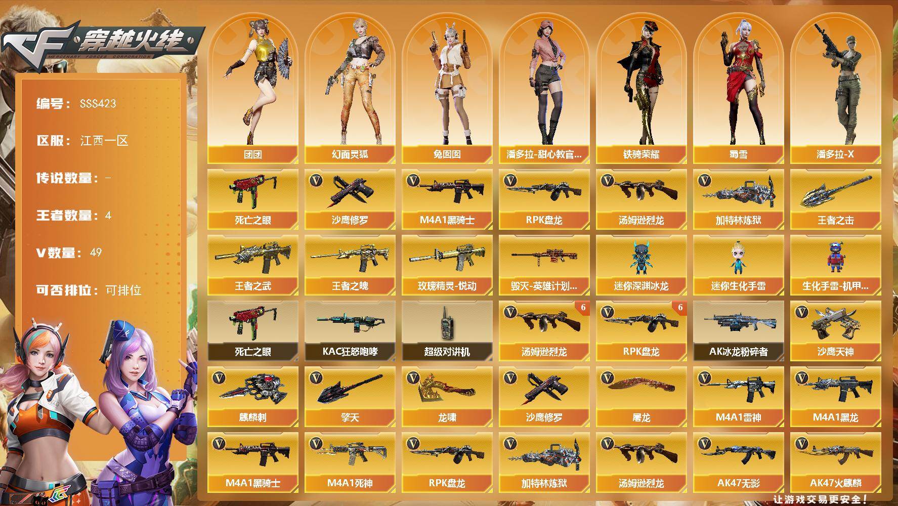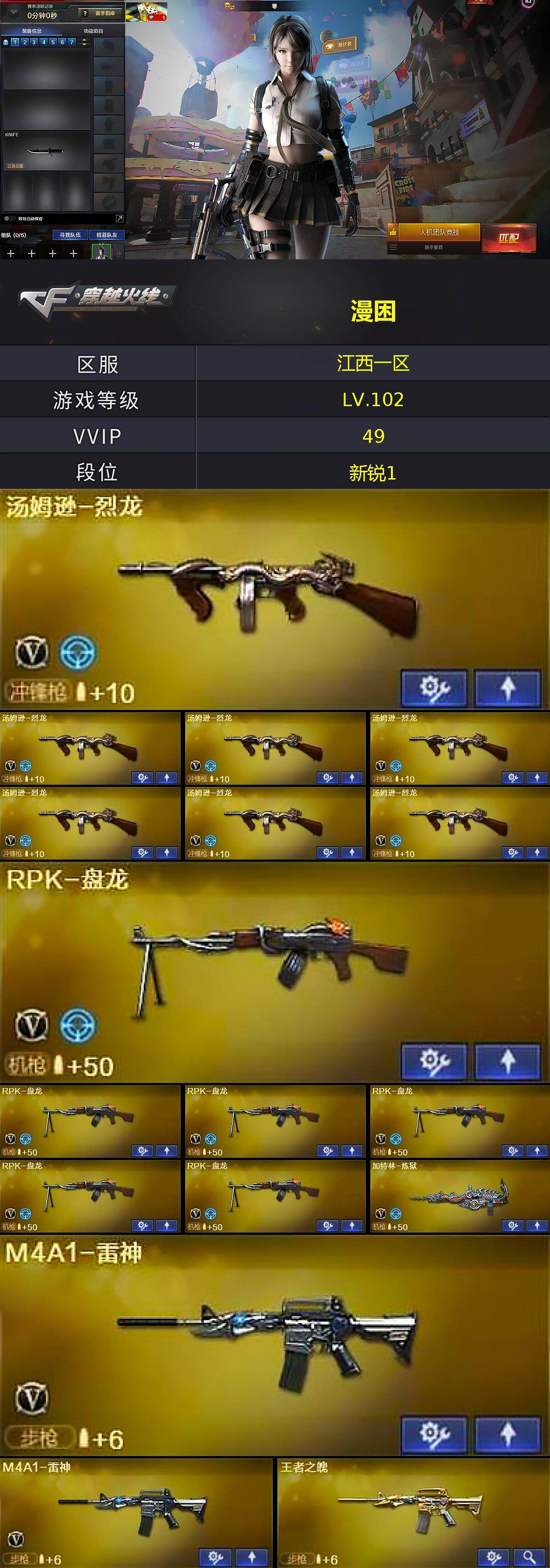 [18029966]江西一区-50V-4王者武器数-0炫金武器数 【热门武器】:死亡之眼,M4A1-黑骑士*2,汤姆逊-烈龙*7,RPK-盘龙*6,加特林-炼狱,沙鹰-修罗*3 【王者炫金武器】:王者之武,玫瑰精灵-悦动,王者之魄,王者之击 【皮肤】:毁灭-英雄计划 皮肤 【角色】:零,葵,审判者,幻面灵狐,芳心审判者,风暴女,潘多拉-X,潘多拉-甜心教官,蜀雪,铁骑荣耀,兔囡囡,团团 【人偶武器】:迷你深渊冰龙,迷你生化手雷,生化手雷-机甲核心 【暴走生化】:KAC-狂怒咆哮,死亡之眼,超级对讲机 【挑战大师】:AK47-冰龙粉碎者 【英雄级武器】:M4A1-千变,AK47-火麒麟*3,M4A1-黑龙,M4A1-雷神*2,M4A1-黑骑士*2,AK47-无影,M4A1-死神,AK47-黑武士,AN94-超新星,AWM-天龙,Barrett-毁灭,Barrett-极光,RPK-盘龙*6,加特林-炼狱,汤姆逊-烈龙*7,沙鹰-修罗*3,沙鹰-天神*4,屠龙,龙啸*2,擎天*4,麒麟刺 【源级武器】:源-千变,源·火麒麟,源·雷神*3,魂·M4A1-雷神-化蛇*2,魂·雷神-诺拉,魂·雷神-新春神龙,御·雷神-烈虎,源·黑骑士,魂·黑骑士-破浪10年,御·黑骑士·哪吒闹海,灵·黑骑士-破界 I,源·AK47-黑武士,魂·黑武士-锋芒破茧,源·武圣*2,源·机械迷城,源·青龙,源·HK417-朱雀,源-金色蔷薇*2,魂·QBZ03-金色蔷薇-萌杀,魂·9A91·烈火-电子连击*2,魂·玫瑰精灵-傲梅,魂·天龙-彼岸花,魂·裁决-羽掣,源·毁灭,魂·毁灭-秦师,御·毁灭-黑大圣,御·毁灭-葫芦兄弟,魂·Barrett-朱雀-锦鲤,魂·Barrett-朱雀- 新春神龙,源·Barrett-朱雀,灵·Barrett-朱雀-炫光,魂·炼狱-玩具枪,魂·天神-宇航兔兔,源·武圣glock,魂·擎天-蒸汽钟表,魂·龙啸-秦师 【道具】:亚洲杯纪念炫彩背包,炫彩背包,超级背包,救世主-黑桃战神,黄金生化钩,绿色巨人,灵魂忍者*2,变异宝贝,妖姬,迷雾幽灵,夺命之镰,防化服*2,炽雪表情,防弹头盔*3,防弹衣*4,C4工具钳*2,手雷包*2 【特殊枪械】:2黑骑士,6烈龙,6盘龙,1炼狱