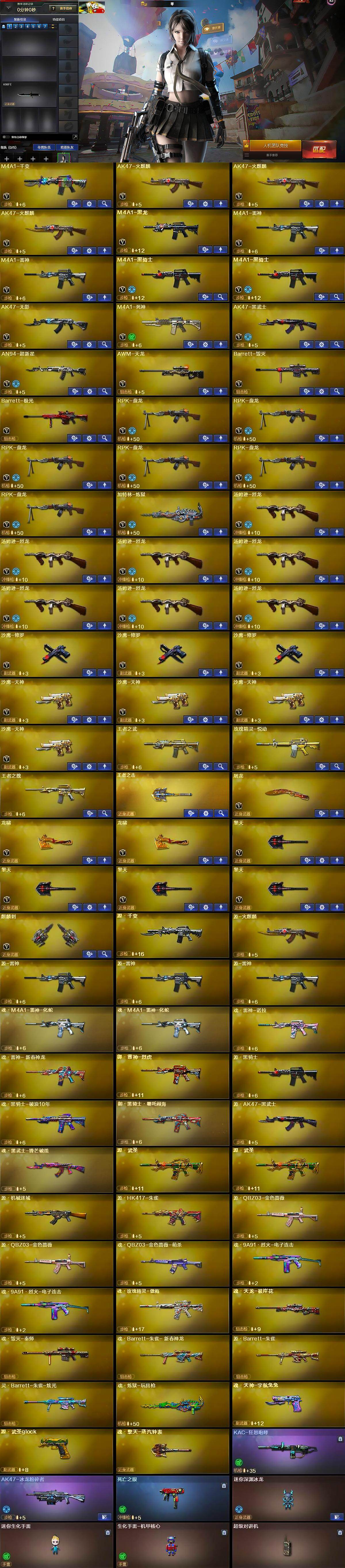 【源级武器】:源-千变,源·火麒麟,源·雷神*3,魂·M4A1-雷神-化蛇*2,魂·雷神-诺拉,魂·雷神-新春神龙,御·雷神-烈虎,源·黑骑士,魂·黑骑士-破浪10年,御·黑骑士·哪吒闹海,灵·黑骑士-破界 I,源·AK47-黑武士,魂·黑武士-锋芒破茧,源·武圣*2,源·机械迷城,源·青龙,源·HK417-朱雀,源-金色蔷薇*2,魂·QBZ03-金色蔷薇-萌杀,魂·9A91·烈火-电子连击*2,魂·玫瑰精灵-傲梅,魂·天龙-彼岸花,魂·裁决-羽掣,源·毁灭,魂·毁灭-秦师,御·毁灭-黑大圣,御·毁灭-葫芦兄弟,魂·Barrett-朱雀-锦鲤,魂·Barrett-朱雀- 新春神龙,源·Barrett-朱雀,灵·Barrett-朱雀-炫光,魂·炼狱-玩具枪,魂·天神-宇航兔兔,源·武圣glock,魂·擎天-蒸汽钟表,魂·龙啸-秦师