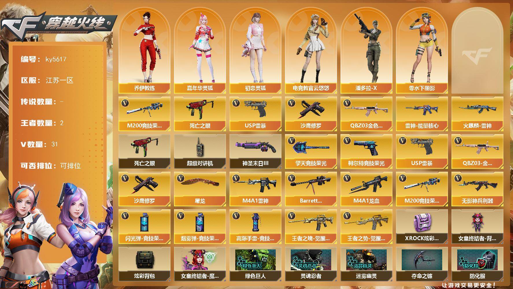 [18030150]【ky5617】江苏一区-33V-2王者武器数-0炫金武器数 【热门武器】:QBZ03-金色蔷薇,M200-竞技荣光,死亡之眼,USP-雷暴,沙鹰-修罗 【皮肤】:雷神-能量核心,火麒麟-雷神 【角色】:电竞教官-云悠悠,乔伊教练,初恋灵狐,嘉年华灵狐,零-水下丽影,潘多拉-X 【暴走生化】:死亡之眼,超级对讲机 【挑战大师】:神圣爆裂者-末日III 【英雄级武器】:M4A1-雷神,M4A1-龙血,无影-神兵利器,QBZ03-金色蔷薇,王者之魄-觉醒版,王者之势-觉醒版,Barrett-毁灭,M200-竞技荣光,沙鹰-修罗,USP-雷暴,柯尔特-竞技荣光*2,屠龙,擎天-竞技荣光,高爆手雷-竞技荣光*5,闪光弹-竞技荣光*5,烟雾弹-竞技荣光*7 【道具】:XROCK炫彩背包,女皇终结者-背包,炫彩背包,女皇终结者-魔龙之吻,绿色巨人,灵魂忍者,迷雾幽灵,夺命之镰,防化服*3,金色流光-枪王排位*2,星辰流光-枪王排位,流光-鎏金之域,枪王排位28赛季金色流光,枪王排位29赛季金色流光,EP战队名片,EP战队喷图,防弹头盔*10,防弹衣*10,C4工具钳*8,手雷包*7 【特殊枪械】: