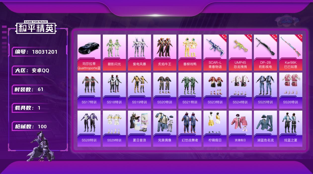 [18031201]【特价出售/店主推荐】安卓 手Q-4粉装-4特效枪-1载具-31748热力值-4王牌印记-61套装-100枪皮【粉色套装】:粉装-碧影闪光,粉装-紫电风暴,粉装-炙焰牛王,粉装-垂柳戏鸭【粉色枪皮等级】:SCAR-L-青春物语(七级),UMP45-恐龙拽拽(四级),Kar98K-巳巳如意(一级),DP-28-豹影疾电(三级)【粉色载具】:玛莎拉蒂Quattroporte(夜幕蓝)