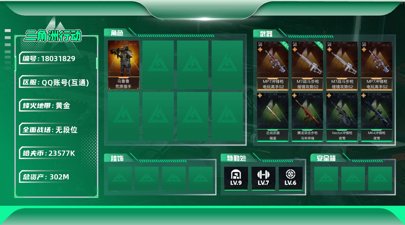 [18031829]302m总资产-23577k哈夫币-60烽火等级-黄金-1战场等级-无军衔 【干员外观】:乌鲁鲁-荒原猎手,蛊-不羁人生 【近战皮肤】:近战-暗星,近战-黑鹰 【典藏外观】:M7战斗步枪-棱镜攻势S2,MP7冲锋枪-电玩高手S2 【典藏外观成色】:M7战斗步枪-棱镜攻势S2(优品B),MP7冲锋枪-电玩高手S2(优品A) 【传说外观】:K416突击步枪-行动记录,SG552突击步枪-点翠,SCAR-H战斗步枪-荼蘼,腾龙突击步枪-马年祥瑞,腾龙突击步枪-万金泪冠,KC17突击步枪-点翠,MK47突击步枪-暗星,Vector冲锋枪-夜莺,SR-3M紧凑突击步枪-暗星,SR-3M紧凑突击步枪-荼蘼,勇士冲锋枪-万金泪冠,MK4冲锋枪-夜莺,PKM通用机枪-荼蘼,Mini-14射手步枪-夜莺,M14射手步枪-蛮荒,PSG-1射手步枪-点翠,AWM狙击步枪-万金泪冠,G18-马年祥瑞 【史诗外观】:K416突击步枪-腊梅,腾龙突击步枪-猎鳄行动,K437突击步枪-丛影谍踪,MP5冲锋枪-深海恐惧,SR-3M紧凑突击步枪-开工大吉,勇士冲锋枪-丛影谍踪,MP7冲锋枪-六套之力,M249轻机枪-丛影谍踪,M250通用机枪-囚徒,VSS射手步枪-丛影谍踪, M14射手步枪-航天庆典 【稀有外观】:SG552突击步枪-马年新春,SG552突击步枪-贴花艺术, AK-12突击步枪-马年新春,SCAR-H战斗步枪-荣耀列队,CAR-15突击步枪-来财,KC17突击步枪-来财,MP5冲锋枪-弄臣,SMG-45冲锋枪-行动开启,SR-3M紧凑突击步枪-马年新春,勇士冲锋枪-冰天雪地,Mini-14射手步枪-荣耀列队,Mini-14射手步枪-来财,SKS射手步枪-弄臣,QSZ92G-一帆风顺 【普通外观】:SCAR-H战斗步枪-纯白涂装*2,M700狙击步枪-纯白涂装*2,SG552突击步枪-彩墨涂鸦,SKS射手步枪-彩墨涂鸦,M4A1突击步枪-高雅黑,M4A1突击步枪-海色,QBZ95-1突击步枪-海色,K416突击步枪-几何迷彩,K416突击步枪-高雅黑,K416突击步枪-重击,M7战斗步枪-红色涂装,M7战斗步枪-重击,SG552突击步枪-狂欢,SCAR-H战斗步枪-数码迷彩,PTR-32突击步枪-典雅,CAR-15突击步枪-狂欢,AS Val突击步枪-黑巧甜心,MP5冲锋枪-典雅,
