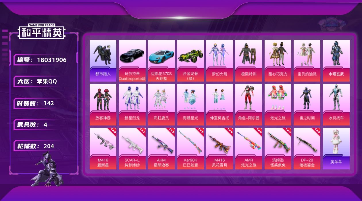 - [15419748]【特价出售/店主推荐】苹果 手Q-2神装-12粉装-6特效枪-1僚机-7载具-3粉色飞行器-32440热力值-2王牌印记-40套装-54枪皮 【红色神装等级】:最终圣卫者-帕修斯(一级),辉羽雀灵-初翊(三级) 【红色角色神装】:最终圣卫者-帕修斯,辉羽雀灵-初翊 【粉色套装】:粉装-齐天大圣,角色-凤凰座 一辉,角色-仙女座 瞬,角色-天鹅座 冰河,角色-天龙座 紫龙,角色-天马座 星矢,角色-智慧纱织,粉装-星穹咏叹调,角色-狂魅哈莉,角色-狂魇小丑,角色-冷漠罗丽,角色-天穹 【粉色枪皮等级】:AUG-圣斗士星矢(三级),UZI-圣斗士星矢(三级),Vector-最终圣卫者(三级),AKS-74U-星穹咏叹调(四级),Mk14-甜梦熊击(五级),MG3-辉羽雀灵(三级) 【粉色载具】:宝马i8(离子银),宝马M4(圣保罗黄),宝马X6 M(曼岛绿),迈凯伦塞纳(冷萃蓝),虚妄之影(炫耀紫),最终圣卫者摩托车,僚机-萌兔起飞,辉羽雀灵自行车 【粉色枪皮】:AUG-圣斗士星矢,UZI-圣斗士星矢,Vector-最终圣卫者,AKS-74U-星穹咏叹调,Mk14-甜梦熊击,MG3-辉羽雀灵 【粉色飞行器】:繁龙极客飞行器,雀灵庇佑飞行器,终晖之翼飞行器 【粉色降落伞】:繁龙极客降落伞,星穹咏叹调降落伞,辉羽雀灵降落伞,双重狂想降落伞,最终圣卫者降落伞,冷漠罗丽降落伞,宁雨蝶降落伞 【稀有套装】:套装-小鸟芋圆,套装-粉恋花,套装-紫幽梦,套装-蓝冰羽,套装-星影赞美诗,套装-星渊小夜曲,套装-极速光影,套装-彩虹兔,套装-云朵鹅,套装-雪绒豹,套装-诡诞巡游,套装-混沌火种,角色-时希公主 【稀有枪皮】:M16A4-最终圣卫者,M416-红色方程式,AUG-耀粉歌者,M762-萌物绒绒,M762-云朵鹅,G36C-星穹咏叹调,蜜獾-天降萌叽,蜜獾-御兔特攻,UZI-啾咪啾咪,UMP45-生命誓言,野牛-最终圣卫者,AKS-74U-辉羽雀灵,P90-宁雨蝶,Kar98k-最终圣卫者,Kar98K-星穹咏叹调,M24-歌者泠鸢,Mini14-辉羽雀灵,M200-爆裂游戏,SVD-云朵鹅,SVD-冷漠罗丽,DBS-幻彩电音,SPAS-12-云朵鹅,M249-糯团青竹,DP-28-御兔特攻,短管霰弹-星穹咏叹调,沙漠之鹰-云朵鹅,爆炸猎弓-圣斗士星矢,大砍刀-云朵鹅,撬棍-