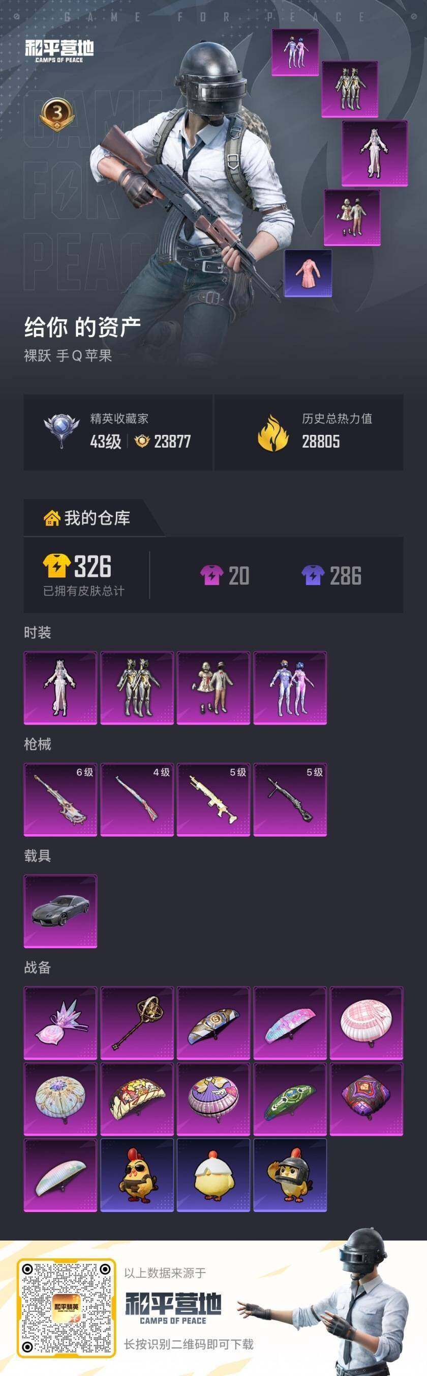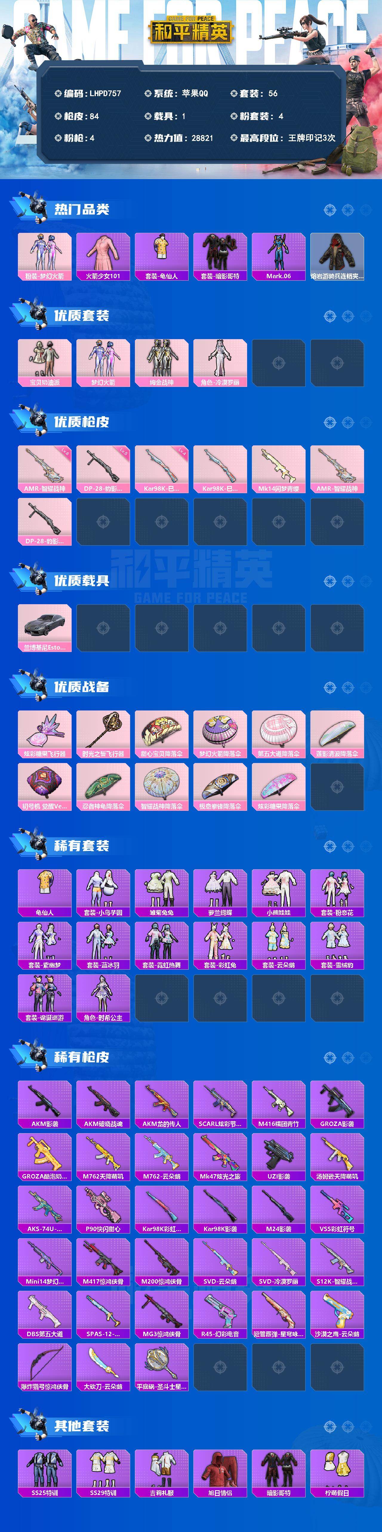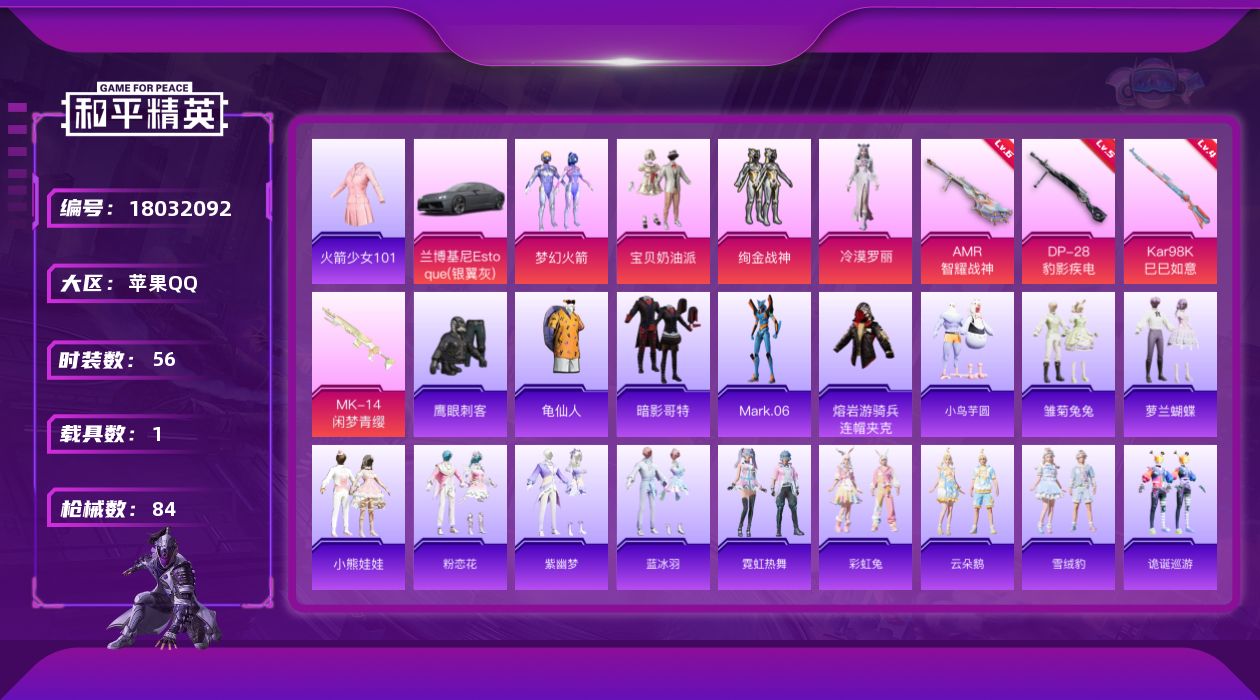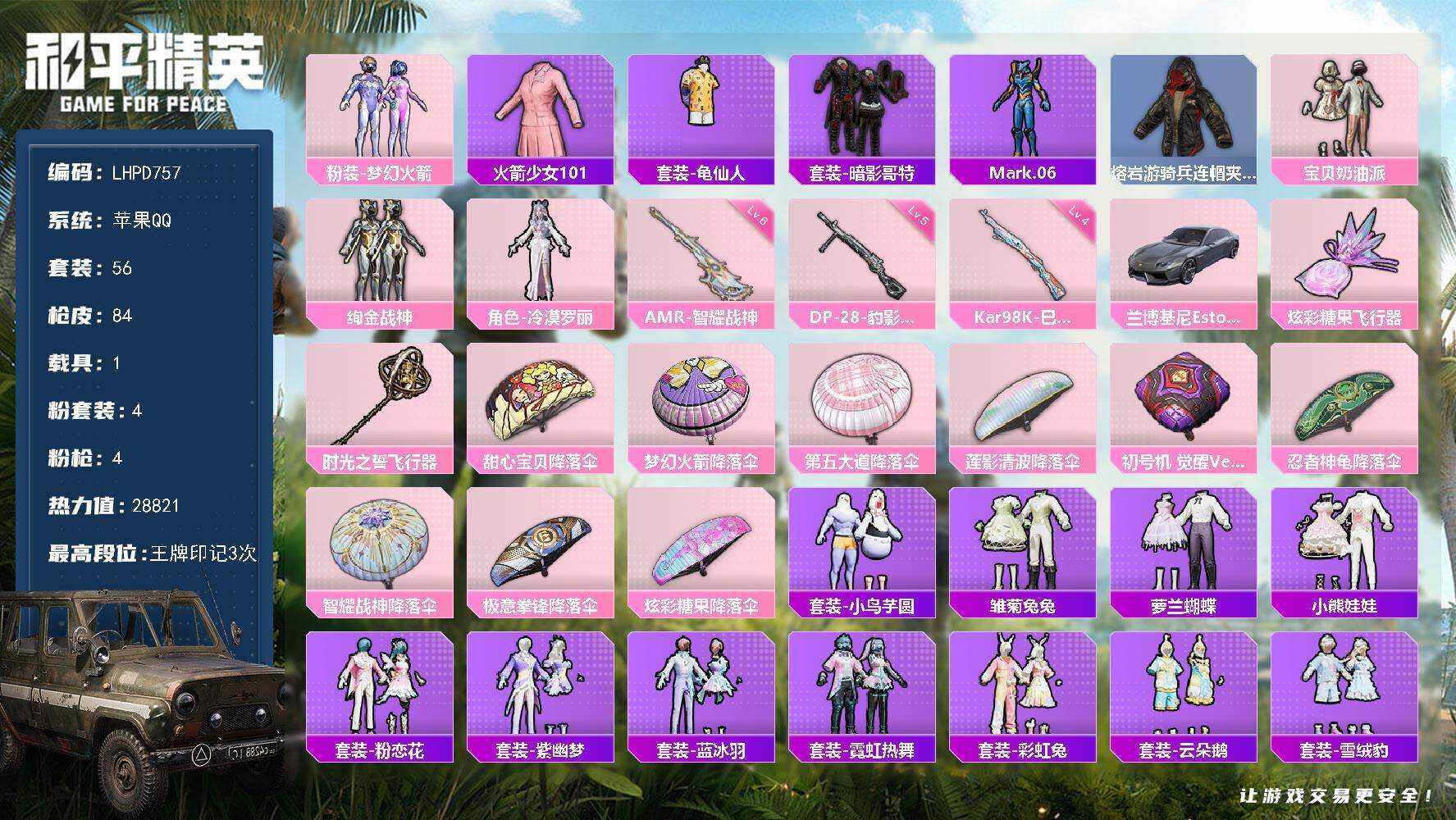 [18032092]老101【店主推荐捡漏号!可直接换绑】苹果 手Q-4粉装-4特效枪-1载具-2粉色飞行器-28821热力值-3王牌印记-56套装-84枪皮【热门品类】:粉装-梦幻火箭,套装-火箭少女101,套装-龟仙人,套装-暗影哥特,角色-Mark.06,熔岩游骑兵连帽夹克【粉色套装】:粉装-宝贝奶油派,粉装-梦幻火箭,粉装-绚金战神,角色-冷漠罗丽【粉色枪皮等级】:Kar98K-巳巳如意(四级),AMR-智耀战神(六级),DP-28-豹影疾电(五级)【粉色载具】:兰博基尼Estoque(银翼灰)【粉色枪皮】:Kar98K-巳巳如意,Mk14-闲梦青缨,AMR-智耀战神,DP-28-豹影疾电【粉色飞行器】:炫彩糖果飞行器,时光之誓飞行器