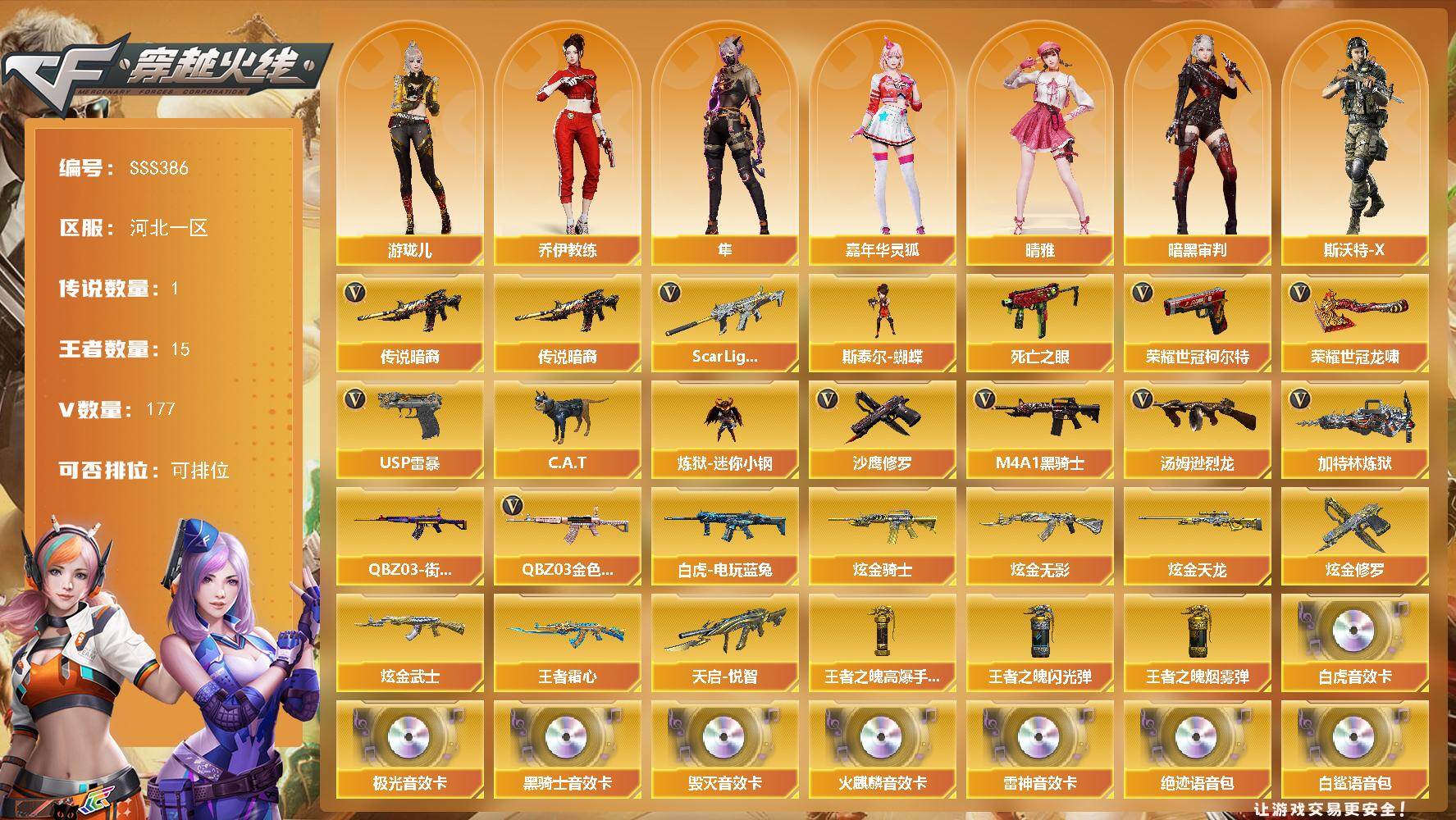 [18032122]河北一区-183V-15王者武器数-5炫金武器数 【传说武器】:传说暗裔 【热门武器】:传说暗裔,QBZ03-金色蔷薇,Scar Light-白虎,死亡之眼,白虎-电玩蓝兔,QBZ03-街机,荣耀世冠-柯尔特,C.A.T,炼狱-迷你小钢,M4A1-黑骑士,汤姆逊-烈龙*5,加特林-炼狱,斯泰尔-蝴蝶*2,USP-雷暴*2,沙鹰-修罗*2,荣耀世冠-龙啸 【王者炫金武器】:天启-悦智,王者霜心,王者之魄高爆手雷*3,王者之魄闪光弹*3,王者之魄烟雾弹,炫金骑士,炫金无影,炫金武士,炫金天龙,炫金修罗 【音效卡】:天神-动感闪耀 音效卡,AK47-火麒麟音效卡,M4A1-雷神音效卡,M4A1-黑骑士音效卡,Barrett-毁灭音效卡,Barrett-极光音效卡,Scar Light-白虎音效卡,绝迹语音包,白鲨语音包 【皮肤】:雷神-暗月,雷神-荣耀之魄,雷神-星空,M4A1-雷神-CFS 2019,雷神-航星皮肤,火麒麟-雷神,火麒麟-冠军之心,传奇石头-横秒之巅,火麒麟-平天大圣,火麒麟-心动糖果,毁灭-荣耀之怒,毁灭耀金皮肤,毁灭-星空,毁灭-冠军之怒,毁灭-AG-CFPLS15冠军,毁灭-黑大圣皮肤,战神-紫绶金章皮肤*4,战神-流金岁月皮肤*3,AK47-B-常胜将军-曹操,AK47-B-常胜将军-刘备,AK47-B-常胜将军-孙权*2,AWM-天龙-传奇70KG*4,AWM-天龙-传奇白鲨,修罗-冠军之魂,屠龙-荣耀之锋 【角色】:葵,樱,魅影,炫,春,迷迭香,晴雅,隼,审判者,王者之瞳,王者玲珑,王者-魅影,王者-迷迭香,乔伊教练,暗夜-X,暗夜审判,初恋灵狐,风暴女,嘉年华灵狐,零-水下丽影,灵狐者-X,灵狐者-黄金海岸,曼陀罗-X,潘多拉-X,潘多拉-甜心教官,斯沃特-X,铁骑荣耀,新娜塔莎,影武者-X,游珑儿,职业选手,雅典娜 【人偶武器】:炼狱-迷你小钢,斯泰尔-蝴蝶*2,AWM-灵狐-15周年嘉年华*2,COP-旗袍,C.A.T,迷你牛牛*2,闪光弹-小乔,闪光弹-貂蝉,高爆手雷-大乔,迷你超能女侍,灵狐娃娃手雷 【暴走生化】:死亡之眼,超级对讲机 【挑战大师】:冰龙粉碎者-白马银枪,激光毁灭者III*2,神圣爆裂者-末日III,阐释者III 【英雄级武器】:M4A1-千变,AK47-火麒麟*4,M4A1-黑龙,M4A1-雷神*3,M4A1-黑