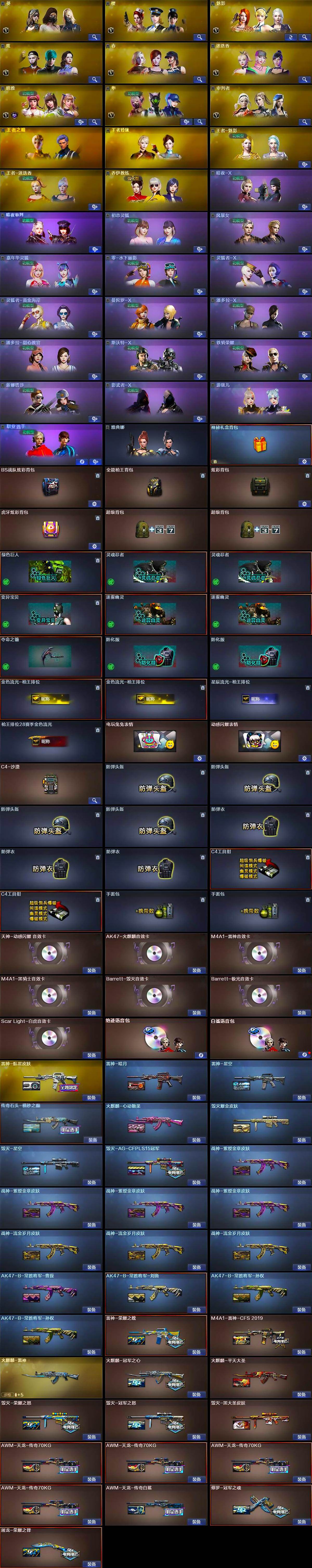 【皮肤】:雷神-暗月,雷神-荣耀之魄,雷神-星空,M4A1-雷神-CFS 2019,雷神-航星皮肤,火麒麟-雷神,火麒麟-冠军之心,传奇石头-横秒之巅,火麒麟-平天大圣,火麒麟-心动糖果,毁灭-荣耀之怒,毁灭耀金皮肤,毁灭-星空,毁灭-冠军之怒,毁灭-AG-CFPLS15冠军,毁灭-黑大圣皮肤,战神-紫绶金章皮肤*4,战神-流金岁月皮肤*3,AK47-B-常胜将军-曹操,AK47-B-常胜将军-刘备,AK47-B-常胜将军-孙权*2,AWM-天龙-传奇70KG*4,AWM-天龙-传奇白鲨,修罗-冠军之魂,屠龙-荣耀之锋