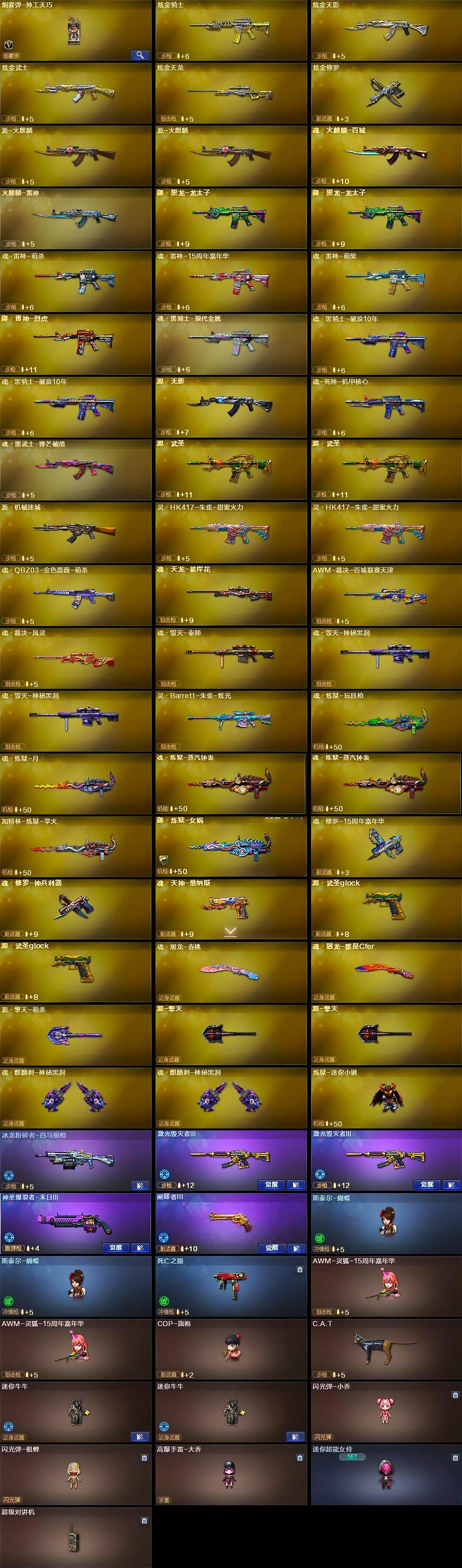 - [16319226]北方大区-21V-0王者-0炫金 【热门武器】:QBZ03-金色蔷薇,M200-幻神,羊驼玩偶,沙鹰-修罗 【音效卡】:AK47-火麒麟音效卡,Barrett-毁灭音效卡,Barrett-碧霄极光音效卡*6,白虎-盛典舞曲音效卡,炼狱-百战金芒-庆典舞曲音效卡,柯尔特-百战金芒-庆典舞曲音效卡 【皮肤】:幻神-动感闪耀 皮肤,幻神-电竞之星 皮肤,金色蔷薇-电竞之星 皮肤,雷神-暗月,雷神-源计划2.0专属 皮肤,M4A1-再燃火线,火麒麟-雷神,火麒麟-心动糖果,AK47-火麒麟-百城23冠军皮肤,毁灭-黑大圣皮肤,毁灭-虹光风暴 皮肤,毁灭-英雄计划 皮肤,黑龙-能量核心,轻型军用手斧-再燃火线 【角色】:战地猎狐,蛇隐宗,奇洋探员,乔伊教练,修道士,云海玲珑,初恋灵狐,电竞少女,芳心审判者,飞虎队-X,风暴女,嘉年华灵狐,猎狐者-追月,0号玩家,零-水下丽影,灵狐者-黄金海岸,龙儿,麻雀,玫瑰花神,萌儿,娜塔莉娅,潘多拉-甜心教官,青霞仙子,蛇姬,斯沃特-X,兔囡囡,樱-战斗天使,影武者-X,幽,游珑儿 【人偶武器】:AWM-灵狐-15周年嘉年华,迷你牛牛*2,生化手雷-机甲核心*2,灵狐娃娃手雷 【暴走生化】:黑龙吞噬者,超级对讲机 【挑战大师】:冰龙粉碎者-白马银枪*2,激光毁灭者III-白马银枪,神圣爆裂者-末日III 【英雄级武器】:AK47-火麒麟,M4A1-雷神,无影-神兵利器,黑武士-锦绣游龙,QBZ03-金色蔷薇,Barrett-毁灭,M200-幻神,炼狱-百战金芒,沙鹰-修罗,麒麟刺-百战金芒,高爆手雷-古蛇迷踪,闪光弹-幻灵,烟雾弹-幻灵,烟雾弹-古蛇迷踪,M4A1-赤狱骑士,M4A1-苍鸣雷神,Barrett-碧霄极光 【道具】:CFS限定背包,亚洲杯纪念炫彩背包,全能枪王背包,冰冰企鹅背包,女皇终结者-背包,百战金芒炫彩背包,超级背包,女皇终结者-魔龙之吻,救世主-黑桃战神,绿色巨人,灵魂忍者*2,变异宝贝,妖姬*2,迷雾幽灵*2,夺命之镰,防化服*3,金色流光-枪王排位*2,星辰流光-枪王排位,巅峰赛先锋-金色流光,流光-鎏金之域,流光-再燃火线,枪王排位28赛季金色流光,枪王排位29赛季金色流光,语音特效-盛典烟火,蛇隐宗表情,萌萌小葵表情,热带奇洋表情,动感闪耀表情,云海游龙表情,防弹头盔*3,防弹衣*3,C4工具钳*3,手雷包