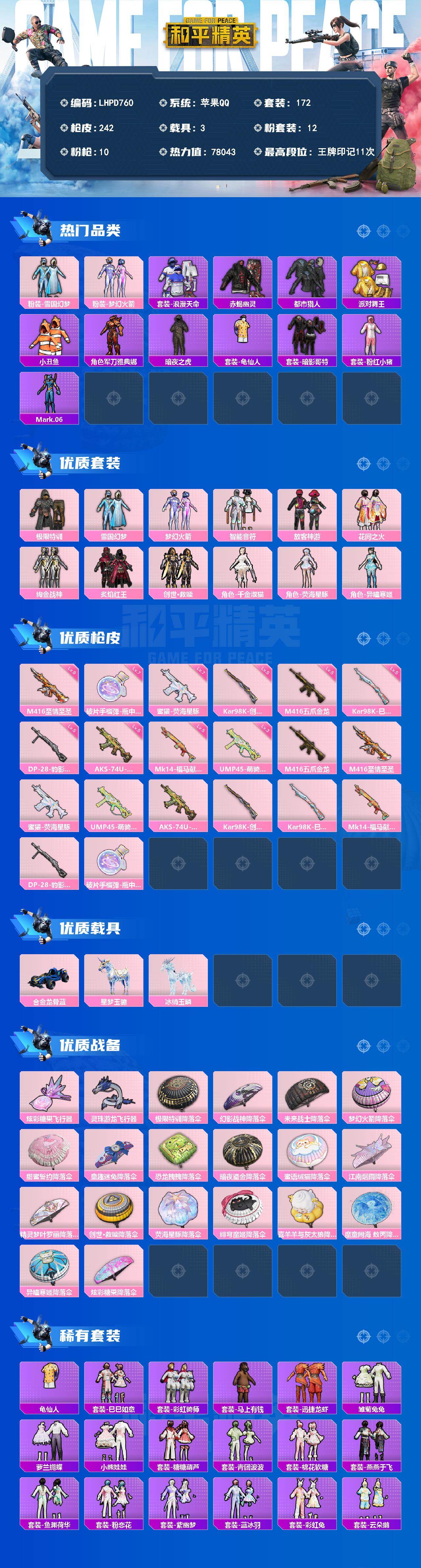 [18032055]小素材号,地铁满天赋!【店主推荐捡漏号!可直接换绑】苹果 手Q-12粉装-10特效枪-3载具-3粉色飞行器-78043热力值-11王牌印记-172套装-242枪皮 【热门品类】:粉装-雪国幻梦,粉装-梦幻火箭,套装-浪漫天命,套装-赤蝎幽灵,套装-都市猎人,套装-派对舞王,套装-小丑鱼,角色-军刀雅典娜,套装-暗夜之虎,套装-龟仙人,套装-暗影哥特,套装-粉红小猪,角色-Mark.06 【粉色套装】:粉装-极限特训,粉装-雪国幻梦,粉装-梦幻火箭,粉装-智能音符,粉装-放客神游,粉装-花间之火,粉装-绚金战神,粉装-炙焰红王,套装-创世·救赎,角色-千金淑猫,角色-荧海星豚,角色-异瞳寒姬 【粉色枪皮等级】:M416-五爪金龙(五级),M416-至情至圣(九级),蜜獾-荧海星豚(七级),UMP45-萌骑冒险(三级),AKS-74U-森灵之息(五级),Kar98K-创世·救赎(五级),Kar98K-巳巳如意(五级),Mk14-福马献瑞(五级),DP-28-豹影疾电(五级),破片手榴弹-瓶中星球(七级) 【粉色载具】:合金龙骨(蓝),星梦玉骢,冰绡玉鳞 【粉色枪皮】:M416-五爪金龙,M416-至情至圣,蜜獾-荧海星豚,UMP45-萌骑冒险,AKS-74U-森灵之息,Kar98K-创世·救赎,Kar98K-巳巳如意,Mk14-福马献瑞,DP-28-豹影疾电,破片手榴弹-瓶中星球 【粉色飞行器】:炫彩糖果飞行器,灵珠游龙飞行器 【粉色降落伞】:极限特训降落伞,幻影战神降落伞,未来战士降落伞,梦幻火箭降落伞,甜蜜誓约降落伞,童趣迷兔降落伞,恐龙拽拽降落伞,暗夜鎏金降落伞,蜜语绒猫降落伞,江南烟雨降落伞,精灵梦叶罗丽降落伞,创世·救赎降落伞,荧海星豚降落伞,绯穹魔姬降落伞,喜羊羊与灰太狼降落伞,魔童闹海 敖丙降落伞,异瞳寒姬降落伞,炫彩糖果降落伞 【稀有套装】:套装-龟仙人,套装-巳巳如意,套装-炫彩糖果,套装-彩虹骑师,套装-马上有钱,套装-迅捷龙虾,套装-雏菊兔兔,套装-萝兰蝴蝶,套装-小熊娃娃,套装-糖糖葫芦,套装-青团波波,套装-棉花软糖,套装-燕燕于飞,套装-鱼渊荷华,套装-粉恋花,套装-紫幽梦,套装-蓝冰羽,套装-彩虹兔,套装-云朵鹅,套装-雪绒豹,角色-灵公主,套装-蜜露汐语,套装-蓝海鲸歌,套装-朱霞炽焰,套装-凌霄紫焰,套装-擎苍青焰,玩偶服-懒羊羊,玩