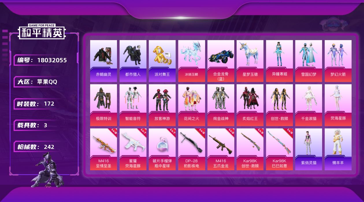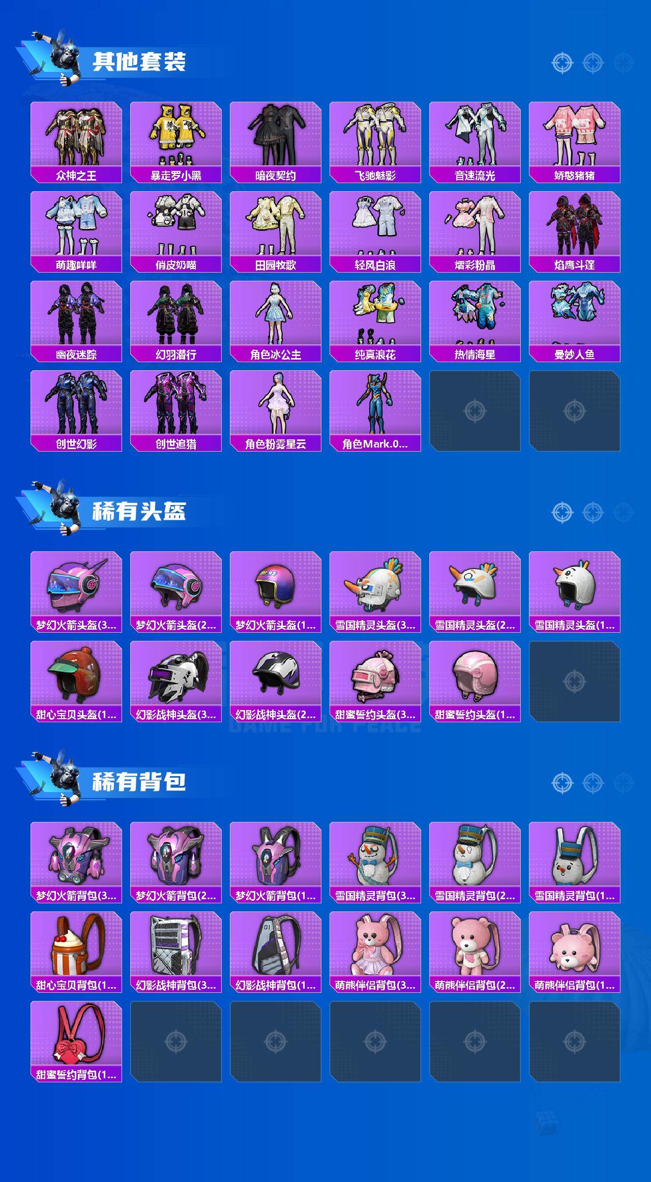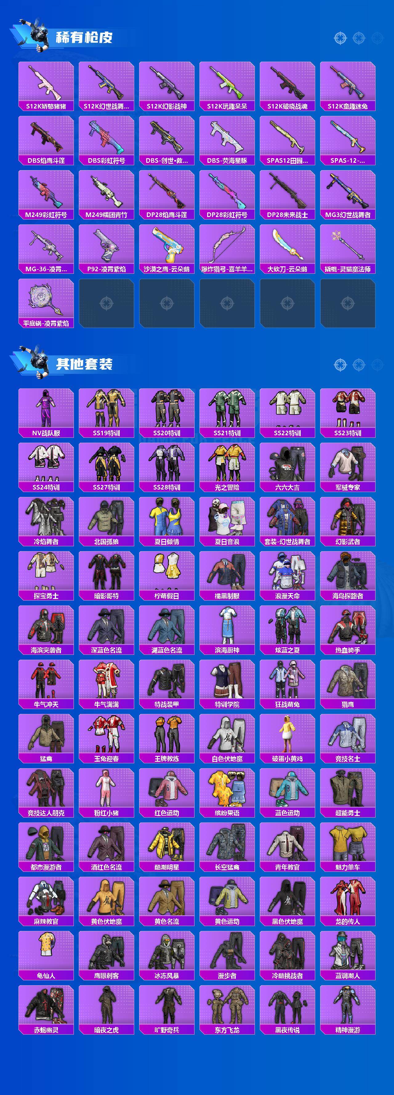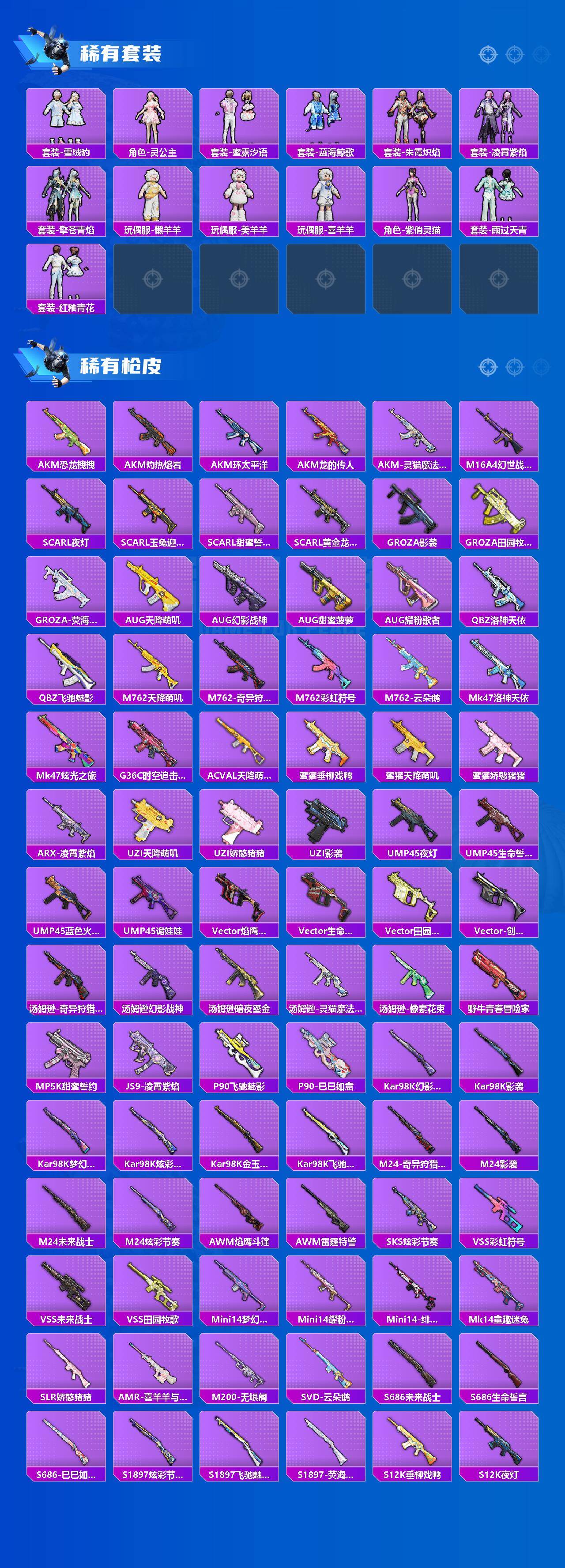 - [11689205]8特效枪 2载具 3印记 可二次 可修改实名 连体王者 优质装备:玛莎拉蒂Ghibli(蓝),玛莎拉蒂Ghibli(粉),AKM绿萝繁花,M416电玩时刻,GROZA-镜光银凌,SCAR-L金蛇镇世,MK14-盛世惊鸿,AUG-暖羊咩咩,MK14-甜梦熊击,Kar98K-巳巳如意 热门装扮:梦魇先生,东方飞龙 五级特效枪:五级GROZA-镜光银凌,五级MK14-甜梦熊击,五级AUG-暖羊咩咩,五级M416-电玩时刻,五级AKM-绿萝繁花 四级特效枪:四级Kar98K-巳巳如意 三级特效枪:三级SCAR-L金蛇镇世,三级MK14-盛世惊鸿 紫色装扮:日冕精灵,SS31特训套装,SS3特训,SS4特训,SS5特训,伏击者,冰川特警,决胜时刻,凛冬战士,北国孤狼,SS30特训套装,SS33特训套装,青涩时光,SS13特训,SS14特训,吉莉礼服,酒红色名流,酷萌兔限定,野性战魂,金鼠迎春,长空猛禽,雪山征服者,雪山精英,雷霆特警,霓虹街区,风暴特警,缤纷果语,蓝色运动,跃动心情,龙腾端午,骑行爱好者,黑色伏地魔,龙的传人,龟仙人,龙魂突击队,和平特警,沙漠兵团,圣诞大吉,坚韧舞者,夏日音浪,夜莺强袭者,怒火燎原,战地督导,攀登者,疯狂小兔子,神秘领域,甜蜜告白,空岛之星,竞技勇士朋克,红色运动,牛气冲天,灰色格斗者,灼焰舞者,热血青春,熔岩使者,牛气满满,猛禽,特战装甲,星途旅人,SS28特训,鱼渊荷华,燕燕于飞,巳巳如意,森林游猎者,竞技名士,怀庆长公主,果汁能量,惊鸿侠骨,SS25特训,锦衣飞扬,粉红小猪,焰鹰斗篷,幻羽潜行,SS27特训,萌趣绒叽,SS26特训,春光漫游,快闪甜心,智谋强哥,精神漫游,炽焰拳师,格斗专家,SS6特训,黑色刀锋,核芯基因,SS7特训,清香五月粽,拳皇97草薙京,黑夜传说,太极红客,玲珑飞花,SS8特训,星谷精灵,SS12特训,智慧之神,SS9特训,SS10特训,SS11特训,SS32特训服(SS32特训套装),恋语绒绒,忍者信条,街舞达人,WiFi精灵,冷血极客,丛林猎人,传奇侦探,特种空勤,银月精灵 优质战备:星途旅人降落伞,蜜语绒猫降落伞,盛世惊鸿降落伞,凤舞九天飞行器,临安公主降落伞,甜心宝贝降落伞,至尊龙雀降落伞,梦幻火箭降落伞