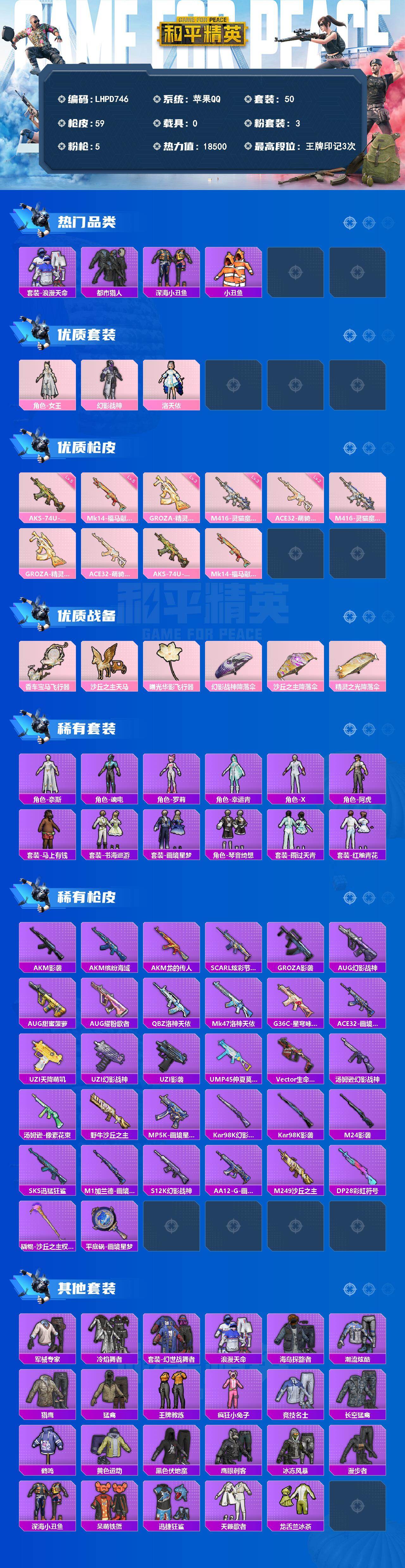 [18032366]【特价出售/店主推荐】苹果 手Q-3粉装-5特效枪-0载具-4粉色飞行器-18500热力值-3王牌印记-50套装-59枪皮 【热门品类】:套装-浪漫天命,套装-都市猎人,套装-深海小丑鱼,套装-小丑鱼 【粉色套装】:角色-女王,粉装-幻影战神,角色-洛天依 【粉色枪皮等级】:M416-灵猫魔法师(三级),GROZA-精灵之光(三级),ACE32-萌骑漫游(二级),AKS-74U-森灵之息(五级),Mk14-福马献瑞(五级) 【粉色枪皮】:M416-灵猫魔法师,GROZA-精灵之光,ACE32-萌骑漫游,AKS-74U-森灵之息,Mk14-福马献瑞 【粉色飞行器】:香车宝马飞行器,沙丘之主天马,曦光华影飞行器 【粉色降落伞】:幻影战神降落伞,沙丘之主降落伞,精灵之光降落伞 【稀有套装】:角色-奈斯,角色-魂电,角色-罗莉,角色-幸运青,角色-X,角色-阿虎,套装-马上有钱,套装-书海巡游,套装-画境星梦,套装-琴音绮想,套装-雨过天青,套装-红釉青花 【稀有枪皮】:AKM-影袭,AKM-缤纷海域,AKM-龙的传人,SCAR-L-炫彩节奏,GROZA-影袭,AUG-幻影战神,AUG-甜蜜菠萝,AUG-耀粉歌者,QBZ-洛神天依,Mk47-洛神天依,G36C-星穹咏叹调,ACE32-画境星梦,UZI-天降萌叽,UZI-幻影战神,UZI-影袭,UMP45-仲夏莫吉托,Vector-生命誓言,汤姆逊-幻影战神,汤姆逊-像素花束,野牛-沙丘之主,MP5K-画境星梦,Kar98K-幻影战神,Kar98K-影袭,M24-影袭,SKS-迅猛狂鲨,M1加兰德-画境星梦,S12K-幻影战神,AA12-G-画境星梦,M249-沙丘之主,DP-28-彩虹符号,撬棍-沙丘之主权杖,平底锅-画境星梦 【其他套装】:套装-军械专家,套装-冷焰舞者,套装-幻世战舞者,套装-浪漫天命,套装-海岛探路者,套装-潮流炫酷,套装-猎鹰,套装-猛禽,套装-王牌教练,套装-疯狂小兔子,套装-竞技名士,套装-长空猛禽,套装-鹤鸣,套装-黄色运动,套装-黑色伏地魔,套装-鹰眼刺客,套装-冰冻风暴,套装-漫步者,套装-深海小丑鱼,套装-呆萌铁蟹,套装-迅捷狂鲨,套装-天籁歌者,套装-龙舌兰冰茶 【稀有头盔】:幻影战神头盔(3级),幻影战神头盔(2级),幻影战神头盔(1级),深海小丑鱼头盔(3级),深海小丑鱼头盔(2