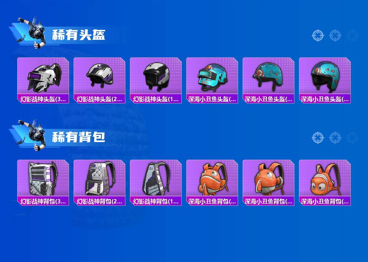 【稀有头盔】:幻影战神头盔(3级),幻影战神头盔(2级),幻影战神头盔(1级),深海小丑鱼头盔(3级),深海小丑鱼头盔(2